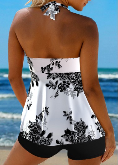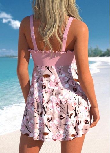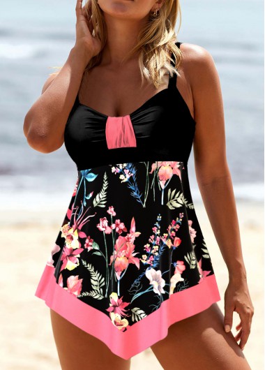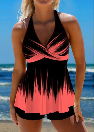 Tropical Plants Print Bowknot Coral Red Tankini Set