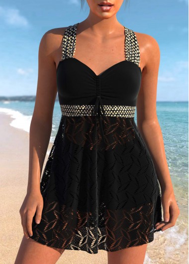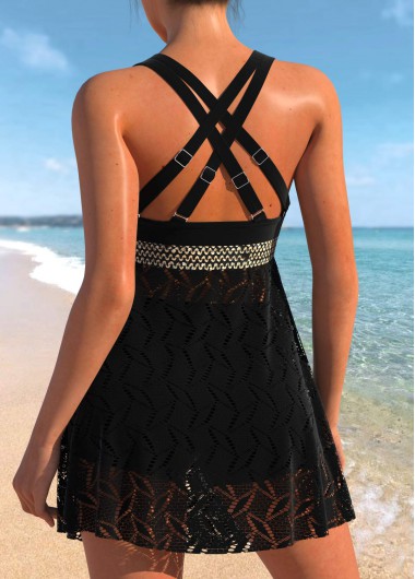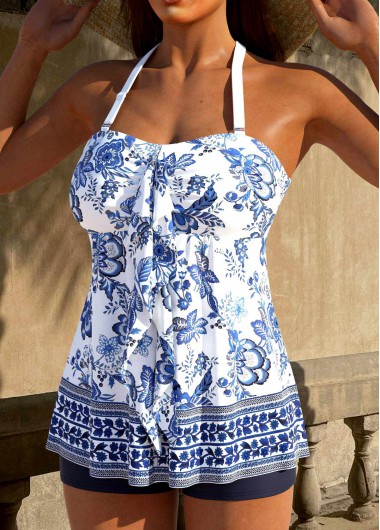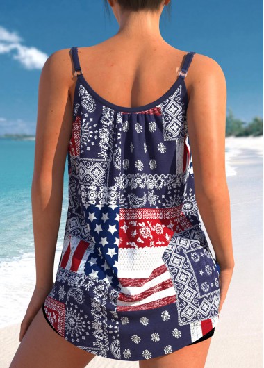 Geometric Print Criss Cross Denim Blue Tankini Set
