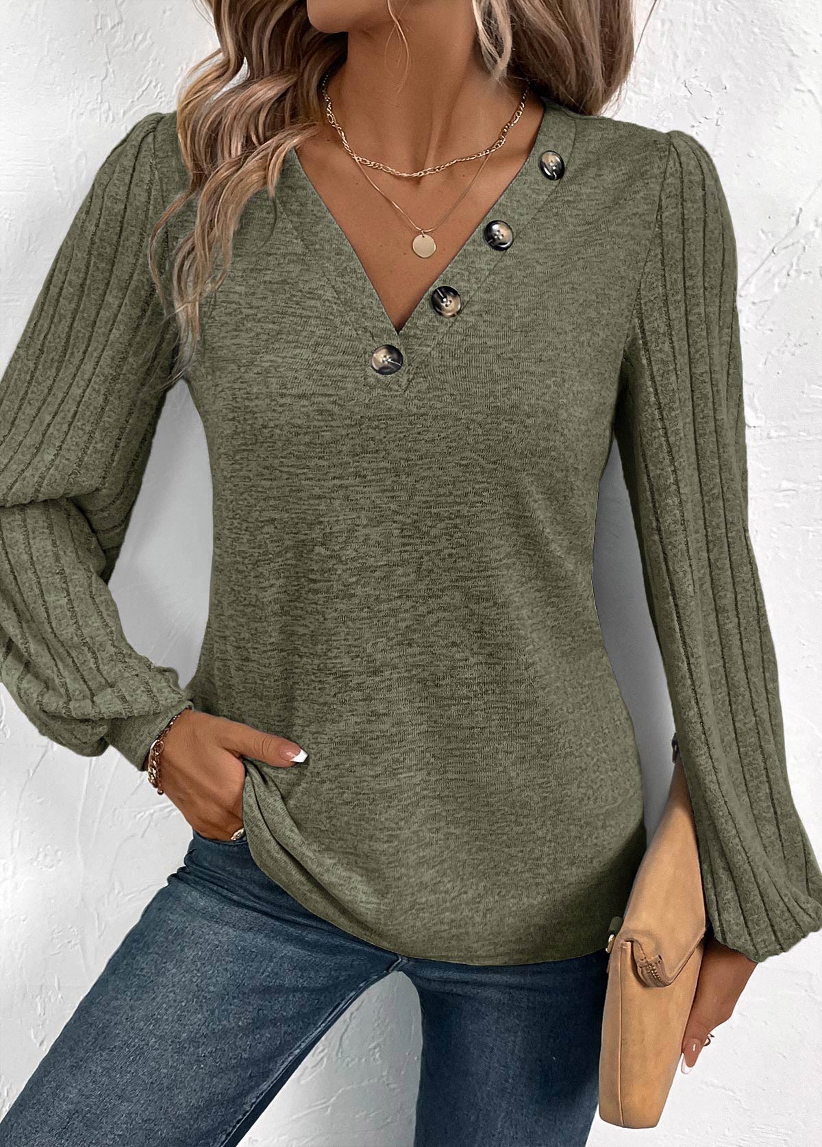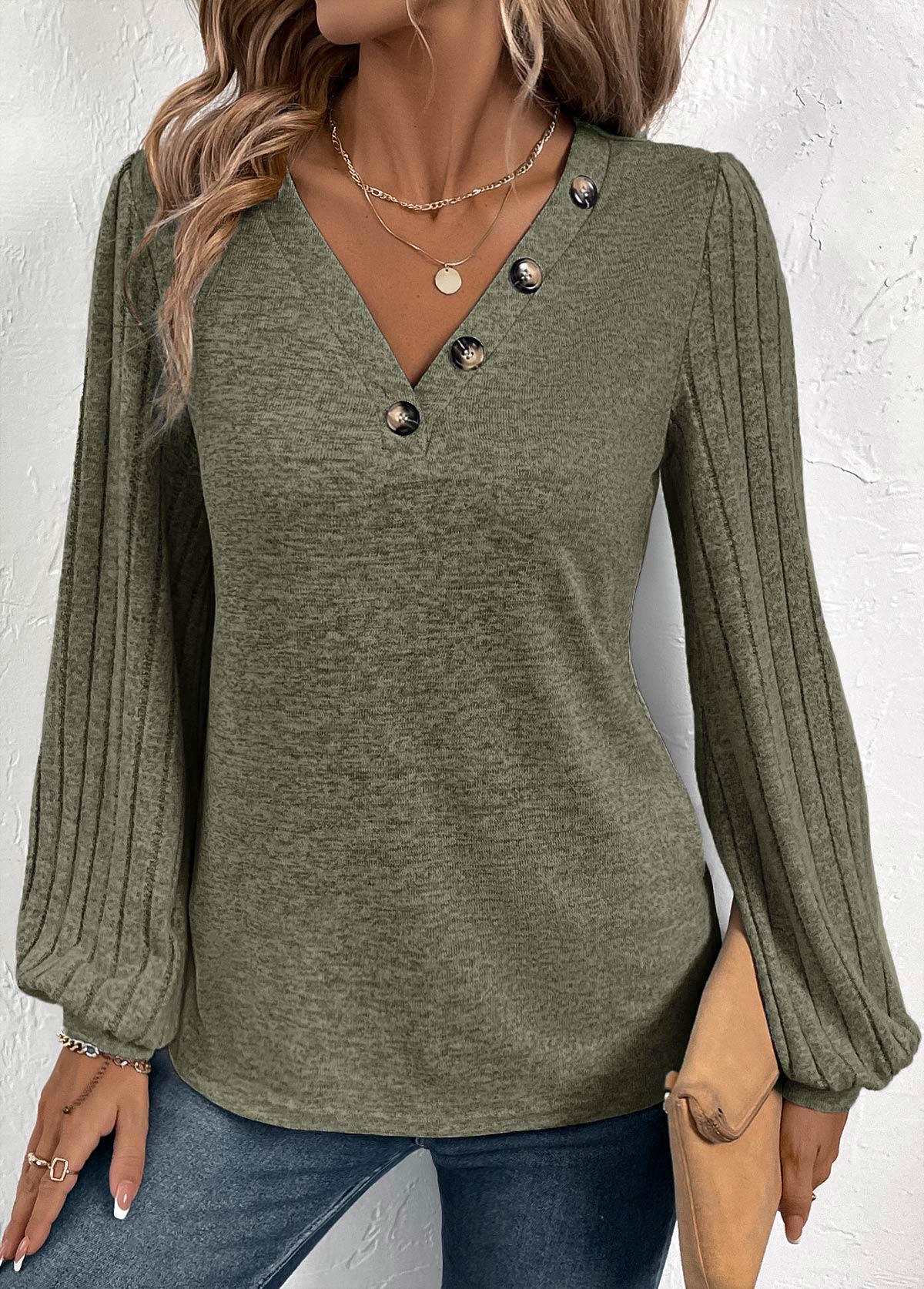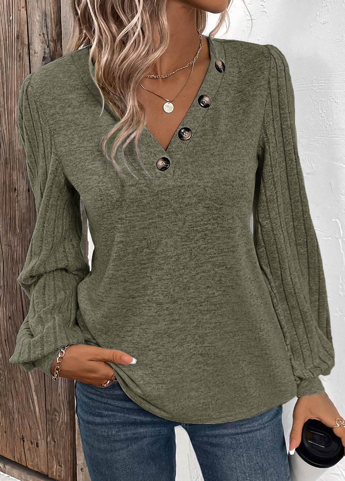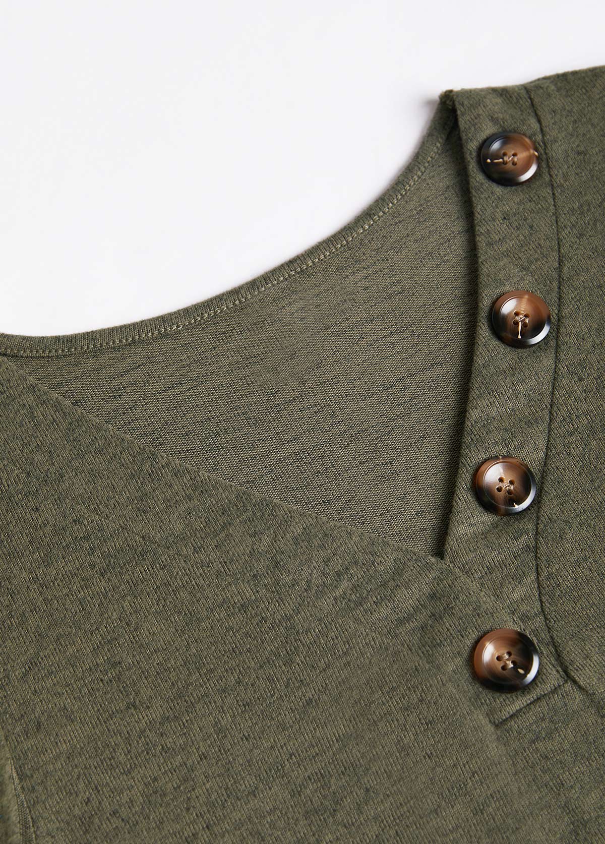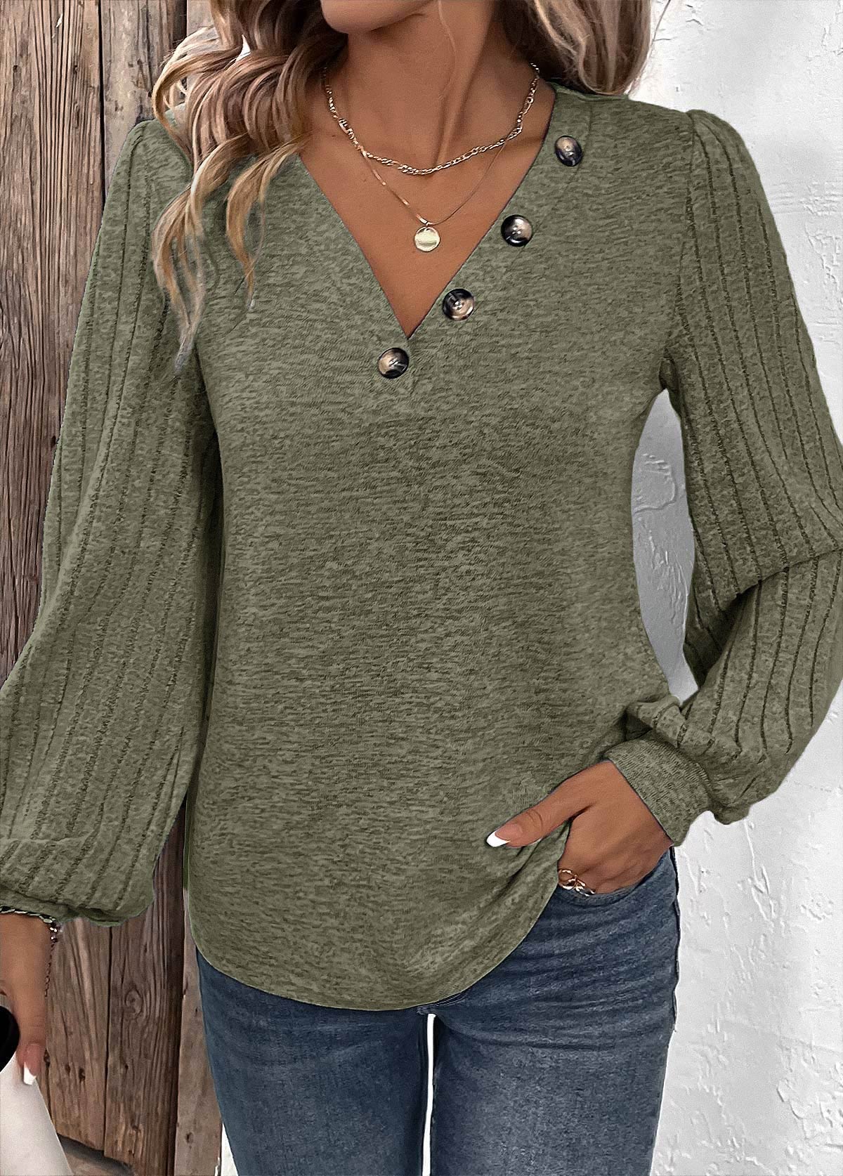 • Embrace effortless style with this olive green T-shirt, featuring fashionable bishop sleeves and a V-neckline adorned with buttons. The perfect blend of trend and comfort, it's an ideal choice for everyday casual wear, adding a touch of elegance to your relaxed look.