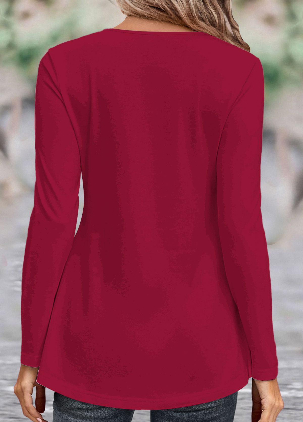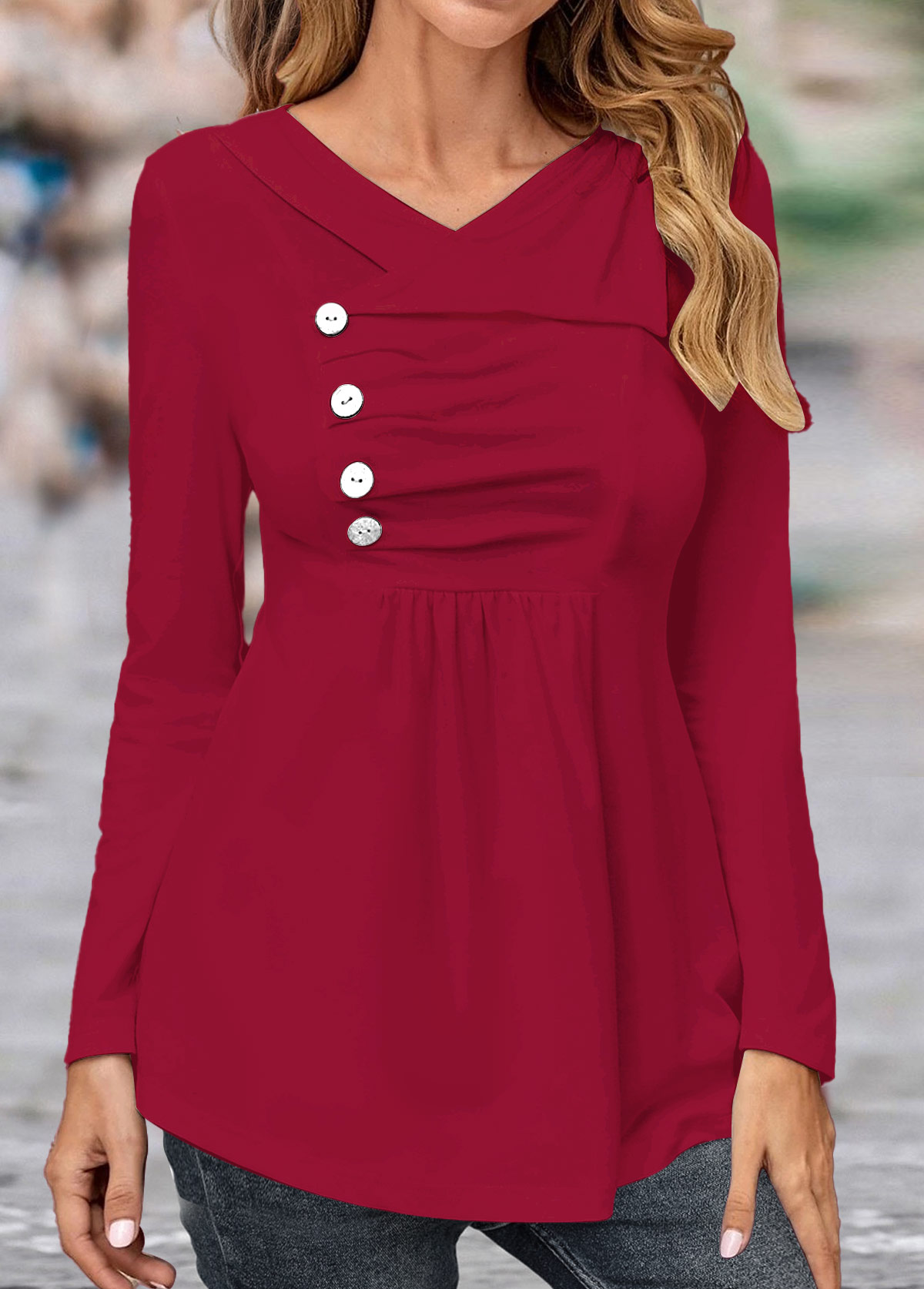 • Asymmetry Turn Down Collar Wine Red T Shirt