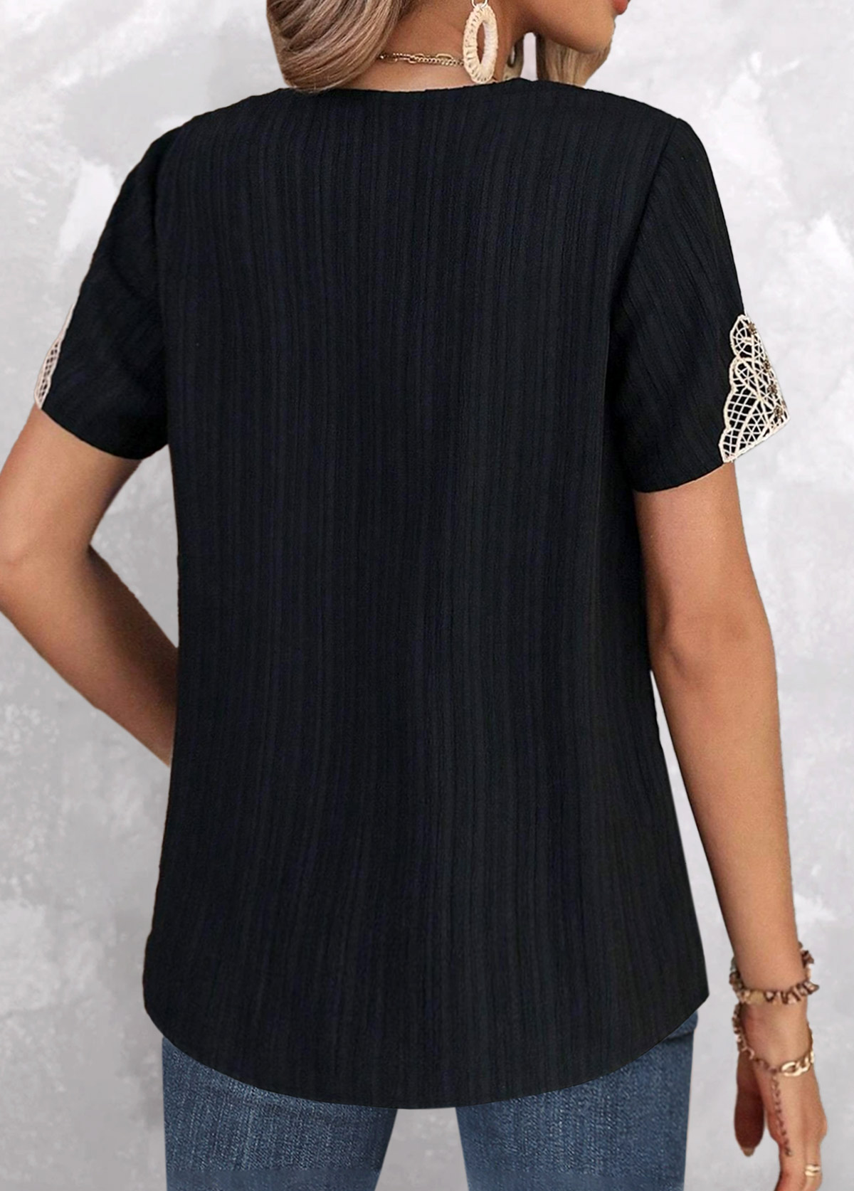 SALE Black V Neck Short Sleeve Lace T Shirt Rosewe®