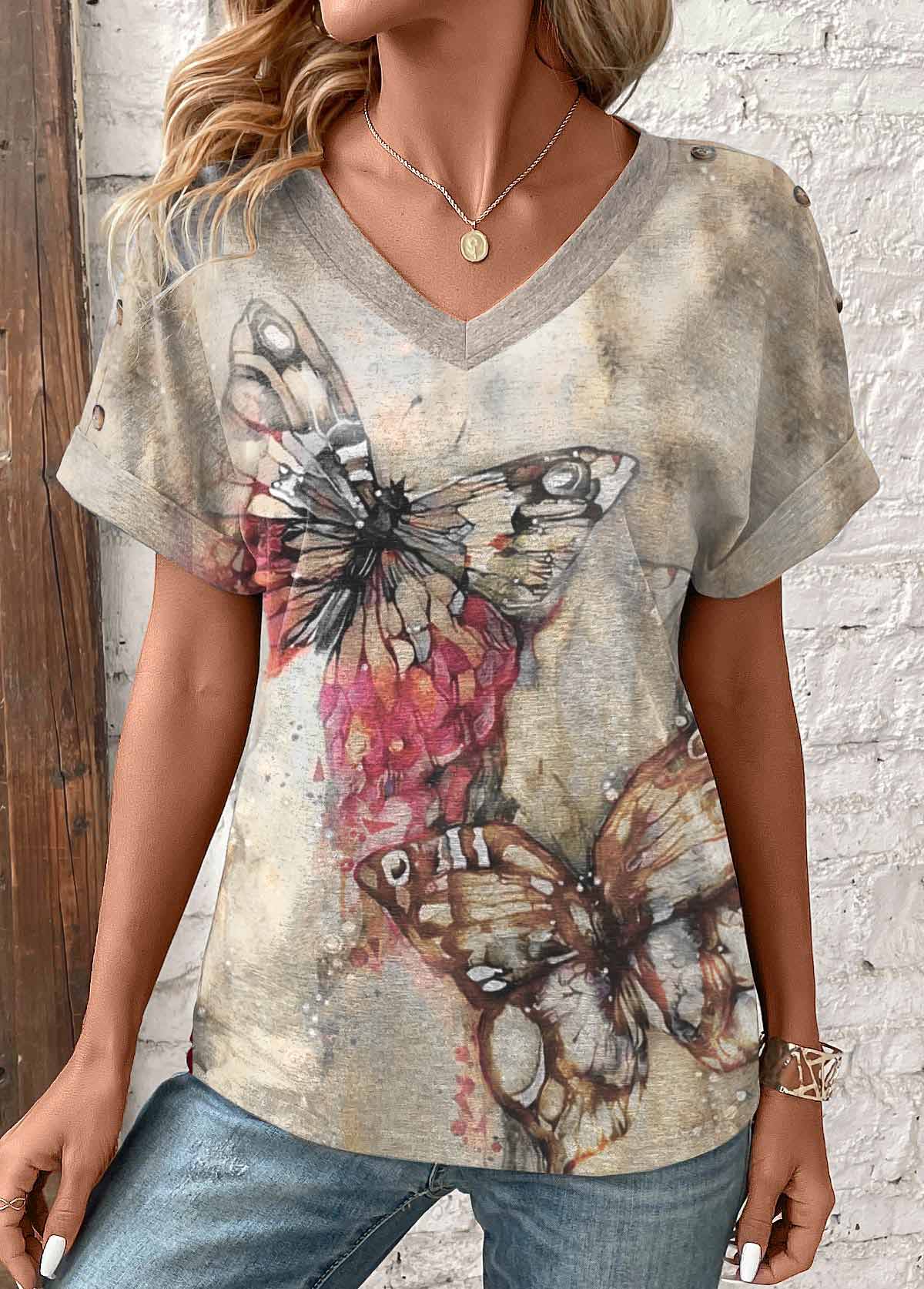 SALE Butterfly Print Patchwork Light Camel Short Sleeve T Shirt Rosewe®