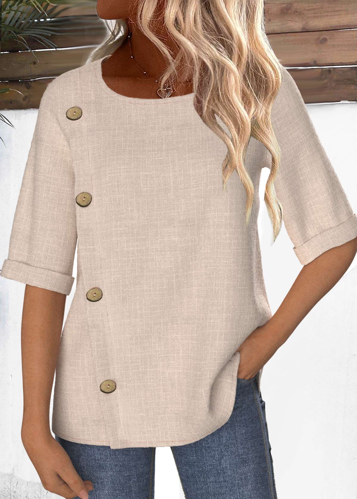SALE Button Light Camel Half Sleeve Round Neck Blouse Rosewe®