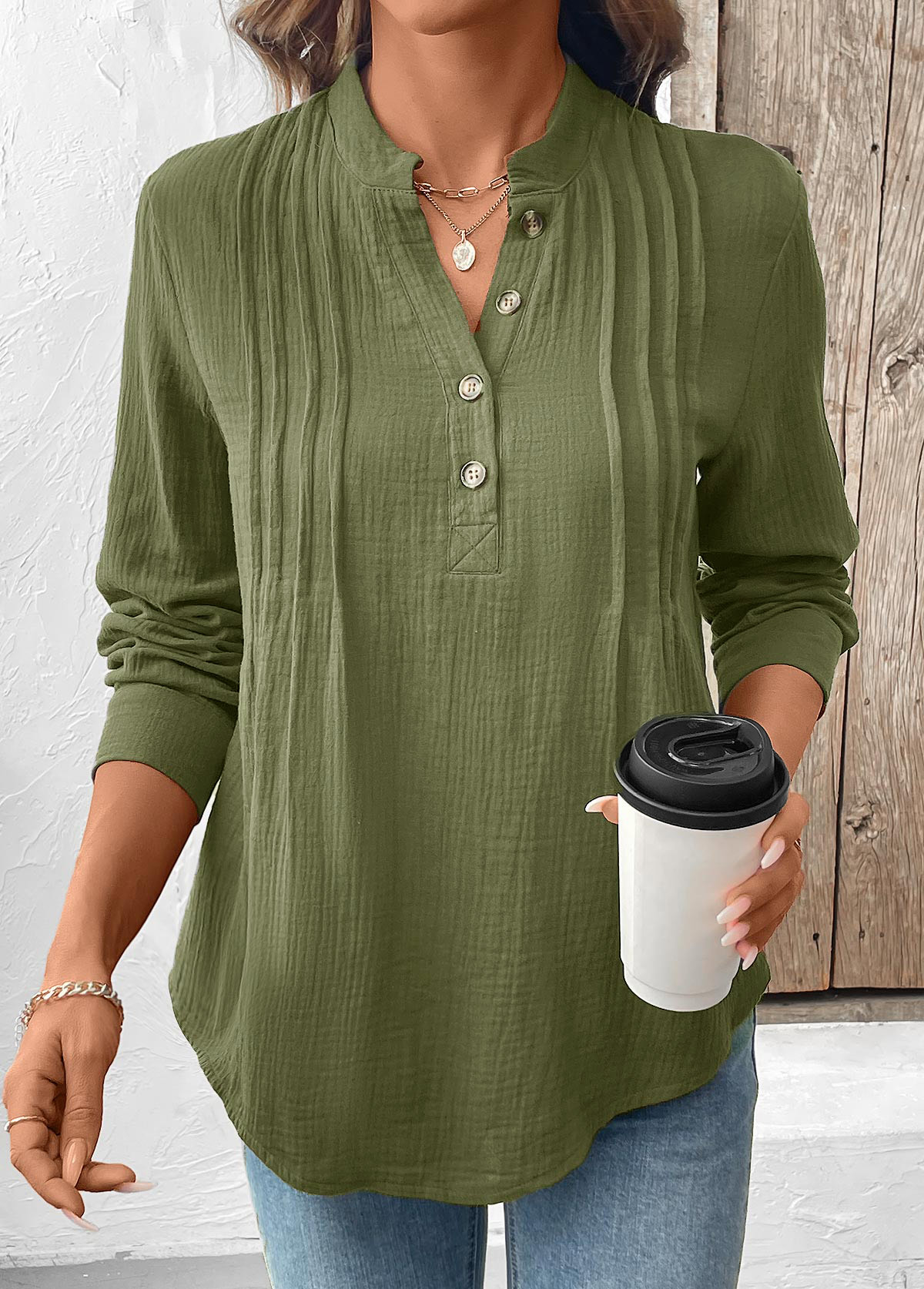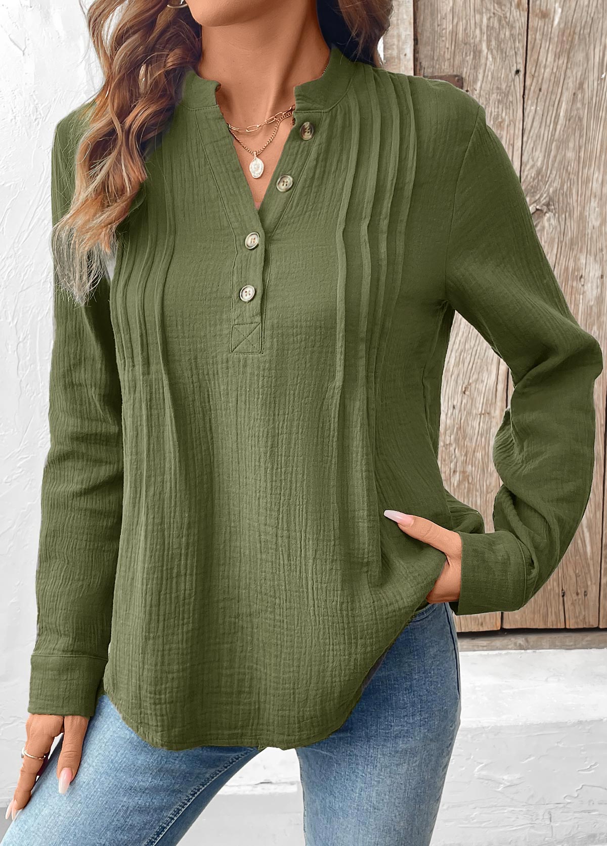 SALE Button Olive Green Long Sleeve Split Neck Blouse Rosewe®
