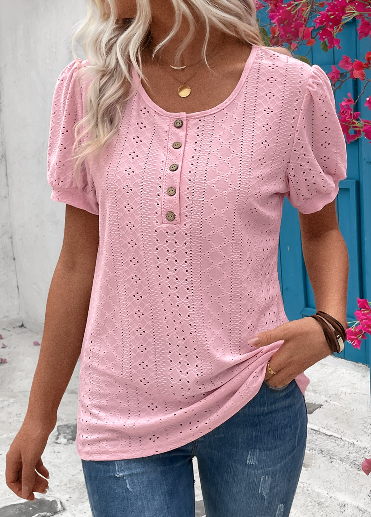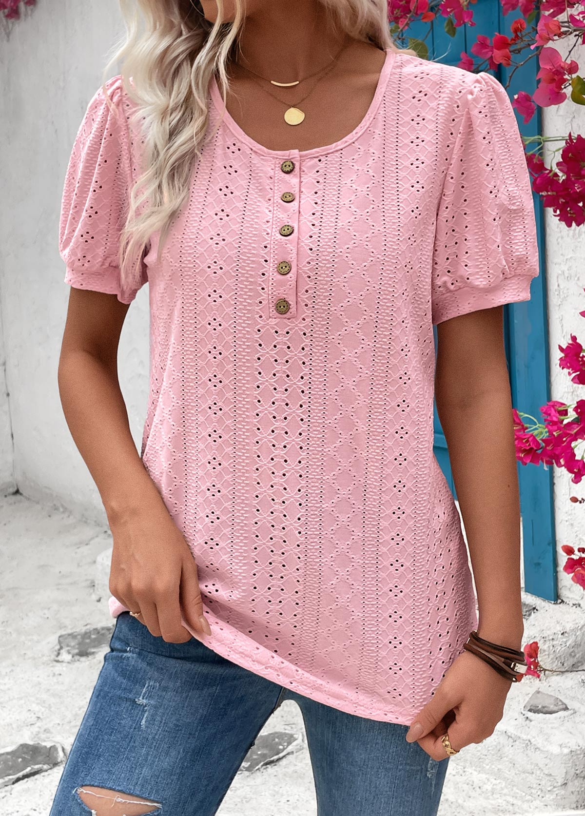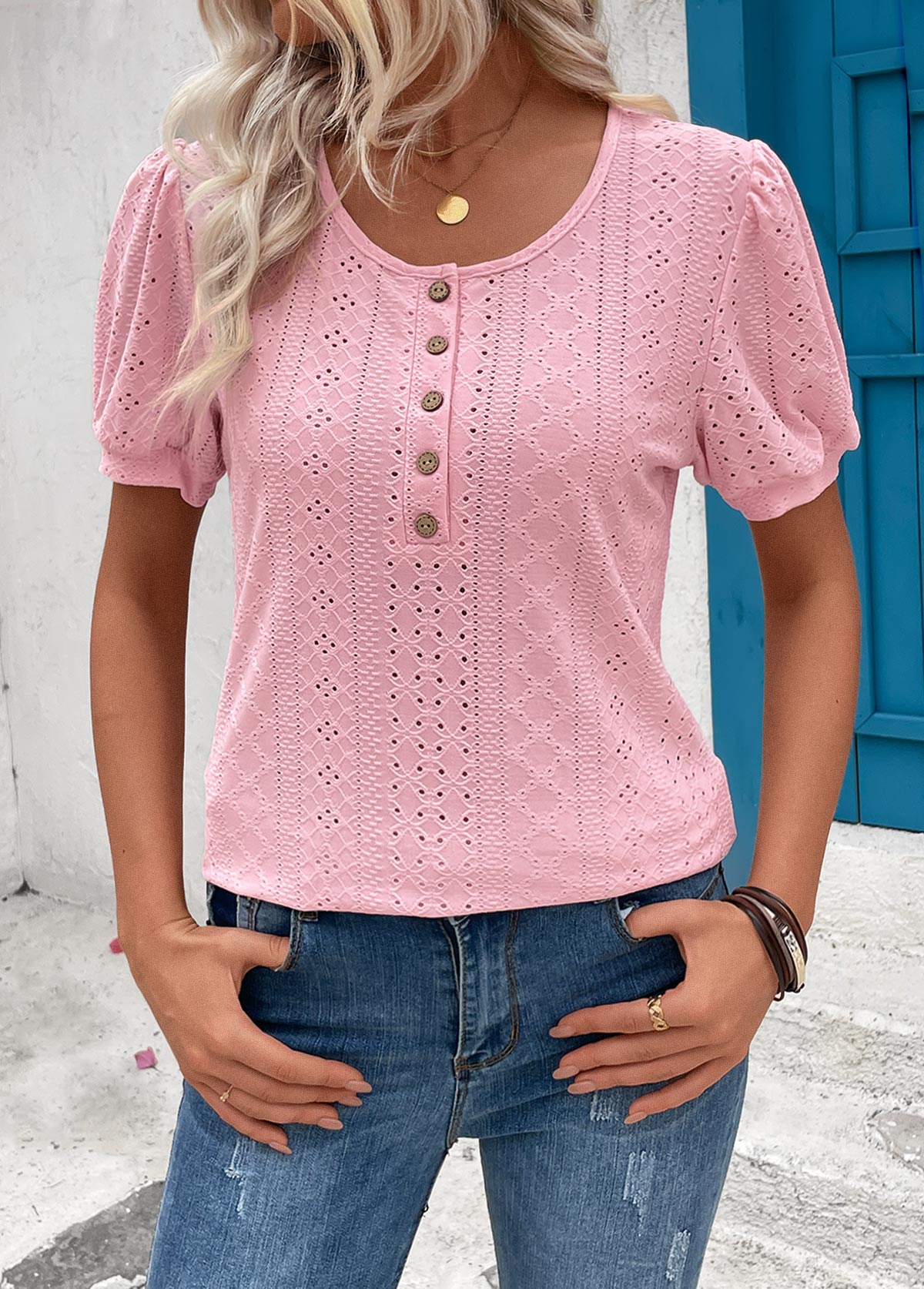 SALE Button Pink Short Sleeve Round Neck T Shirt Rosewe®