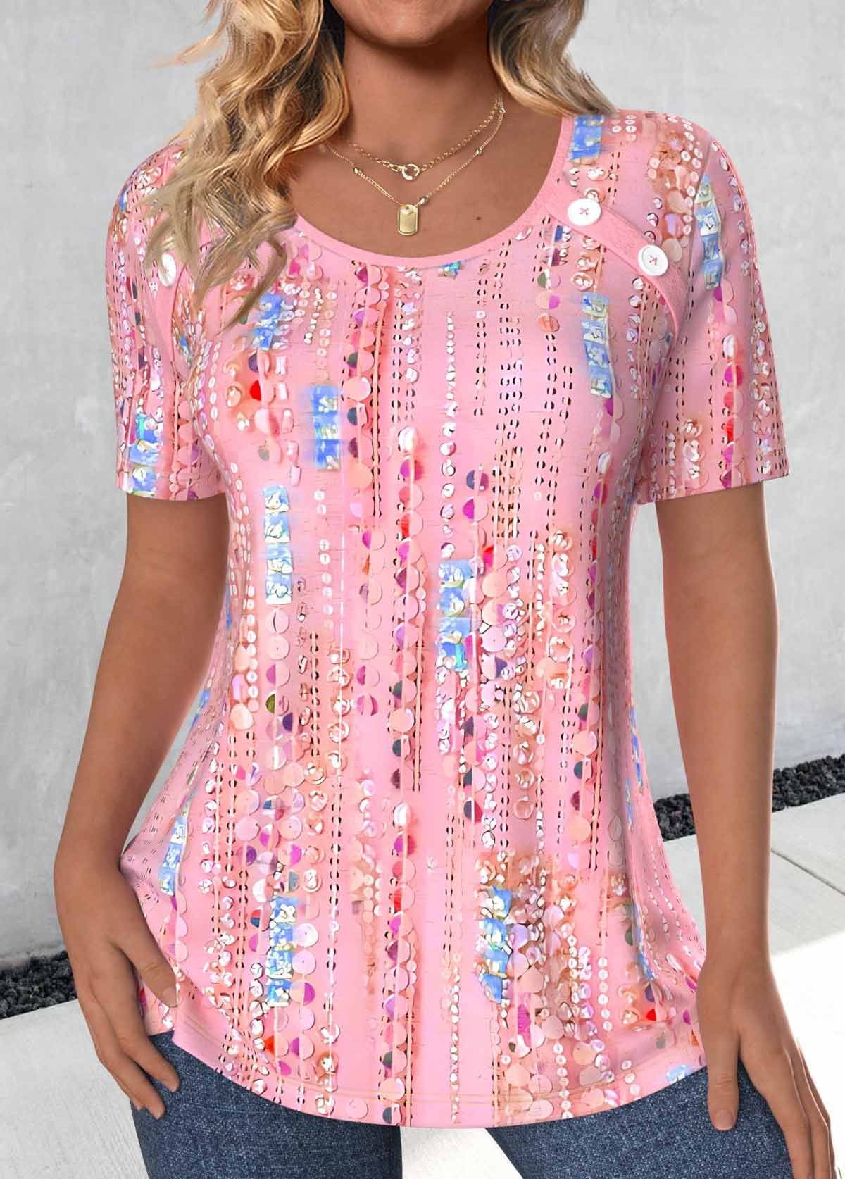 SALE Button Pink Short Sleeve Round Neck T Shirt Rosewe®