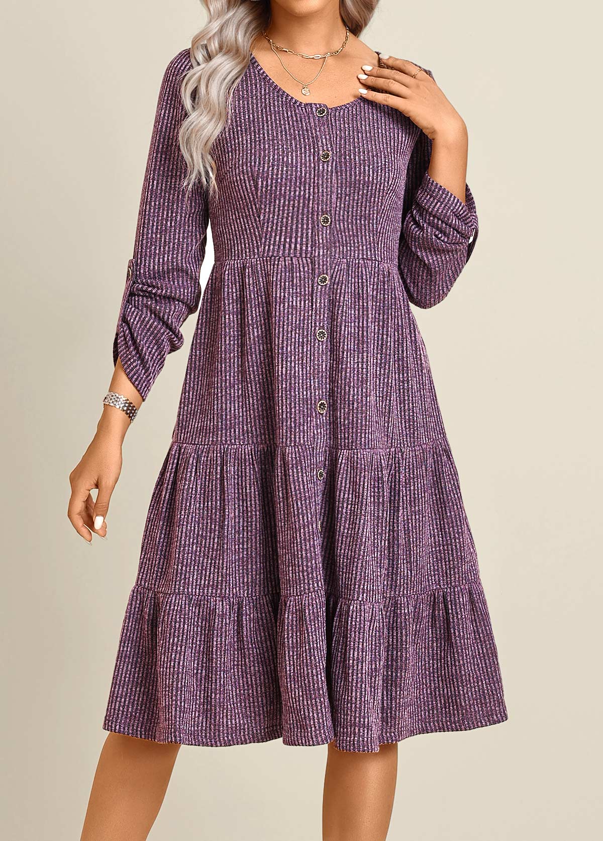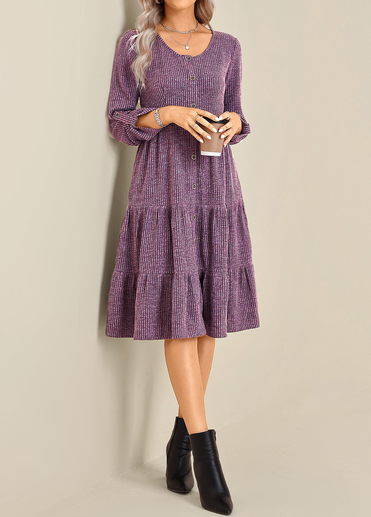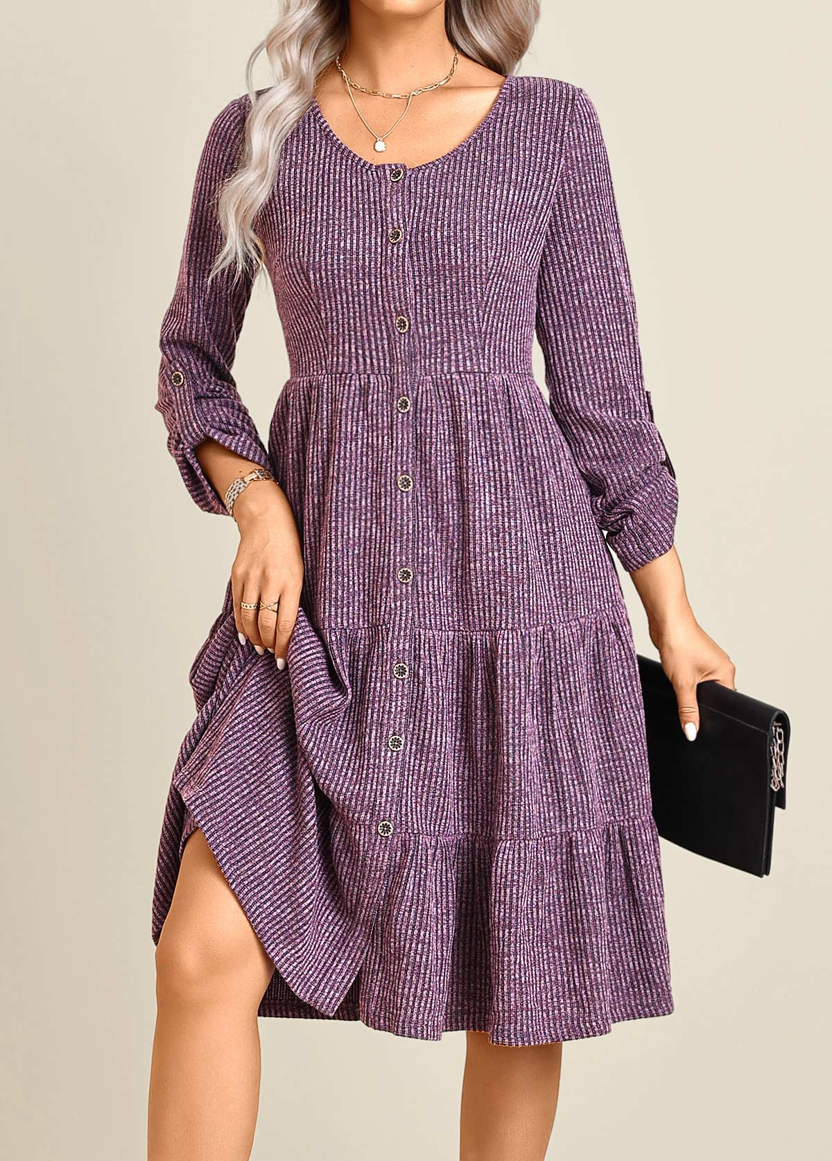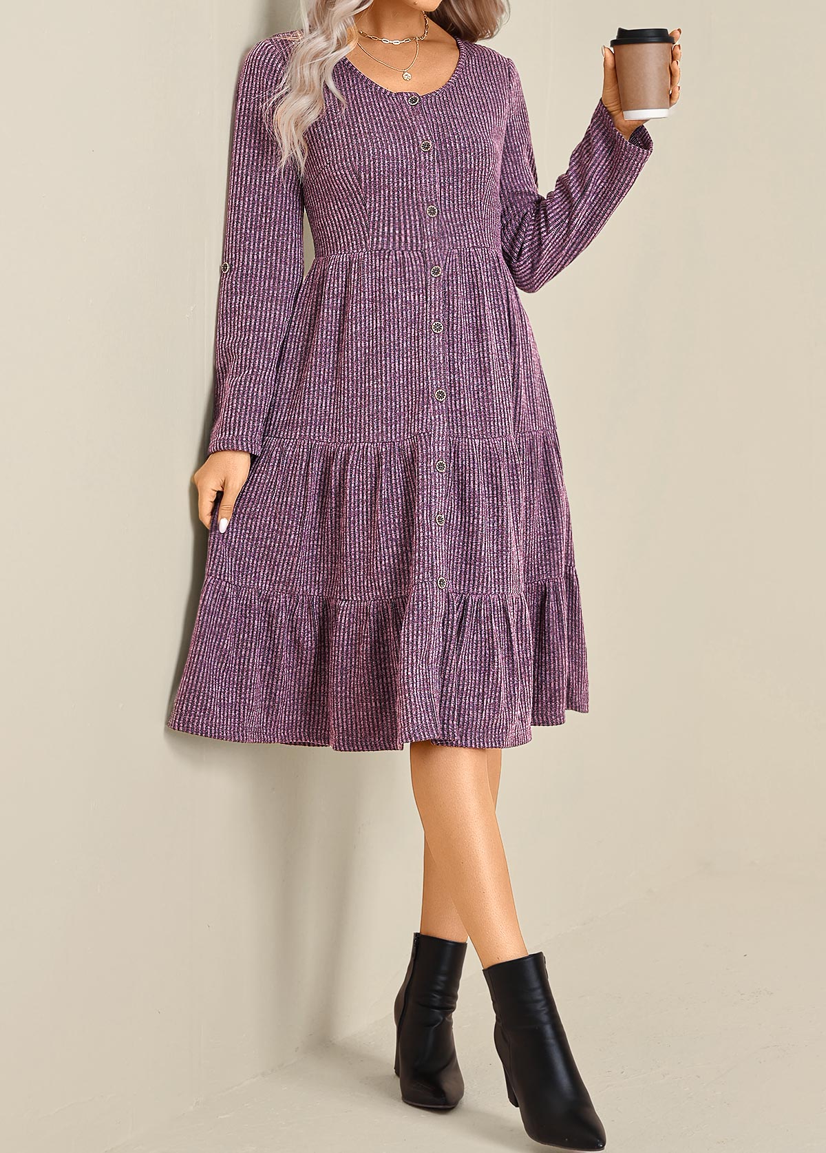 SALE Button Purple Long Sleeve Round Neck Dress Rosewe®