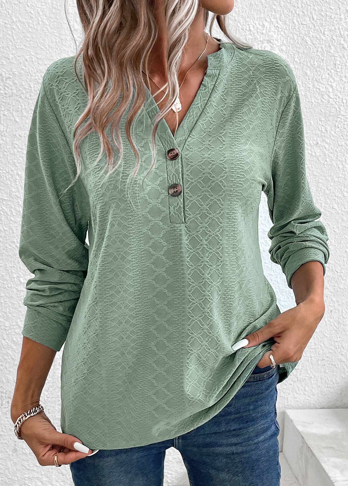 SALE Button Split Neck Long Sleeve Green T Shirt Rosewe®