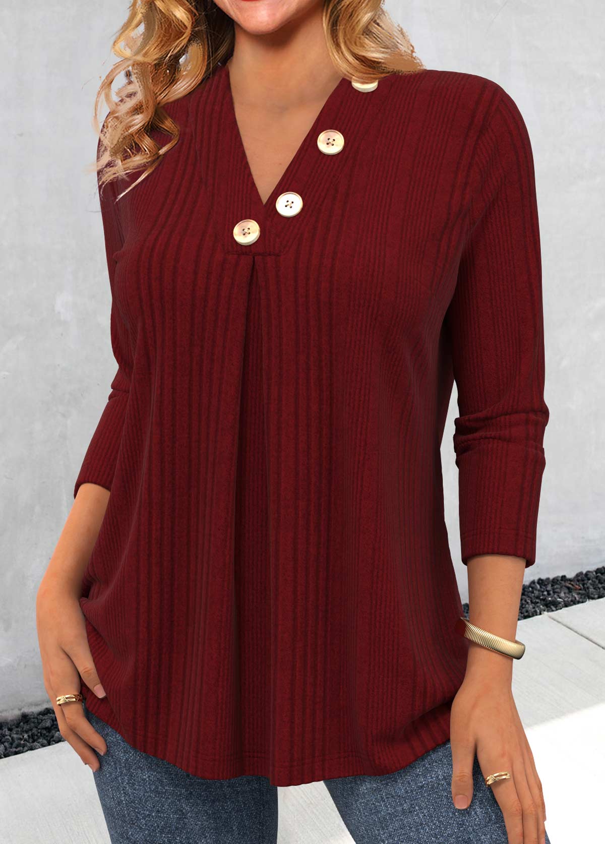 SALE Button Wine Red Long Sleeve V Neck T Shirt Rosewe®