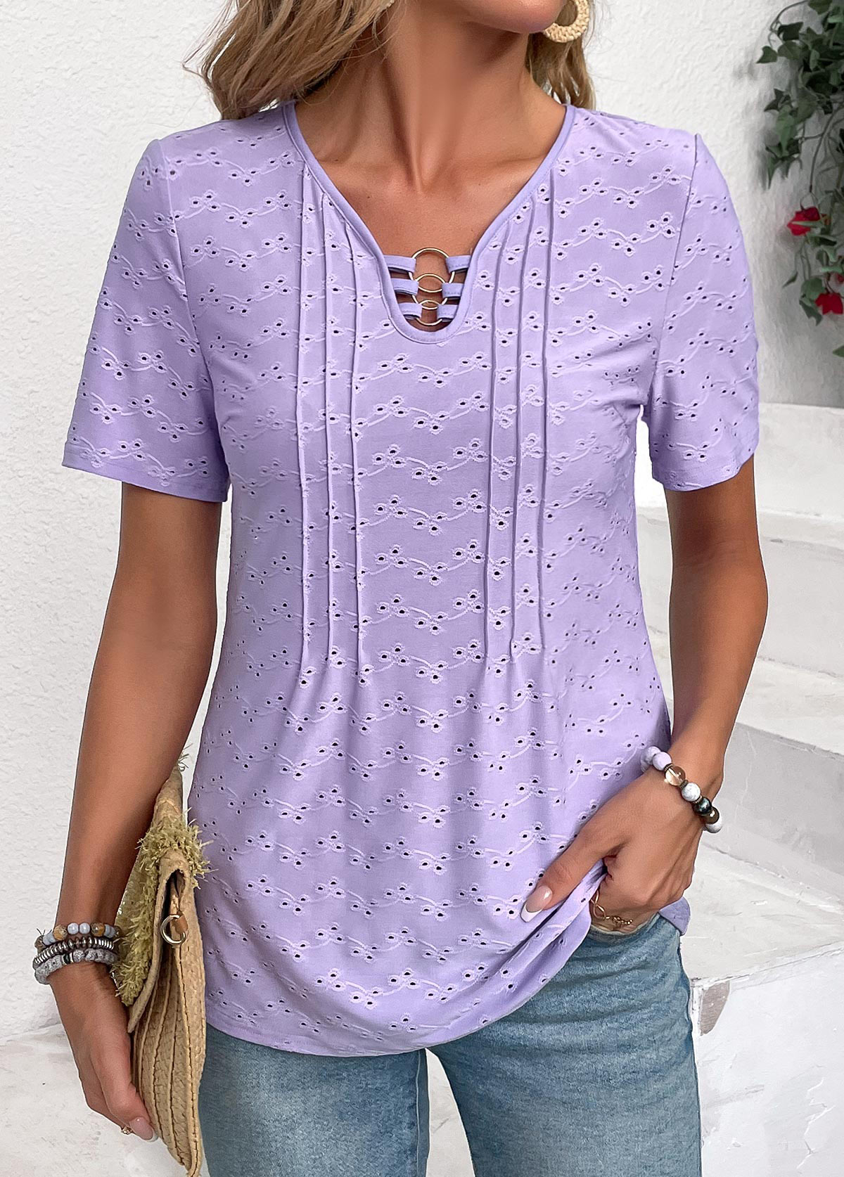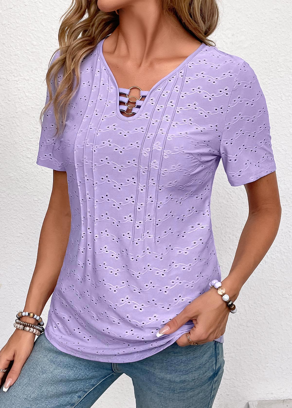 SALE Circular Ring Light Purple Short Sleeve V Neck Blouse Rosewe®