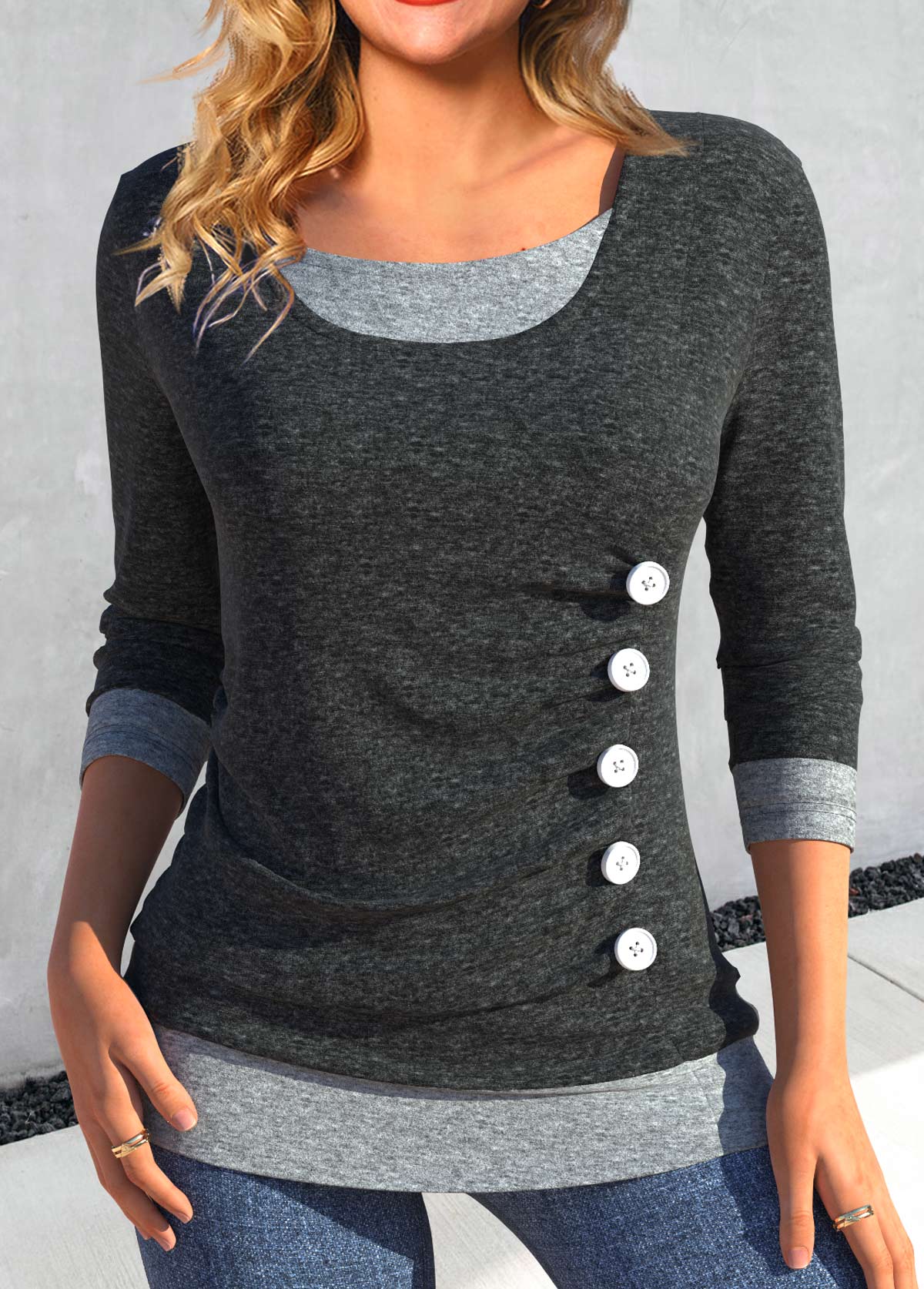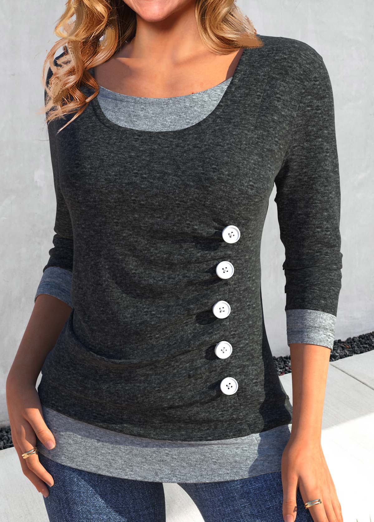 SALE Dark Grey Scoop Neck Fake 2in1 T Shirt Rosewe®