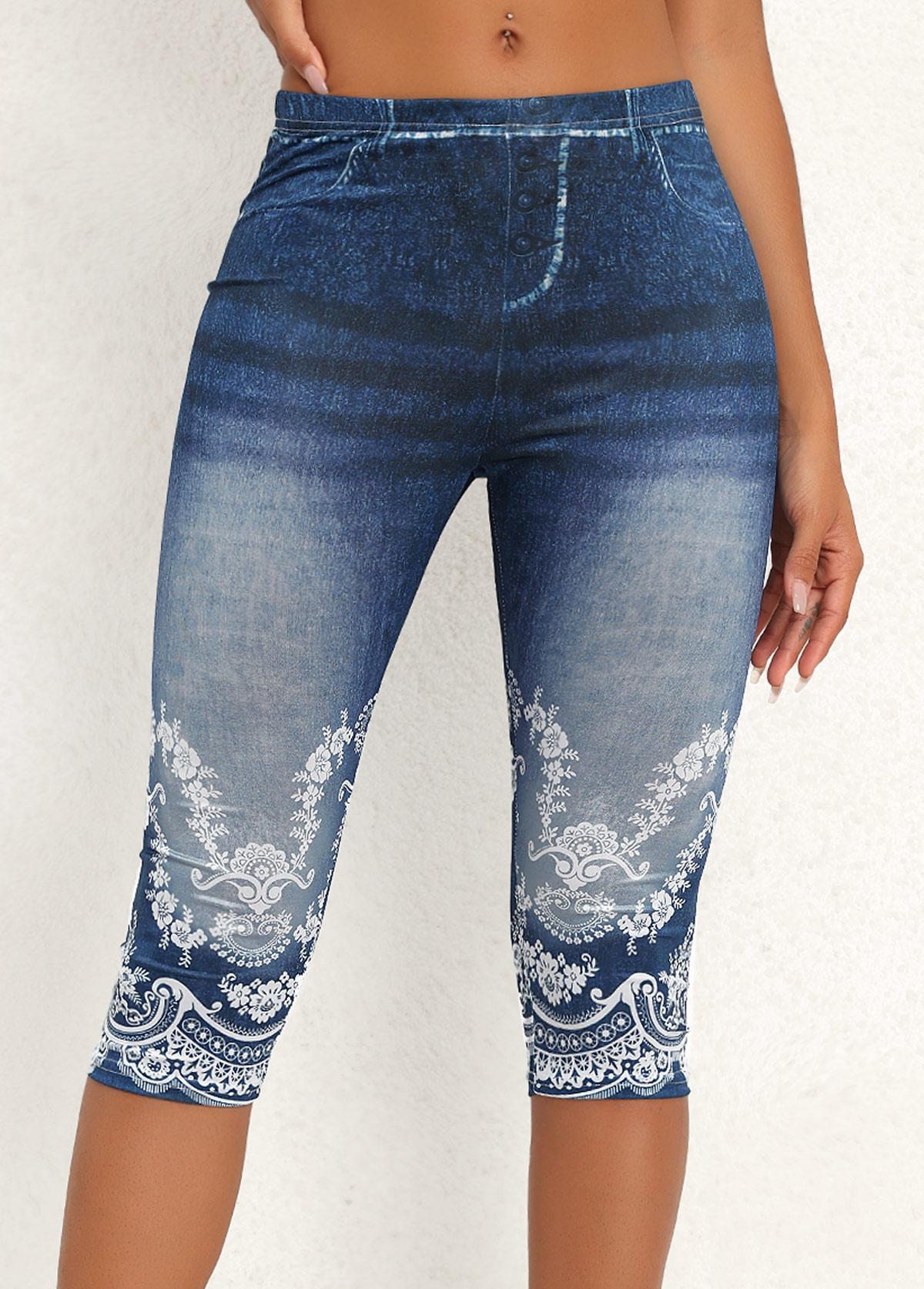 SALE Denim Blue Elastic Waist High Waisted Capri Leggings Rosewe®