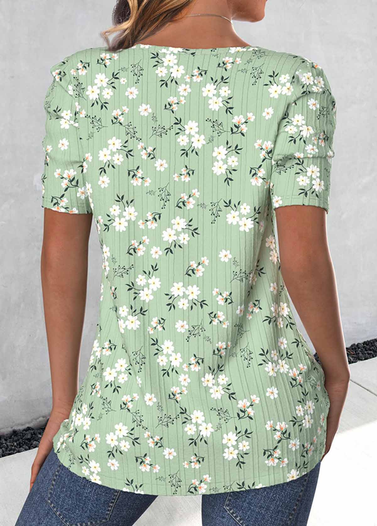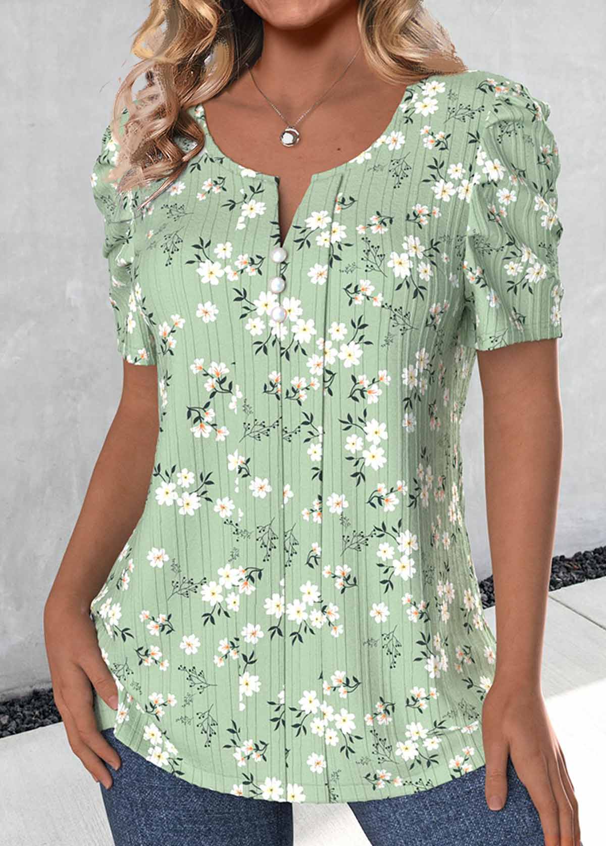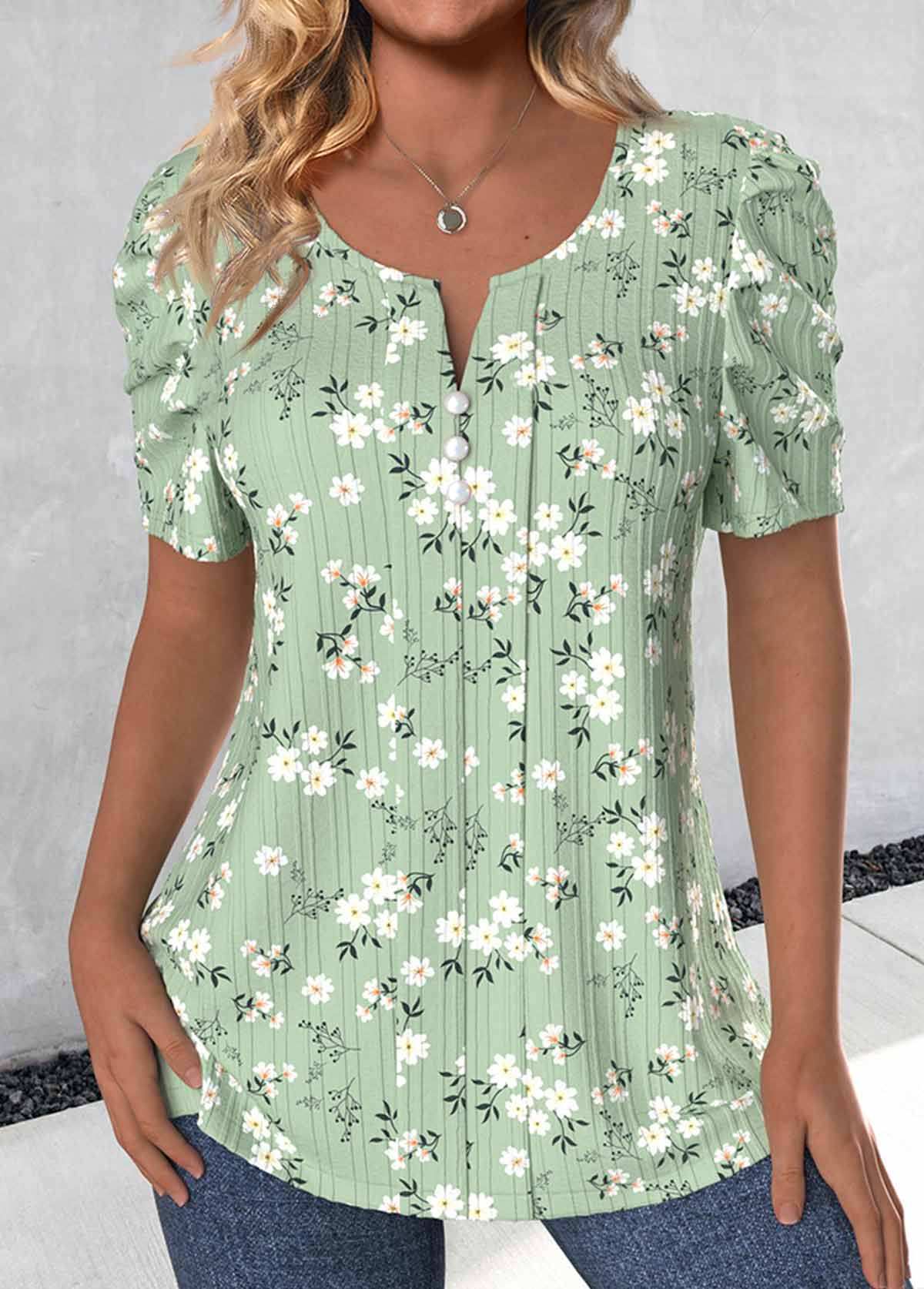 SALE Ditsy Floral Print Button Light Green T Shirt Rosewe®