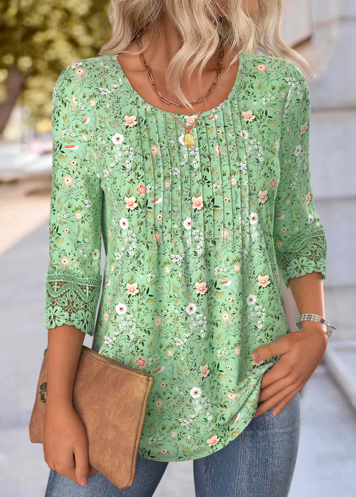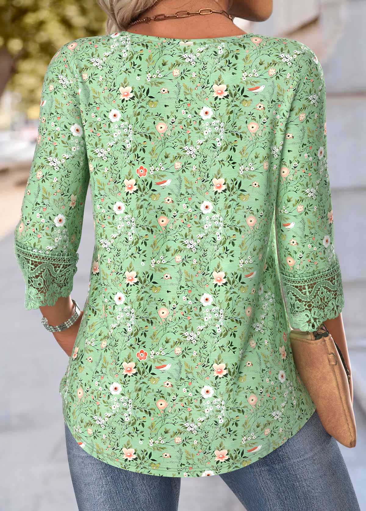 • Ditsy Floral Print Light Green 3/4 Sleeve T Shirt