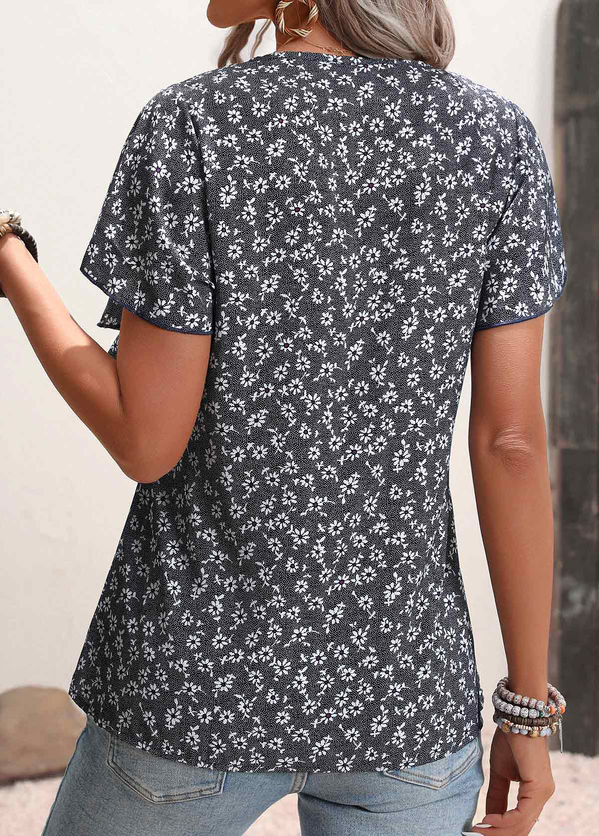 Ditsy Floral Print Patchwork Black Short Sleeve Blouse