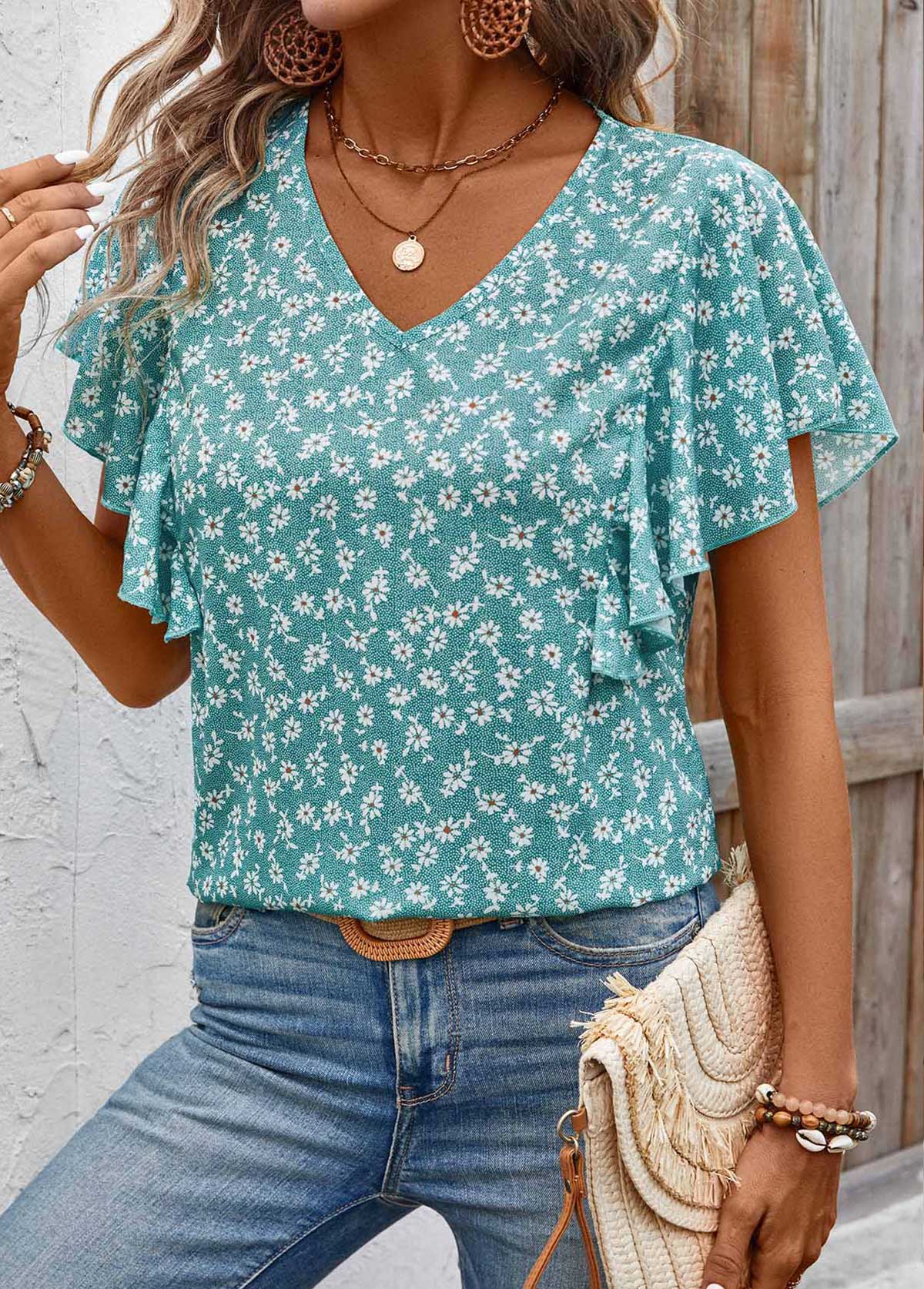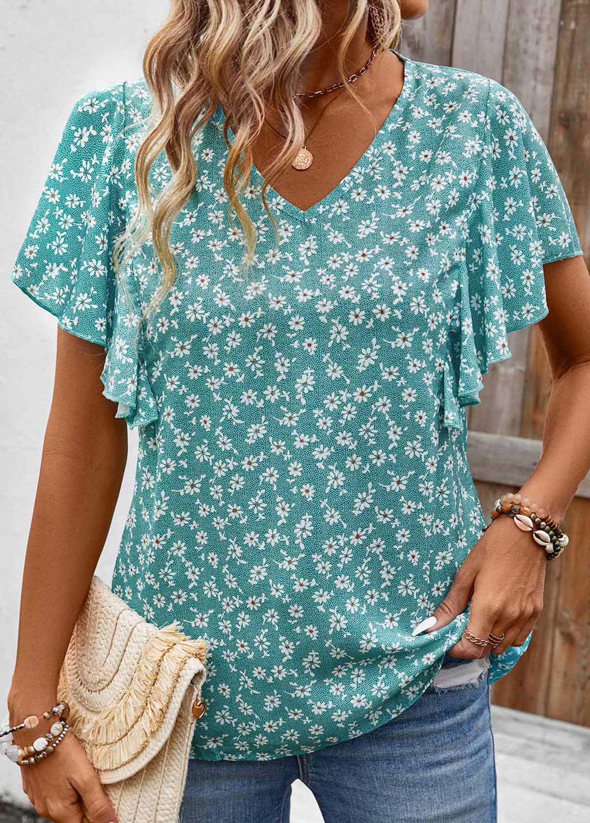 SALE Ditsy Floral Print Ruffle Mint Green Short Sleeve Blouse Rosewe®