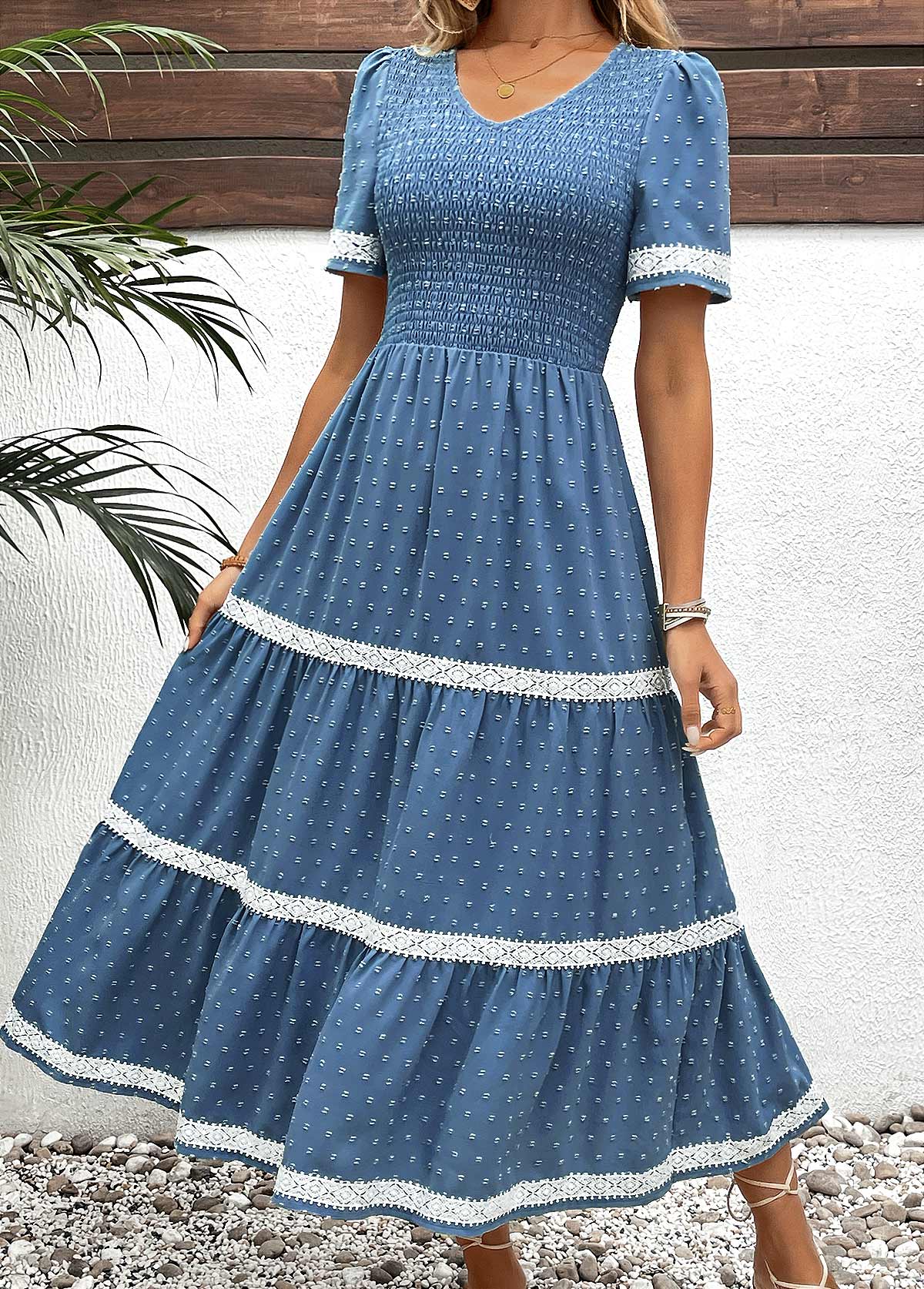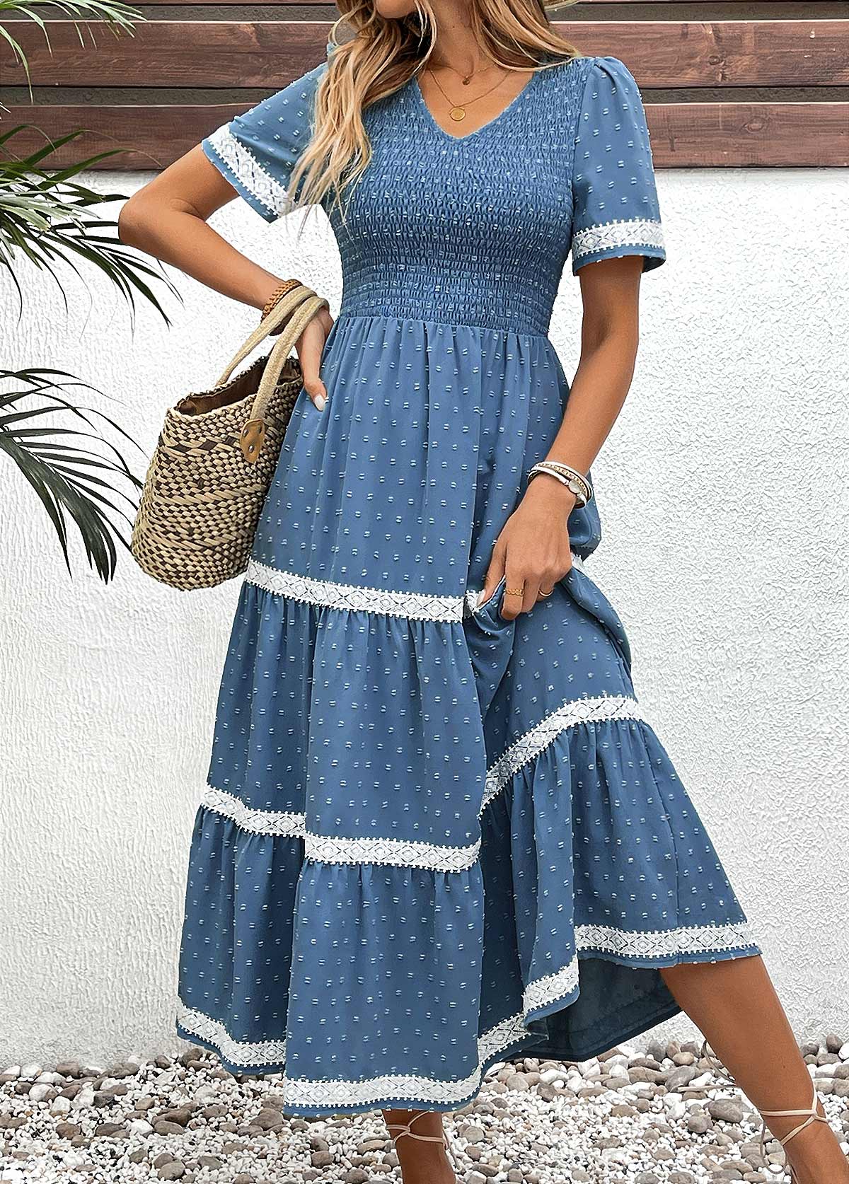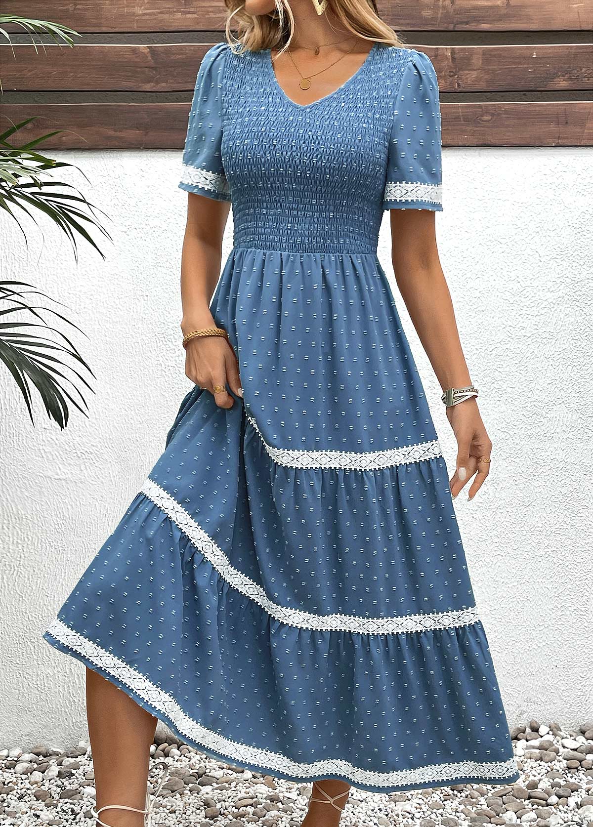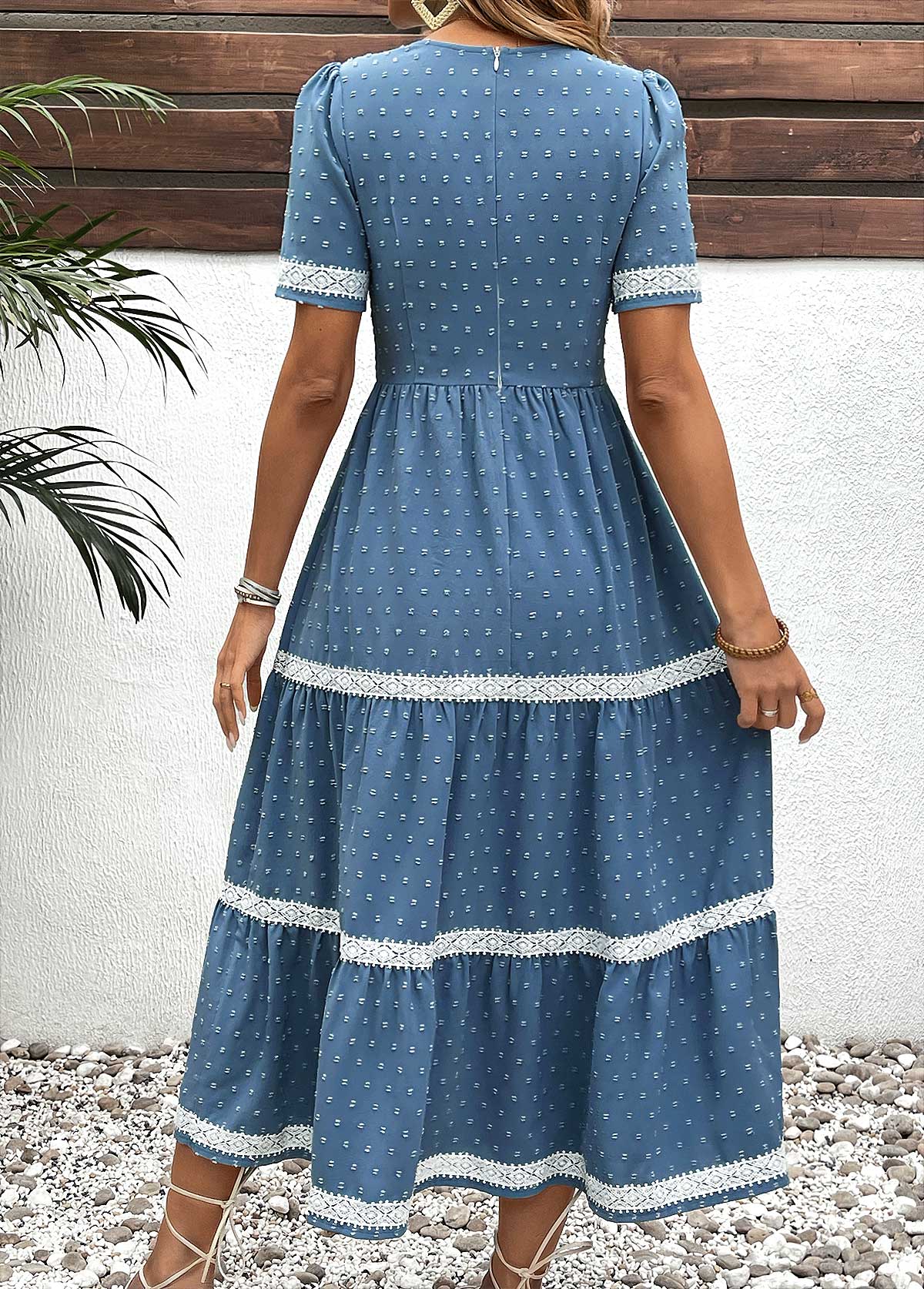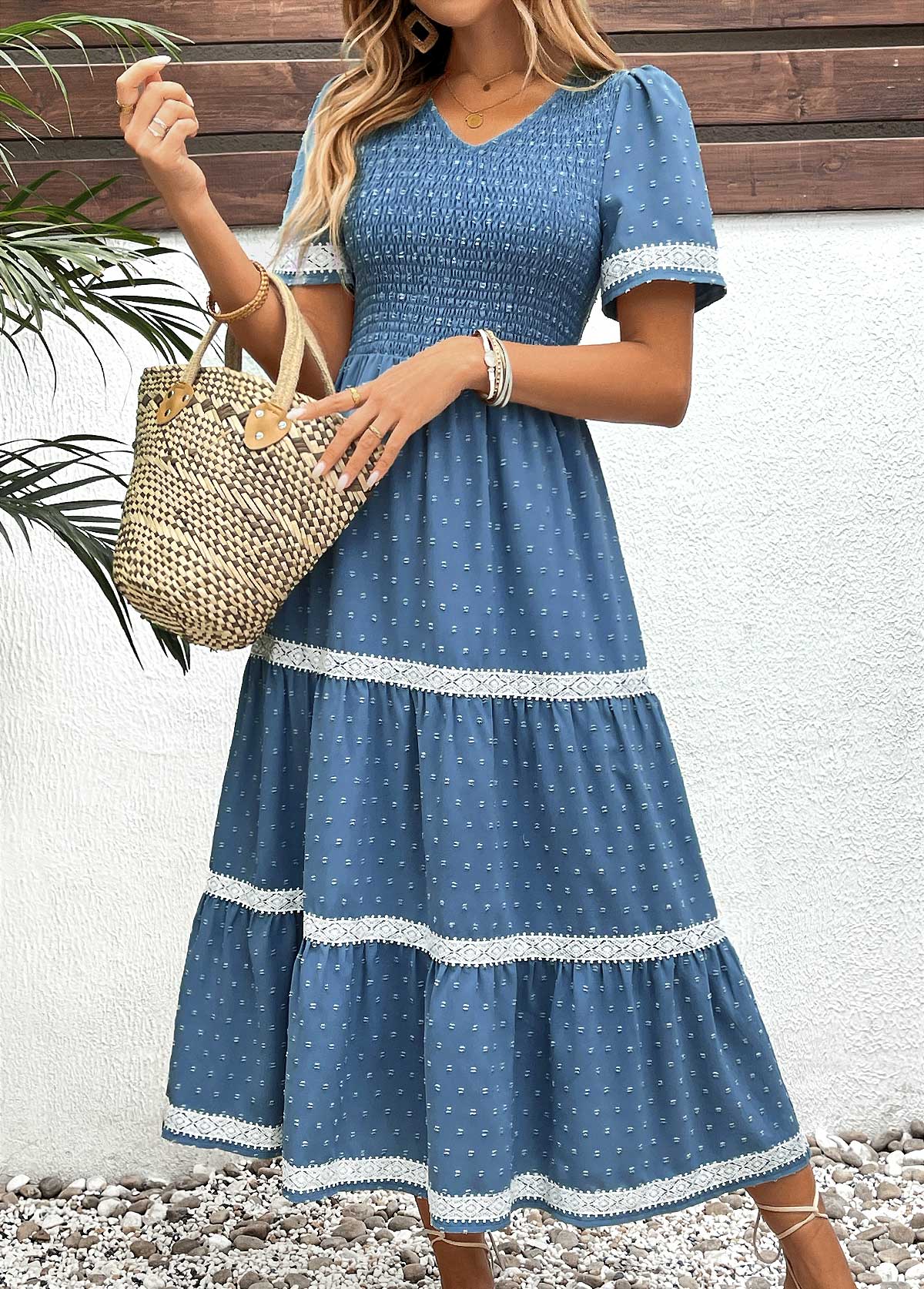 • Embroidery Dusty Blue Short Sleeve V Neck Dress