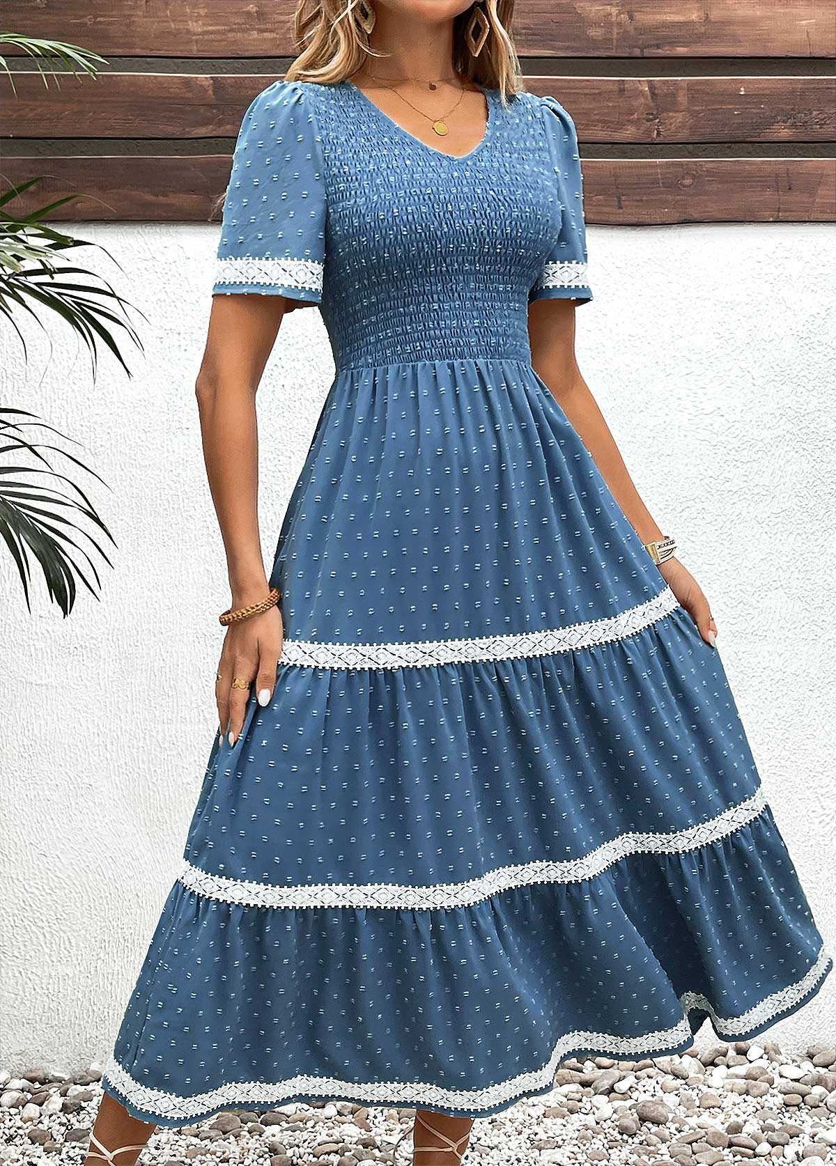 SALE Embroidery Dusty Blue Short Sleeve V Neck Dress Rosewe®