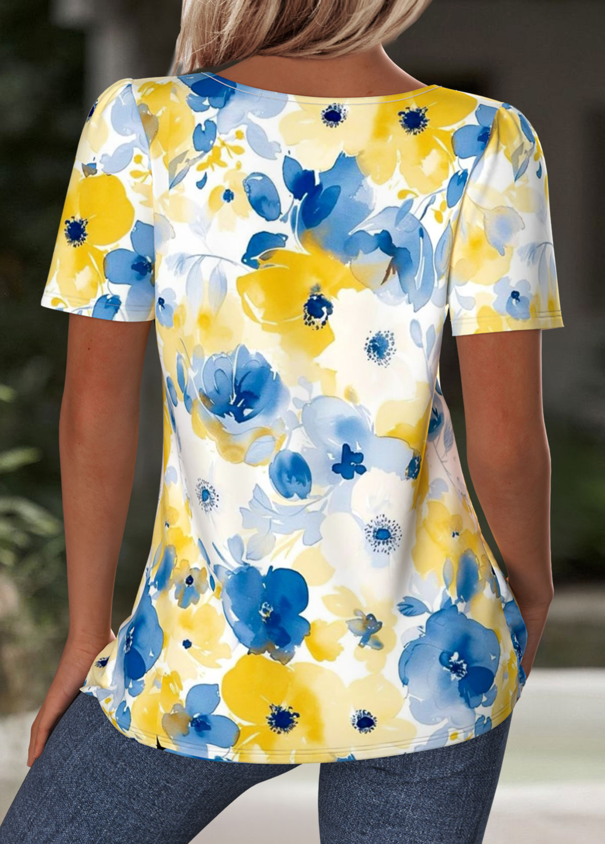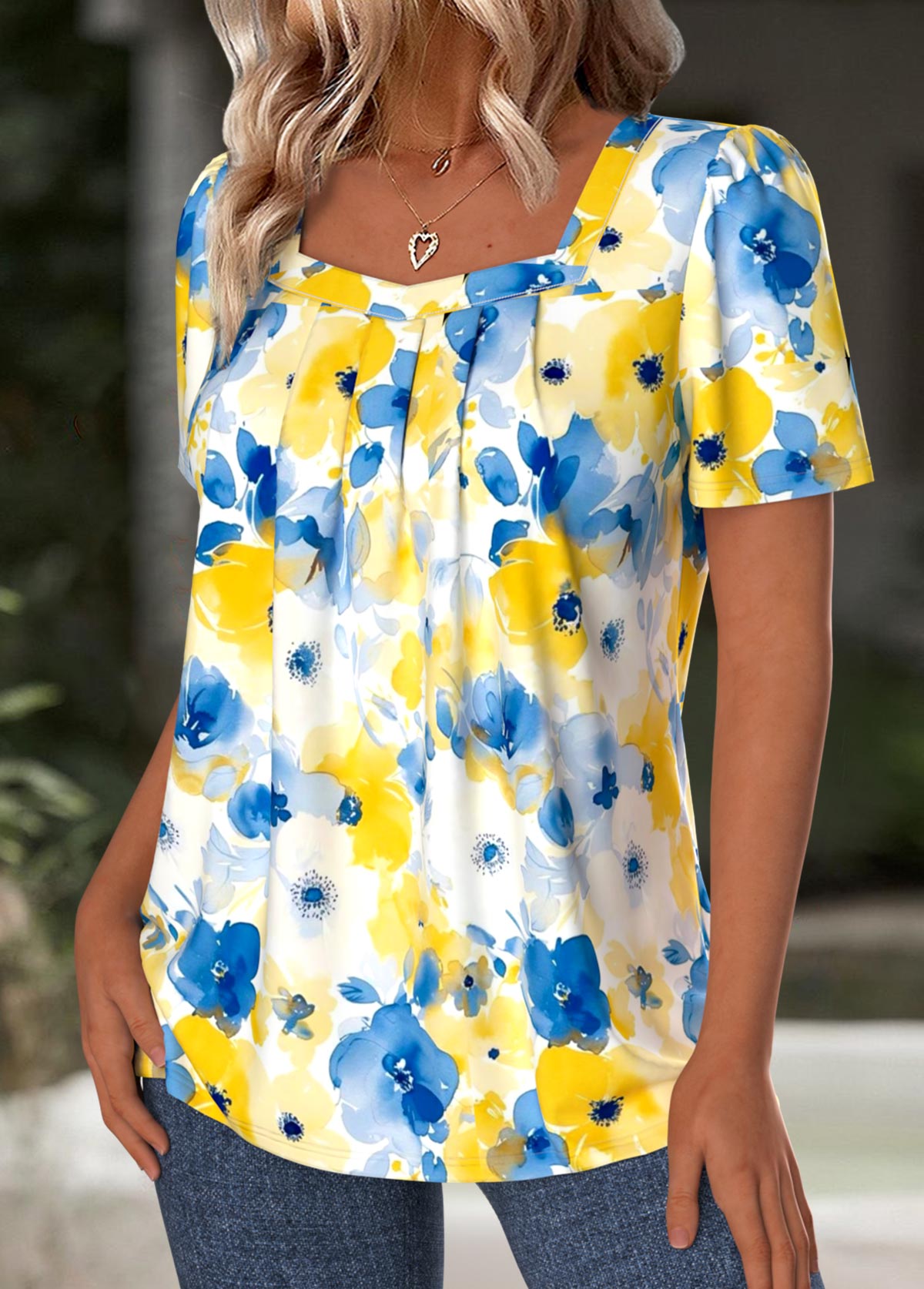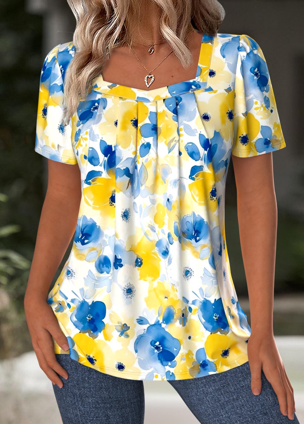 • Floral Print Blue Short Sleeve Square Neck T Shirt