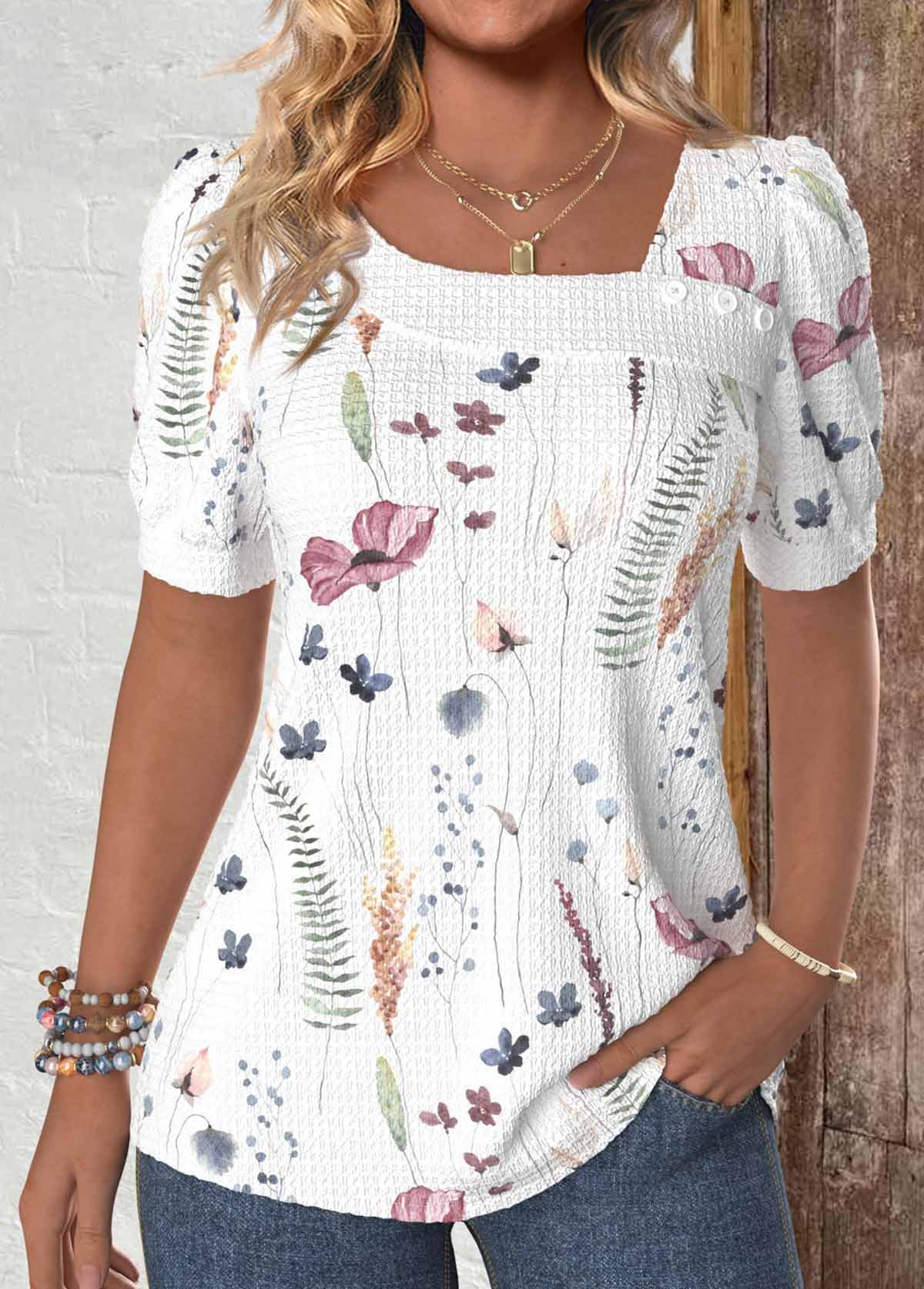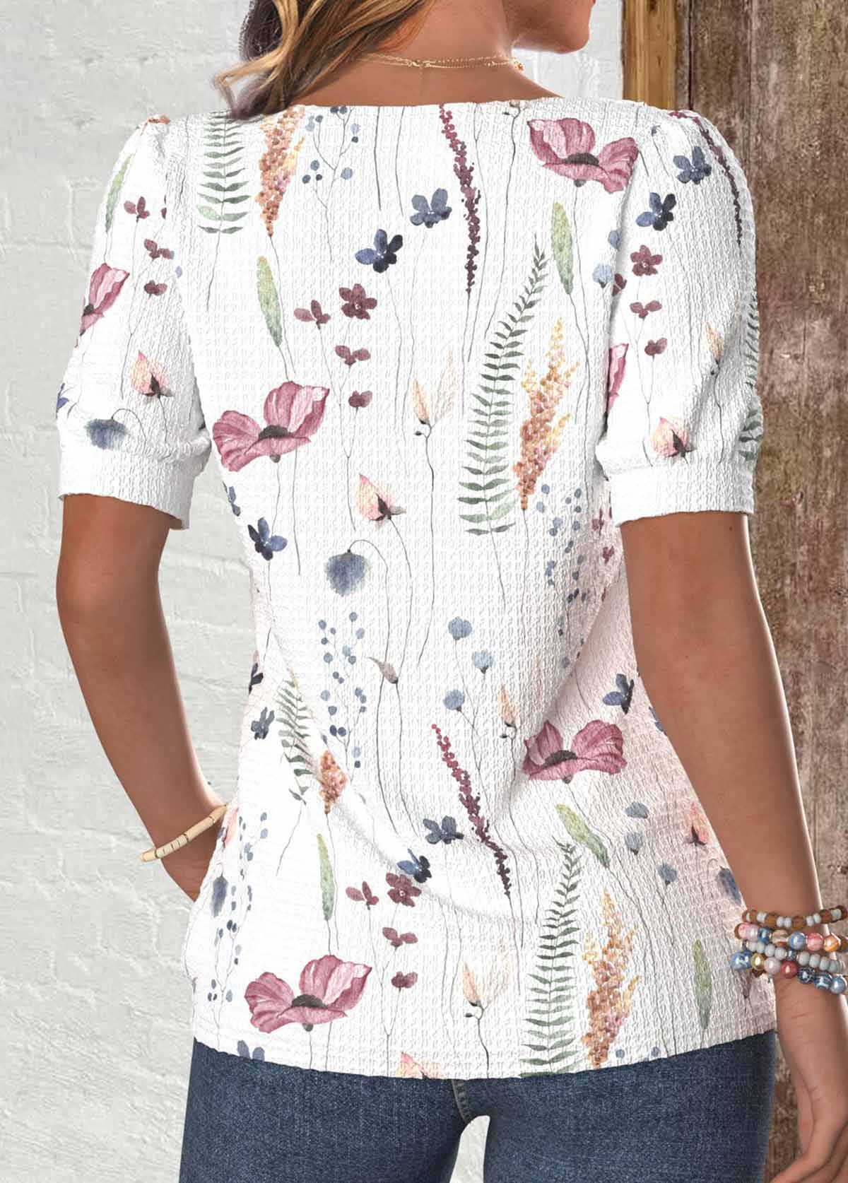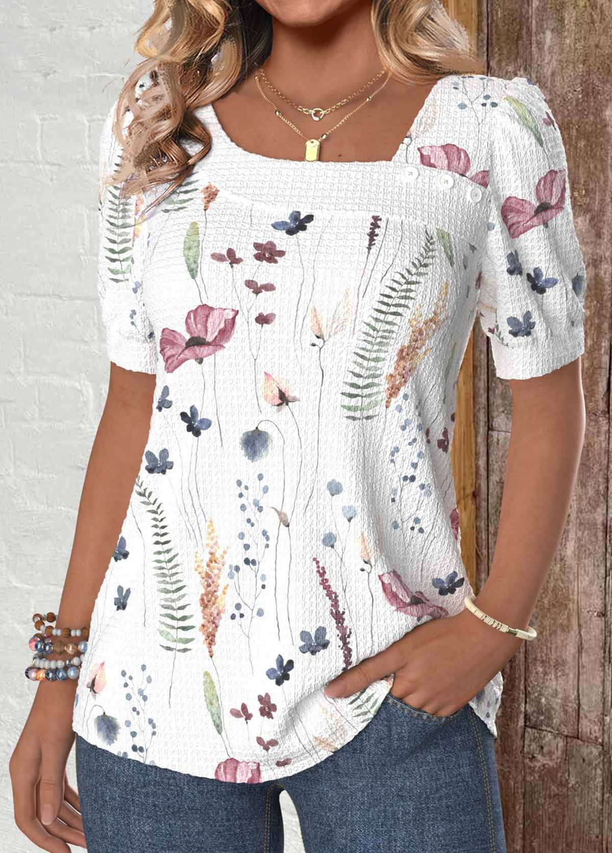 SALE Floral Print Button White Short Sleeve T Shirt Rosewe®