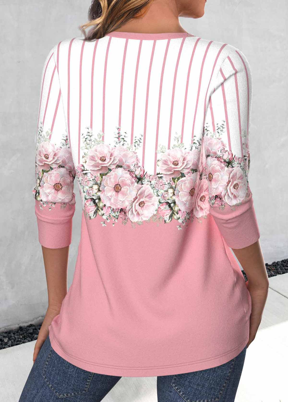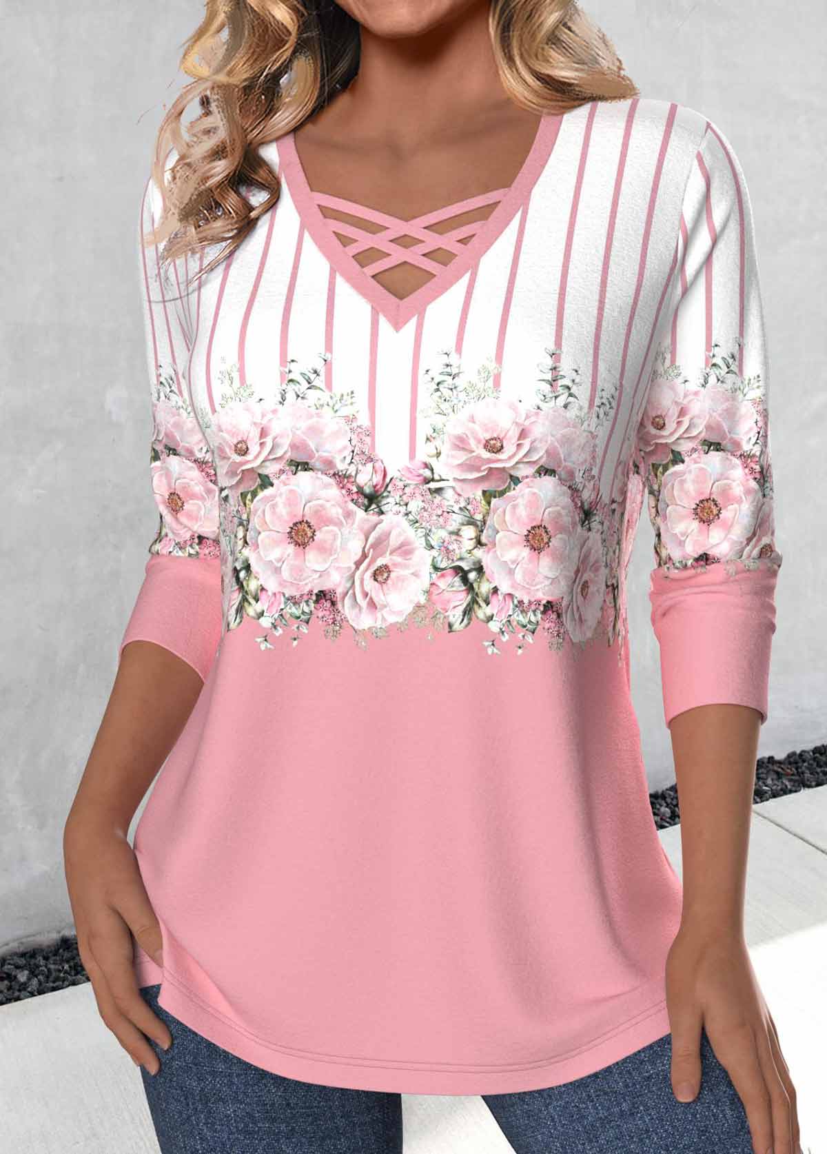 SALE Floral Print Criss Cross Pink Long Sleeve T Shirt Rosewe®