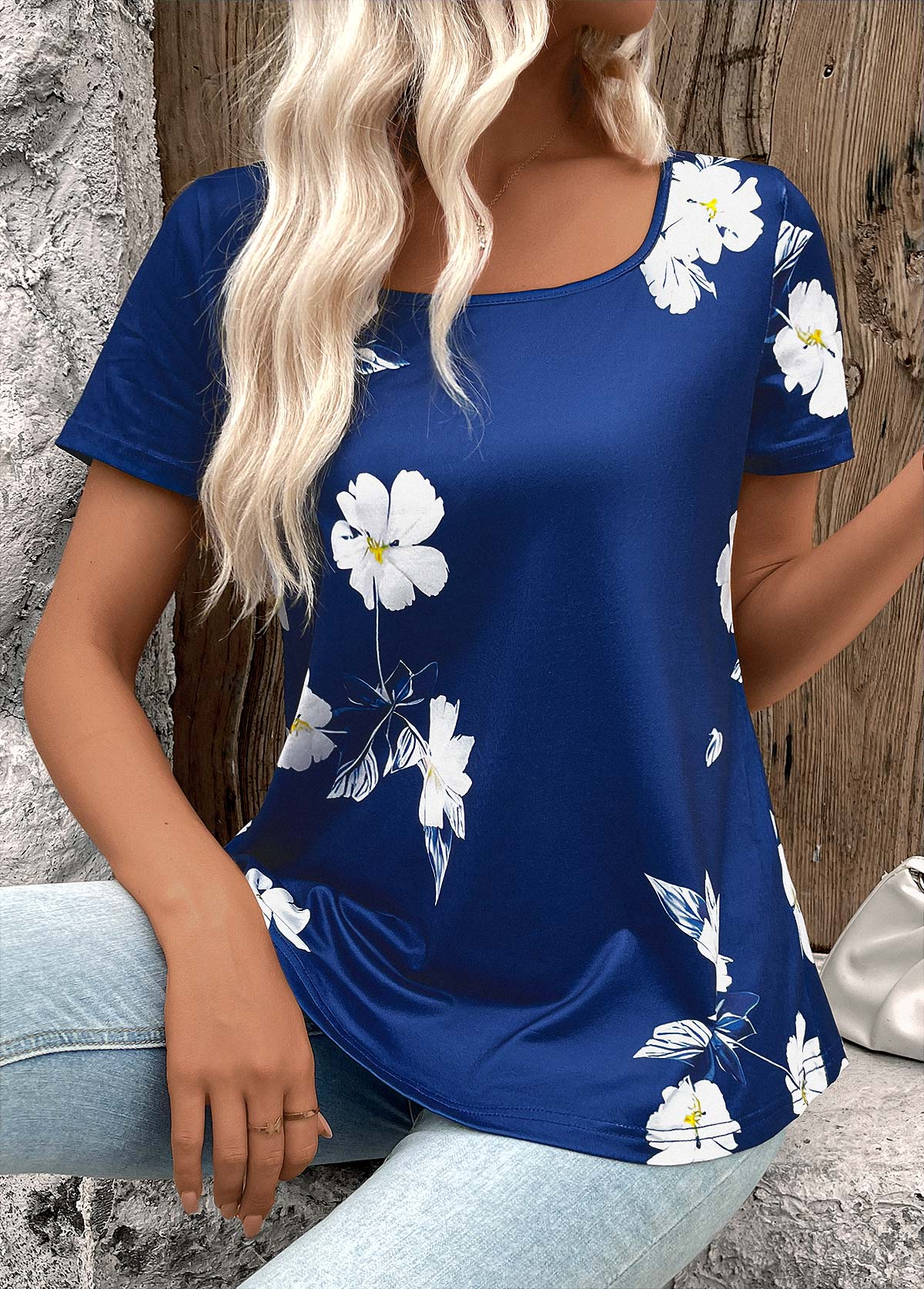 SALE Floral Print Dark Blue Short Sleeve T Shirt Rosewe®