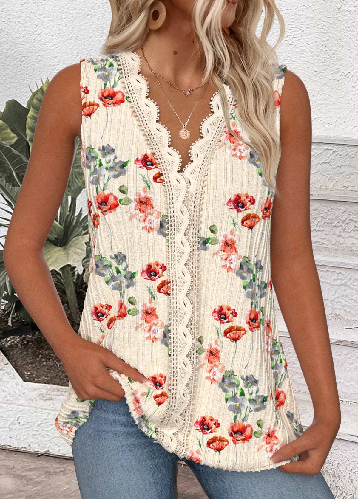 SALE Floral Print Embroidery Beige Sleeveless V Neck Tank Top Rosewe®