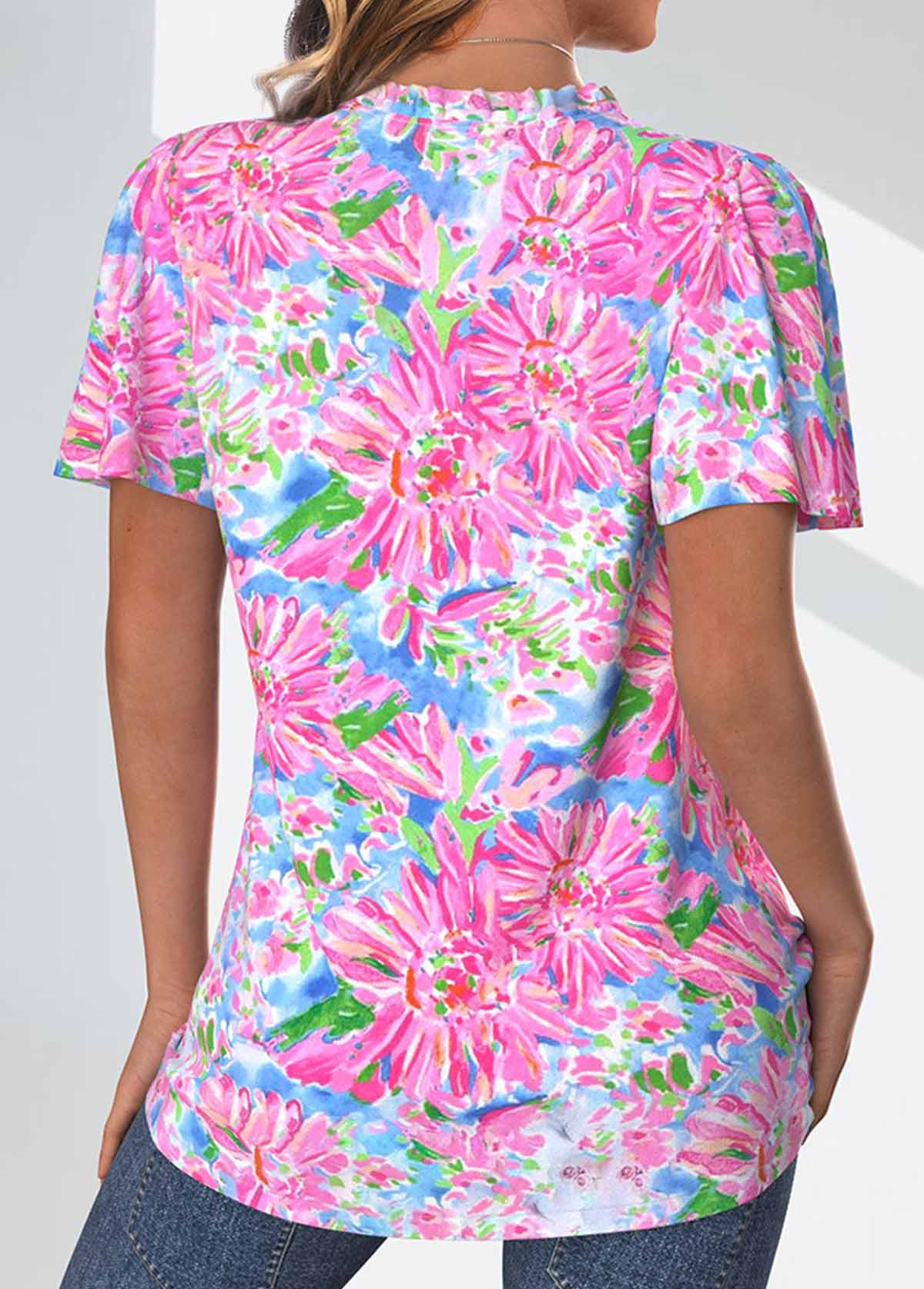 SALE Floral Print Frill Neon Pink Short Sleeve Blouse Rosewe®