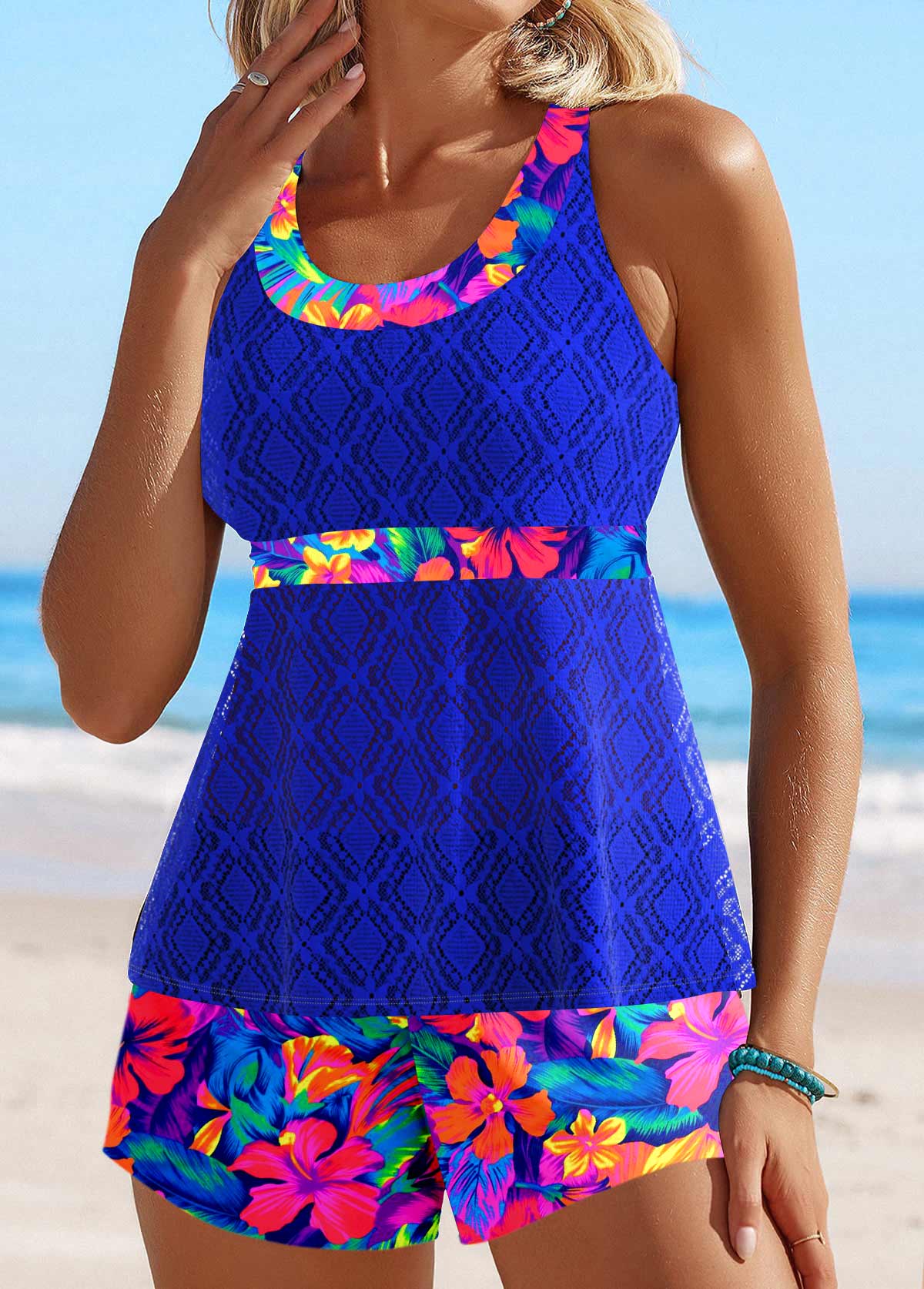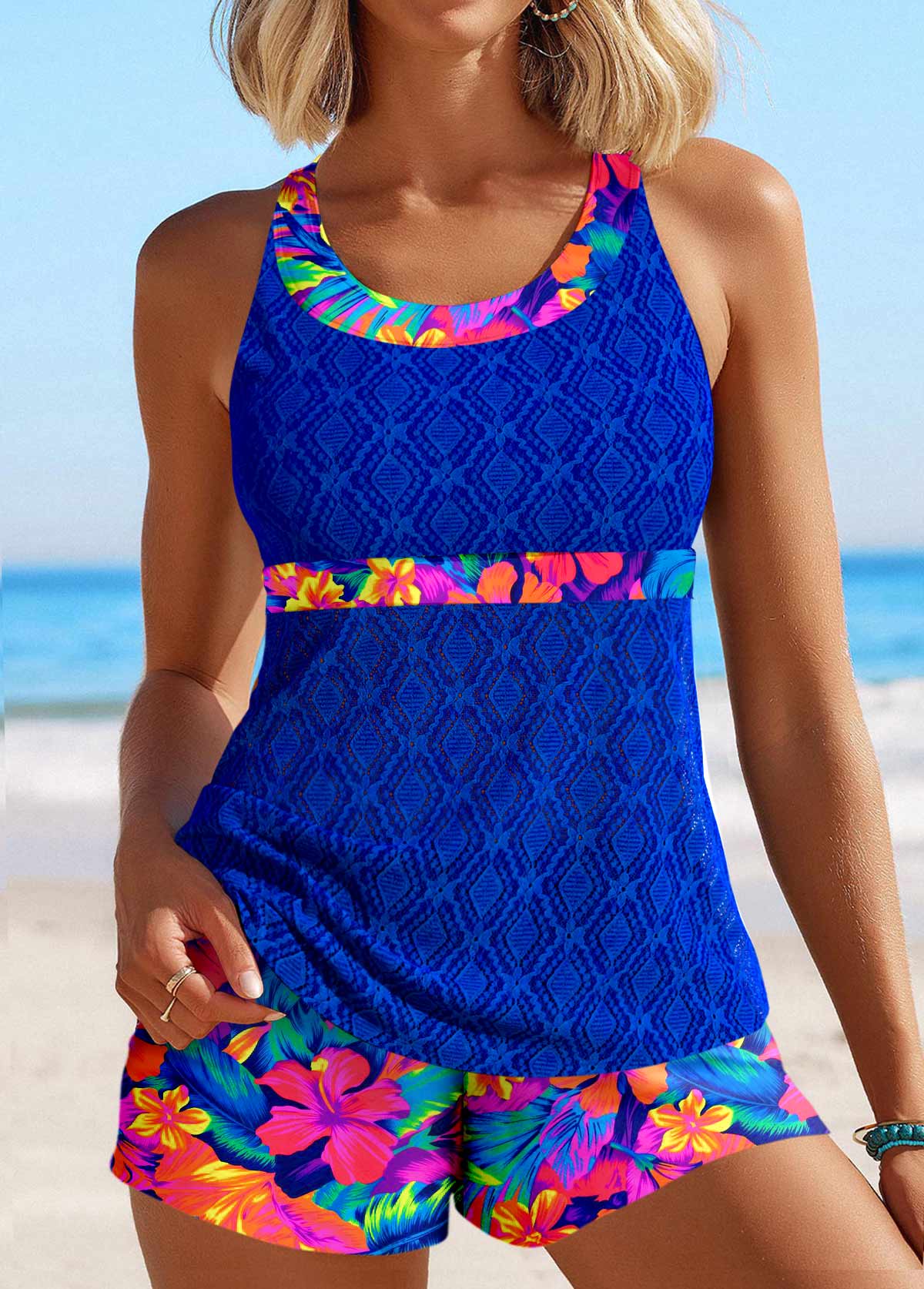 SALE Floral Print Lace Royal Blue Tankini Set Rosewe®