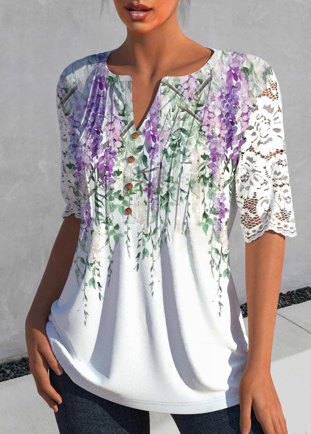 SALE Floral Print Lace White Half Sleeve Split Neck Blouse Rosewe®