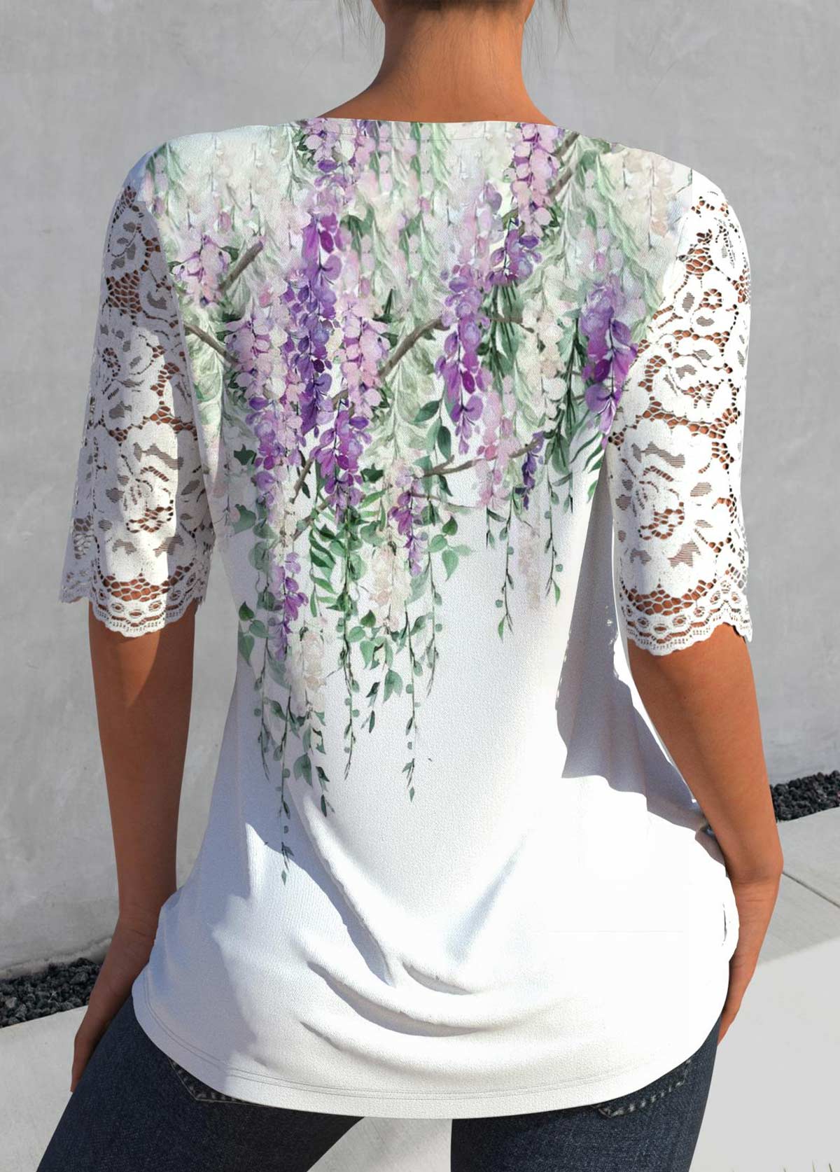 • Floral Print Lace White Half Sleeve Split Neck Blouse