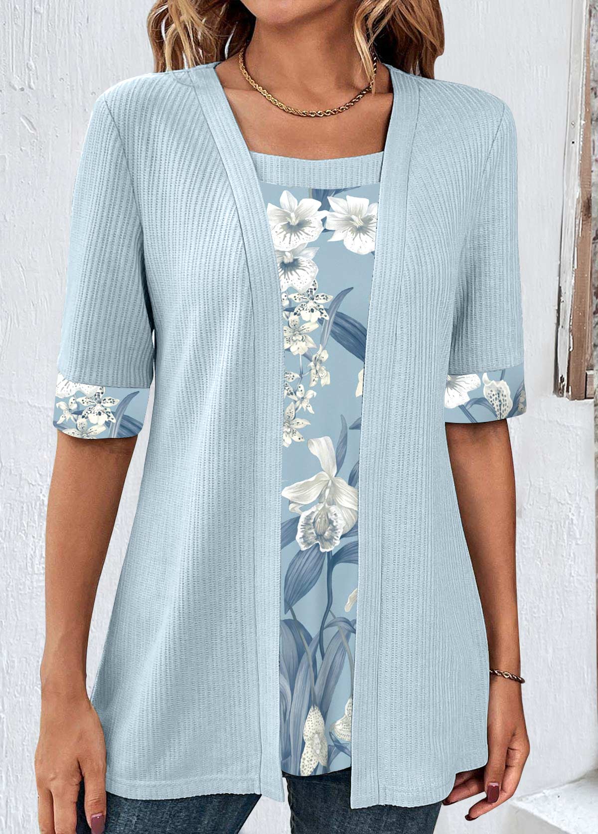 SALE Floral Print Light Blue Fake Two Piece Twinset Rosewe®