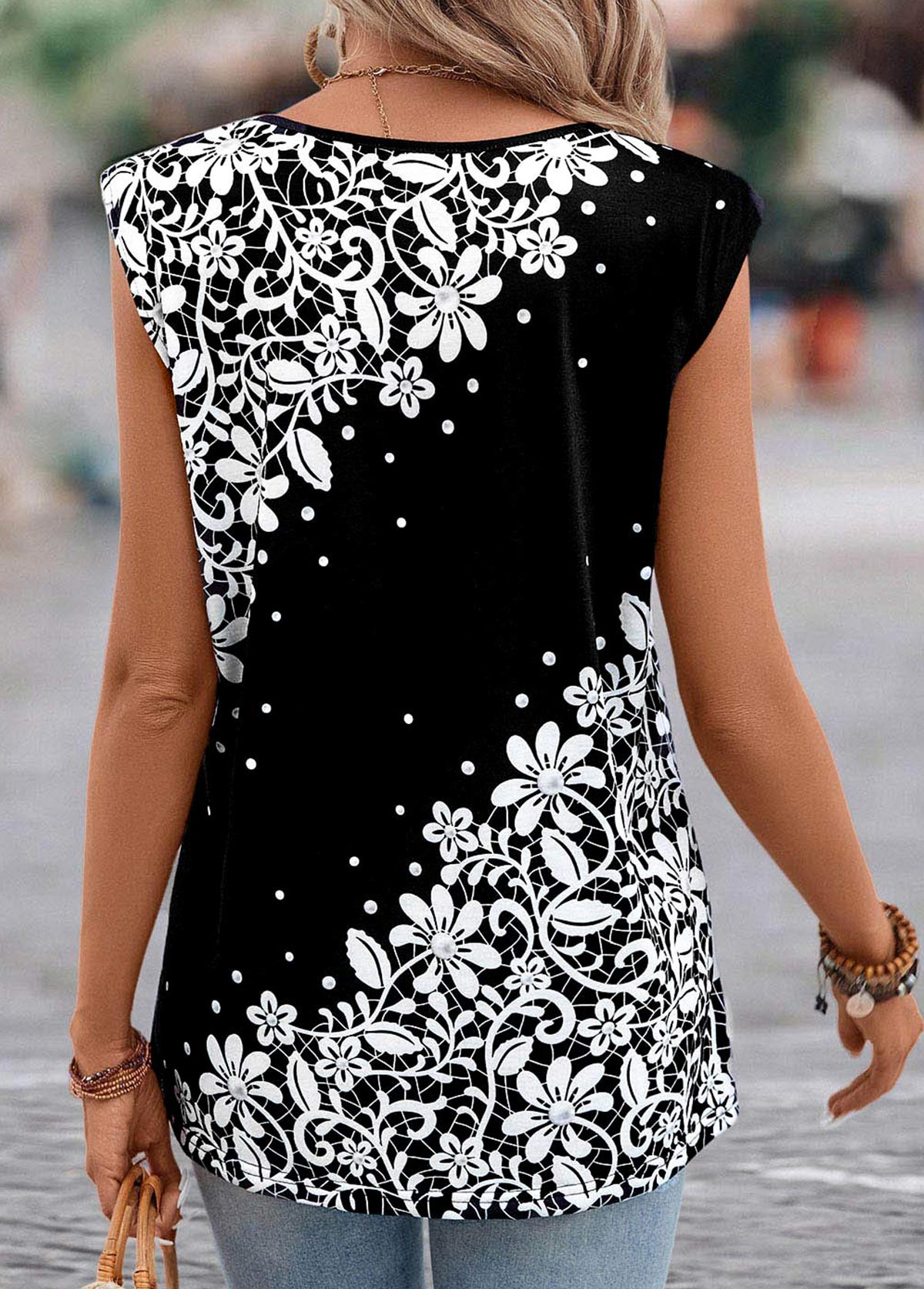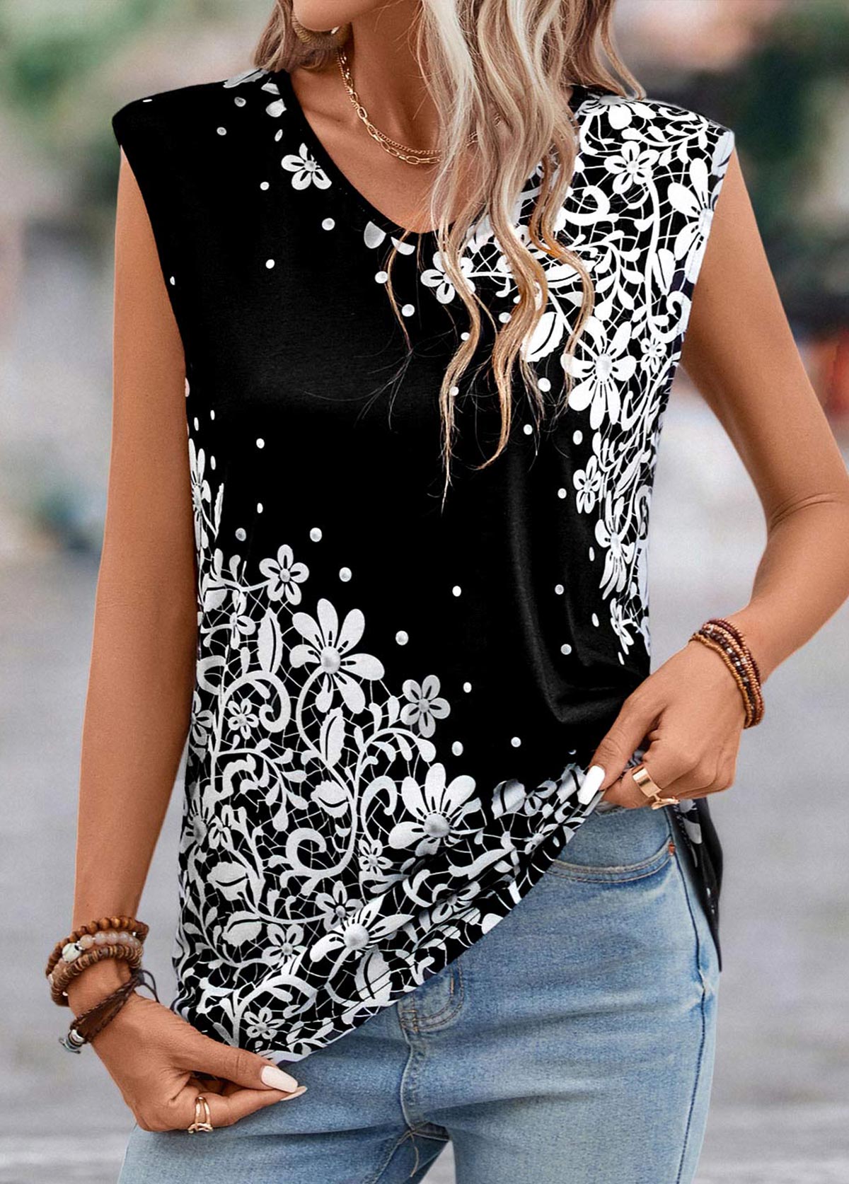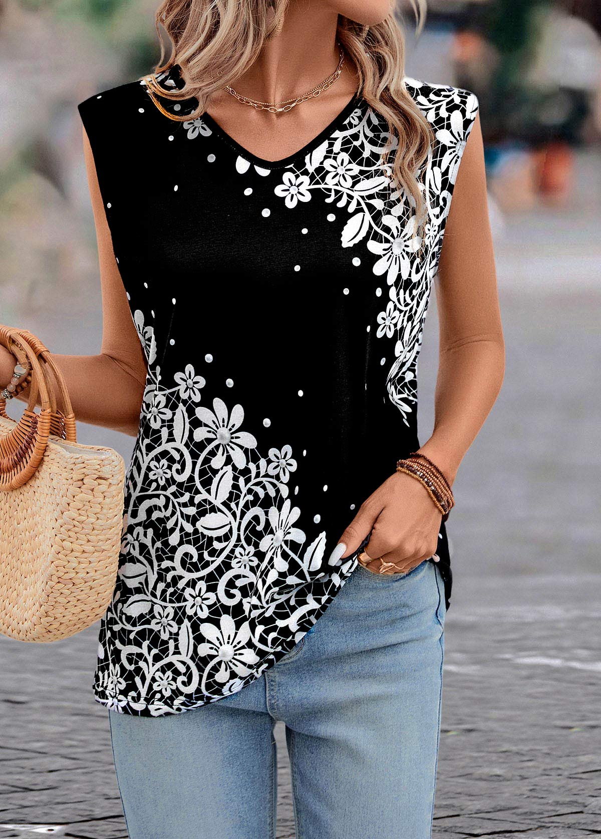 SALE Floral Print Lightweight Black V Neck T Shirt Rosewe®