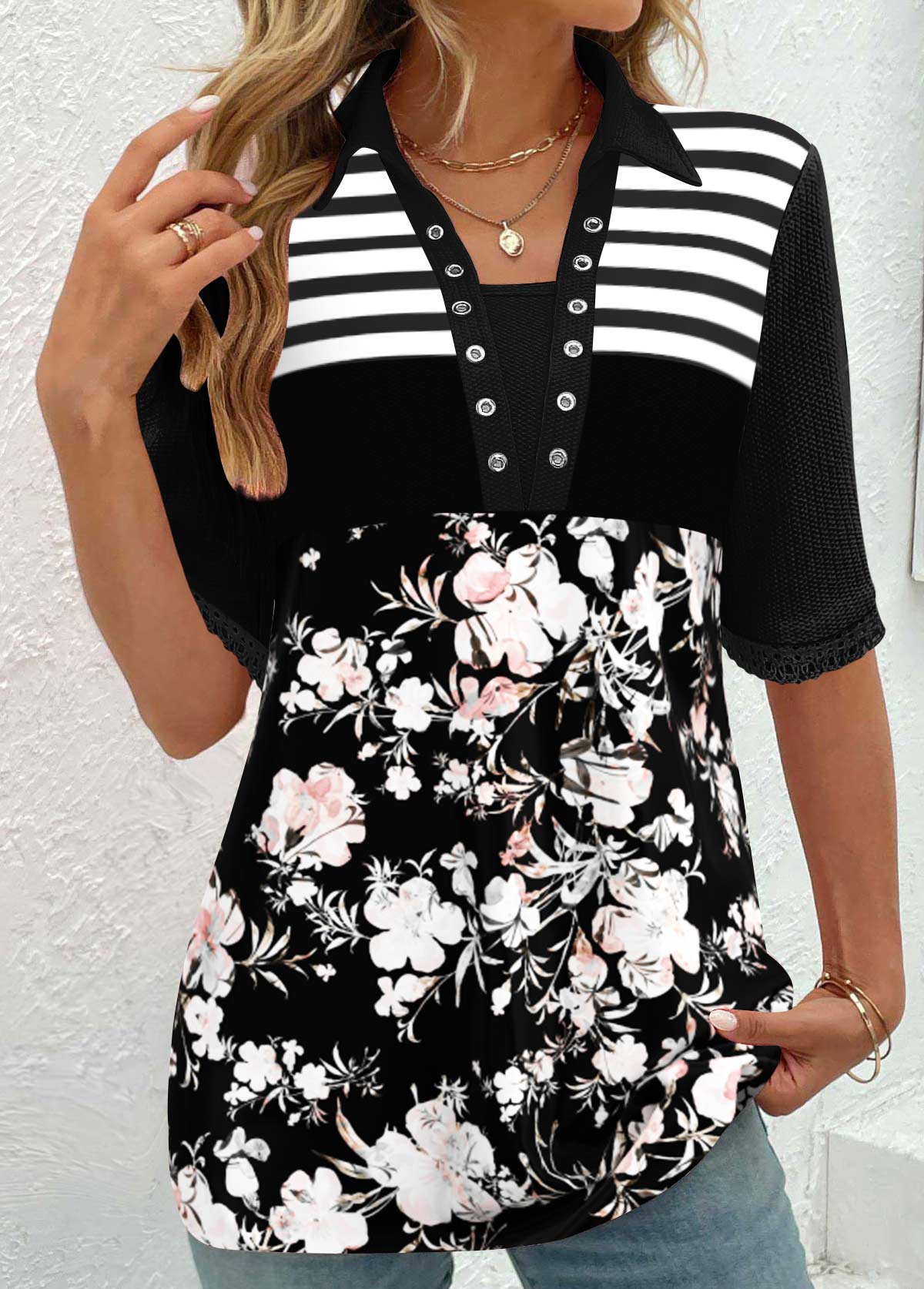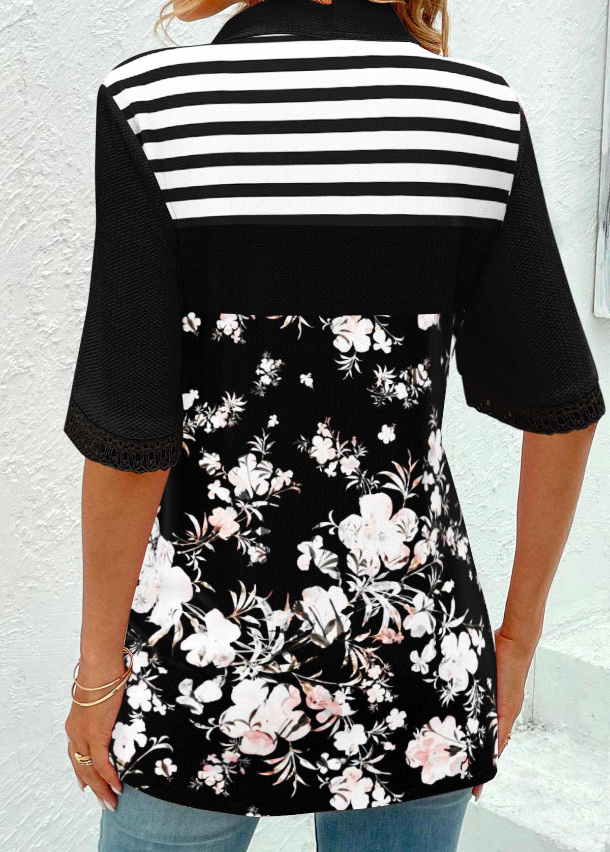 SALE Floral Print Patchwork Black Half Sleeve T Shirt Rosewe®