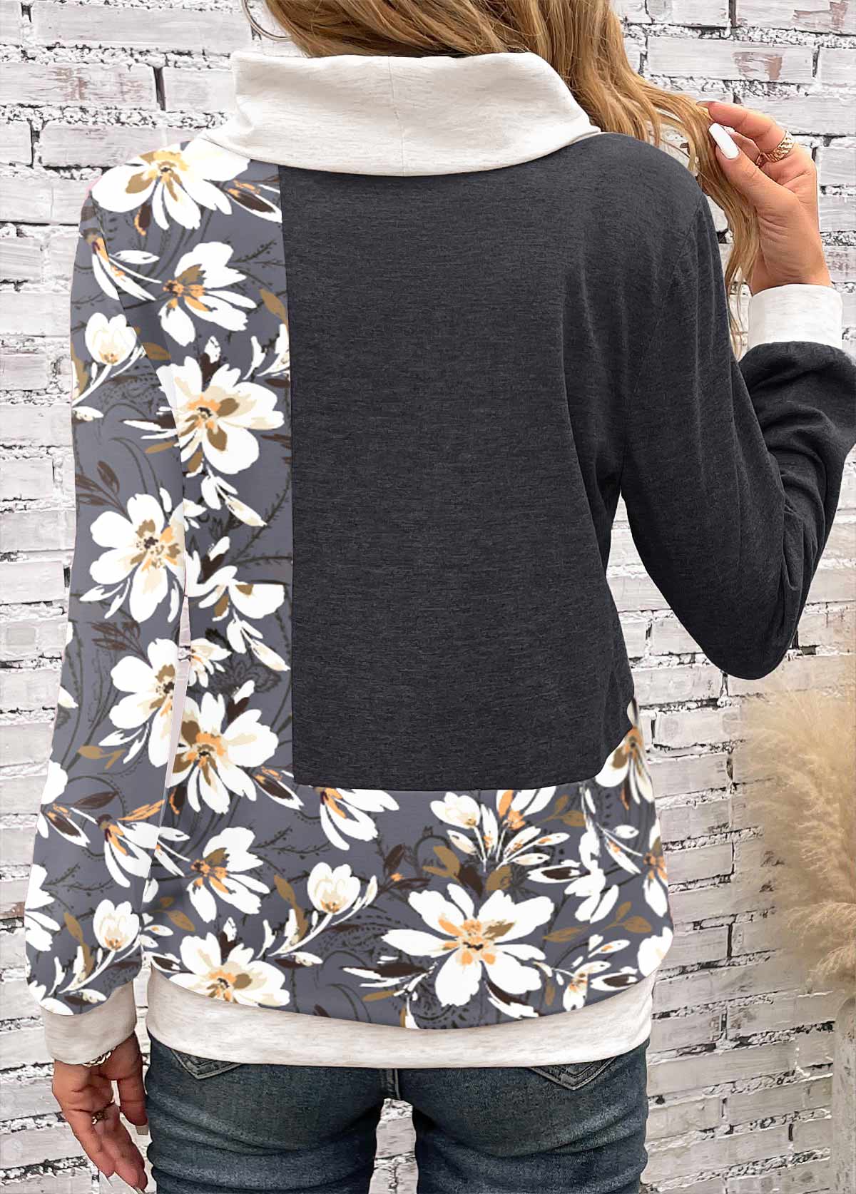 SALE Floral Print Patchwork Dark Grey Cowl Neck Sweatshirt Rosewe®