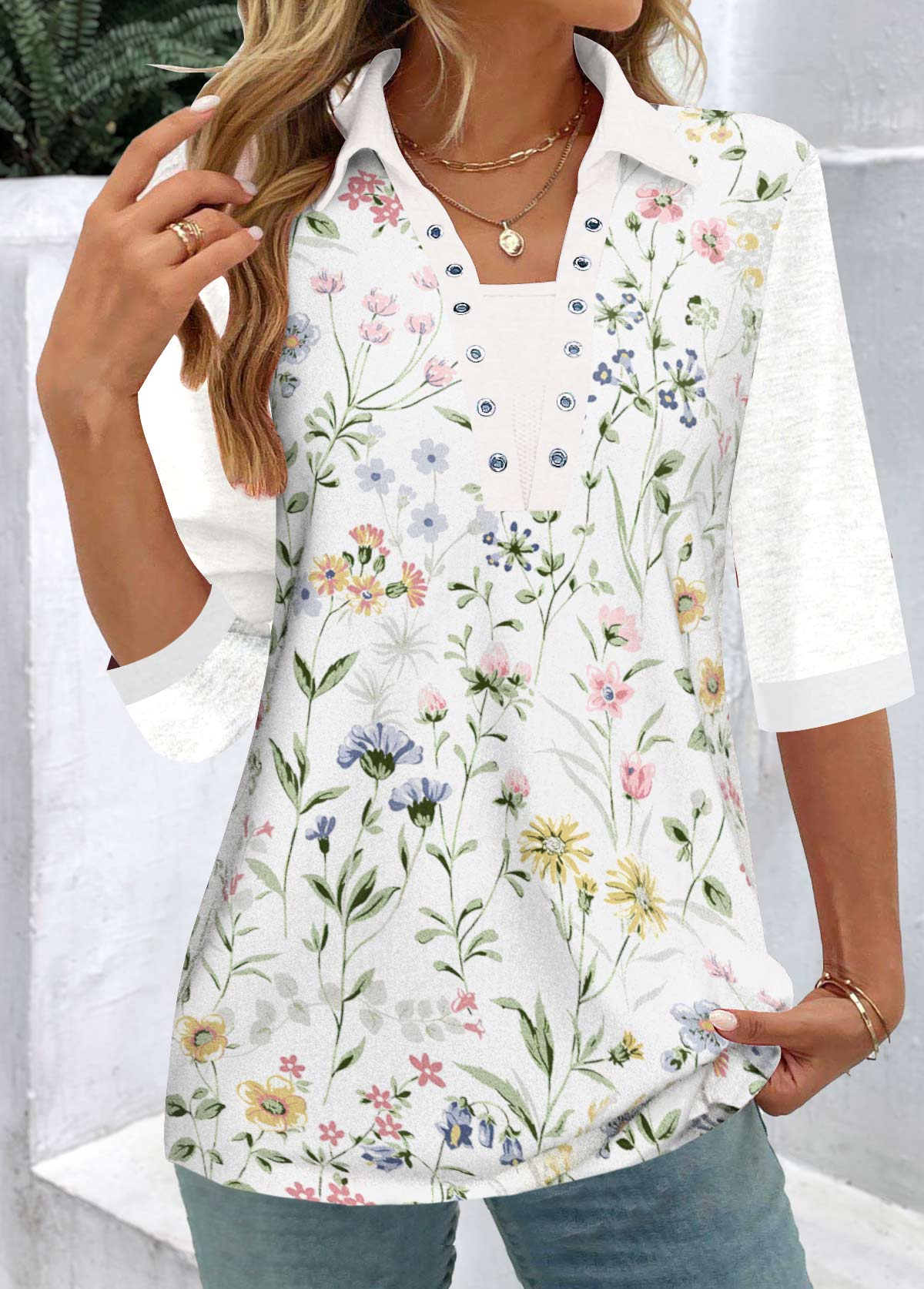 • Floral Print Patchwork White Half Sleeve Shirt Collar Blouse