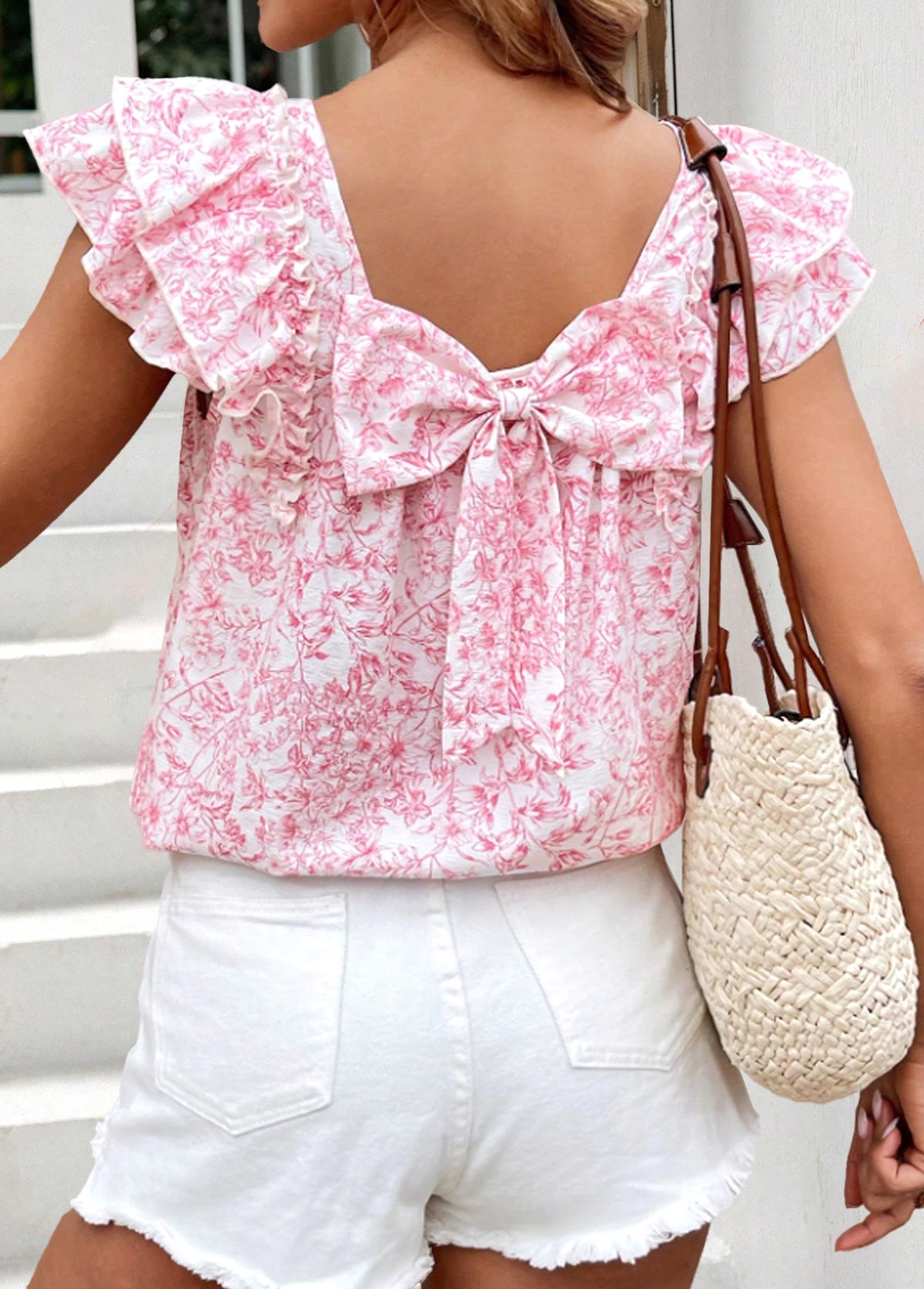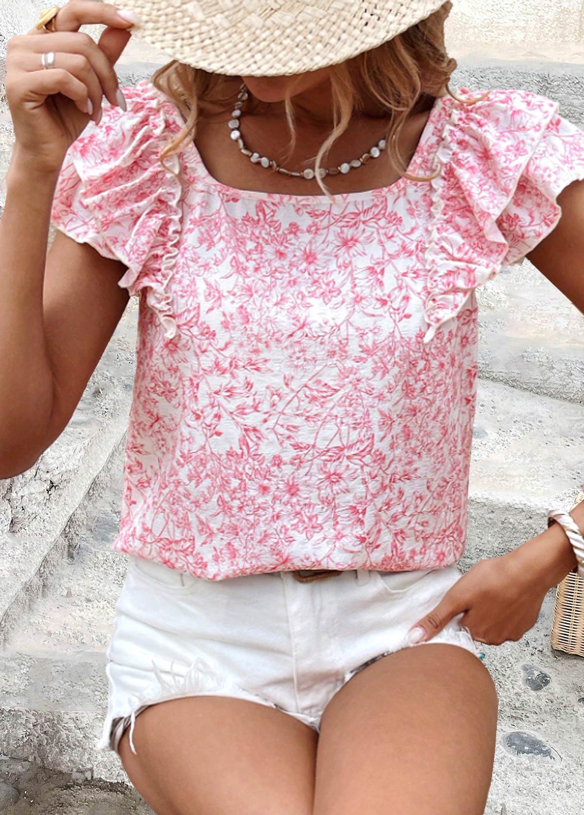 • Floral Print Pink Short Sleeve Square Neck T Shirt
