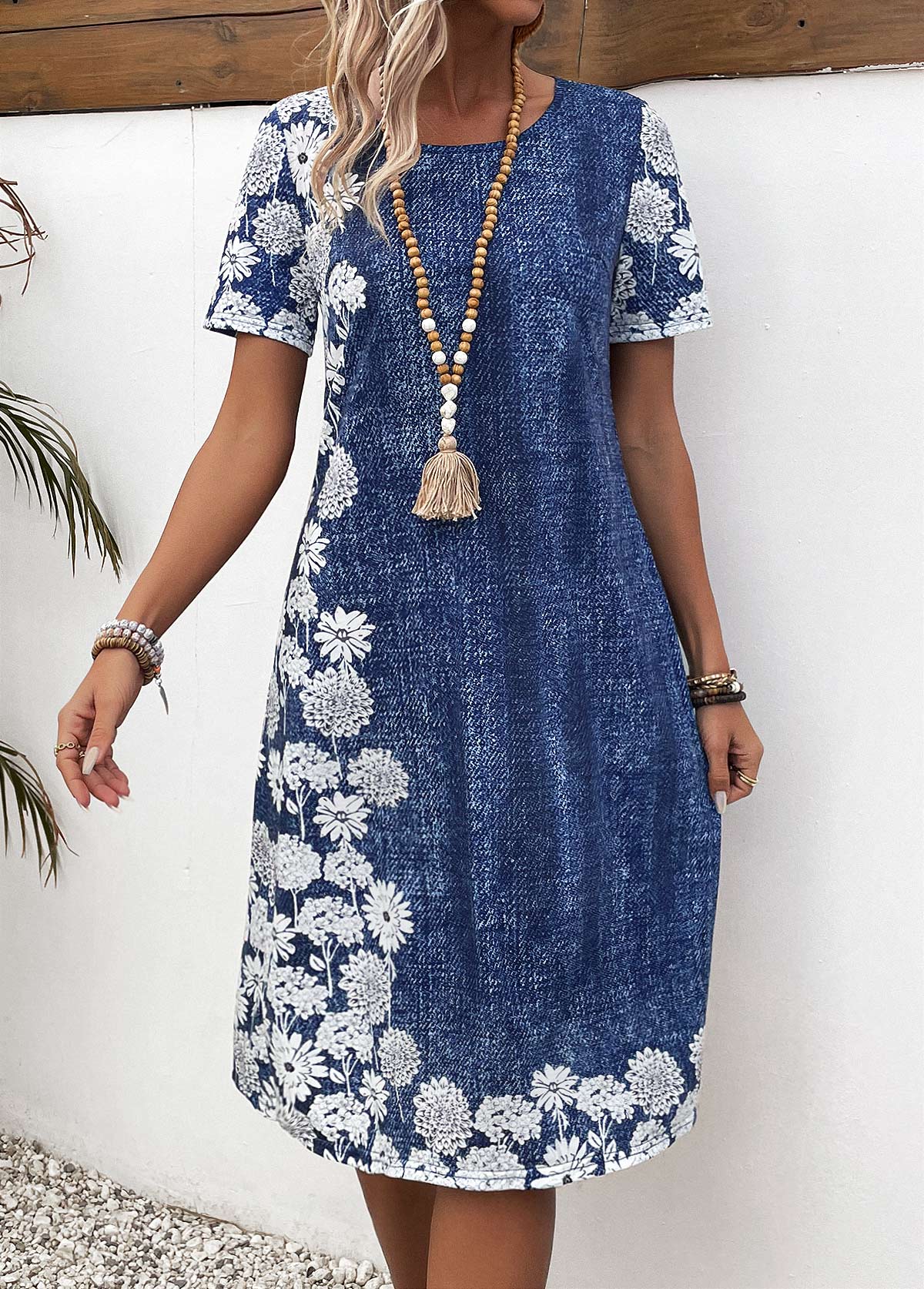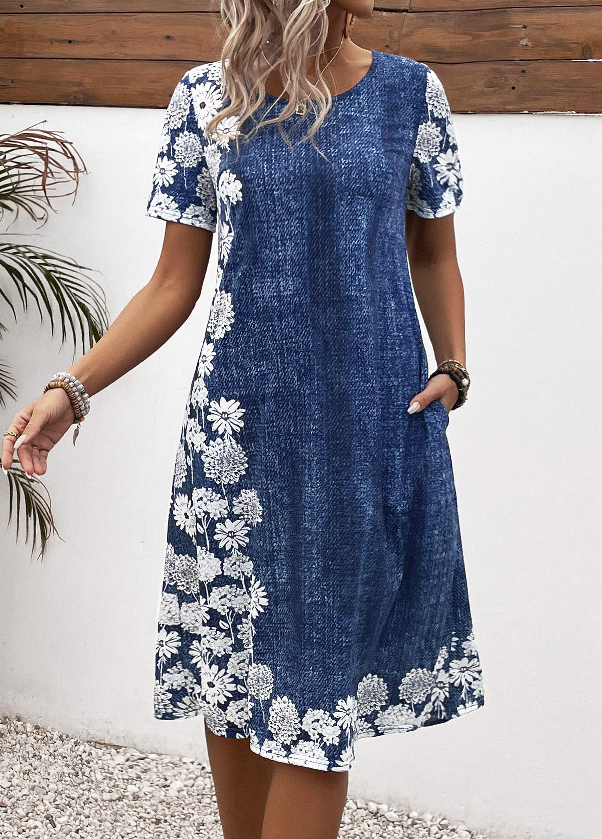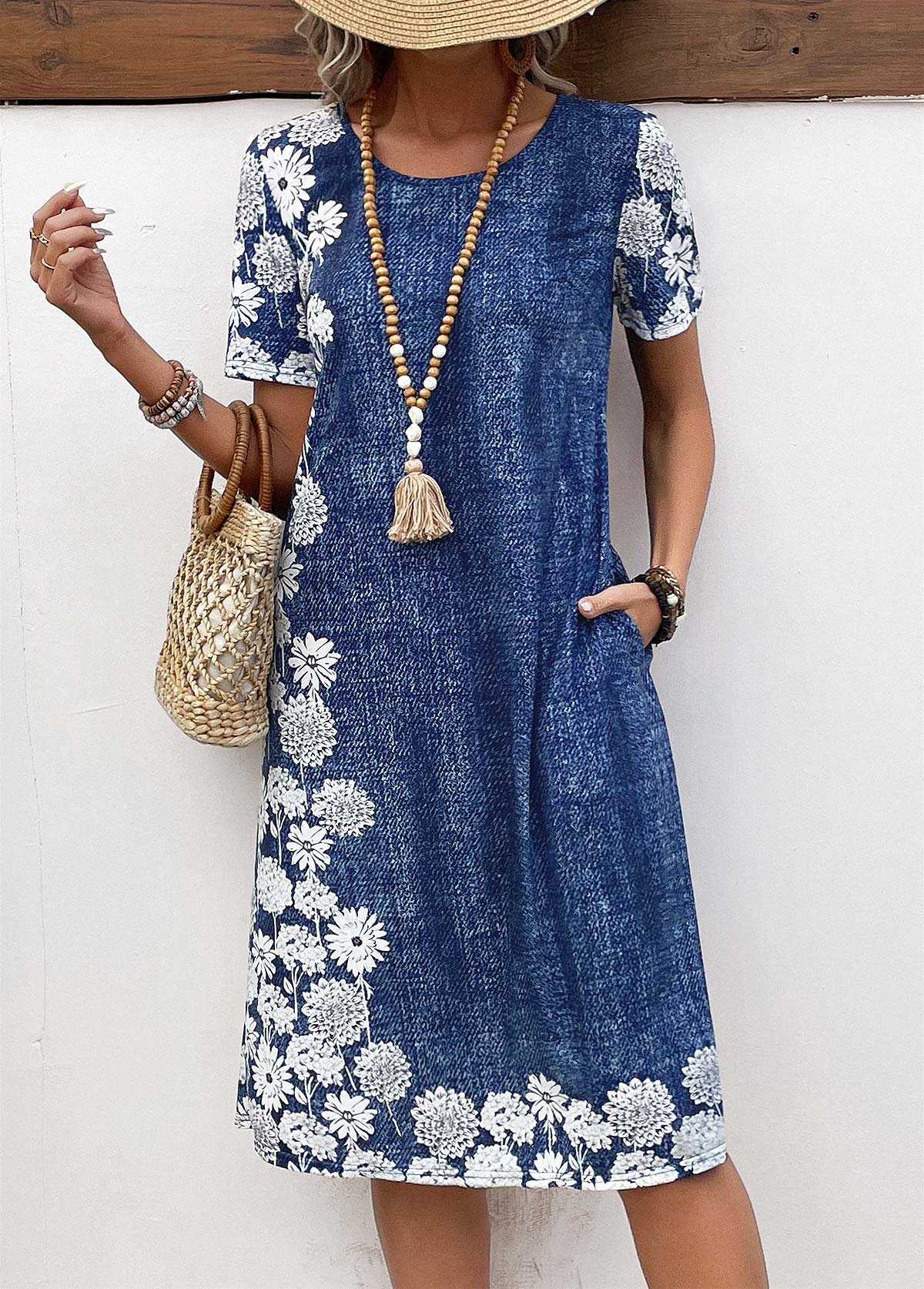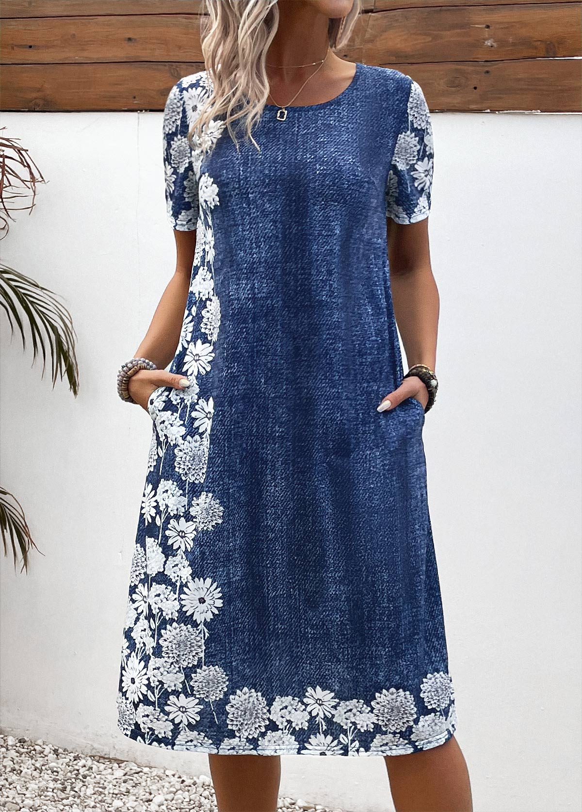 SALE Floral Print Pocket Denim Blue A Line Dress Rosewe®