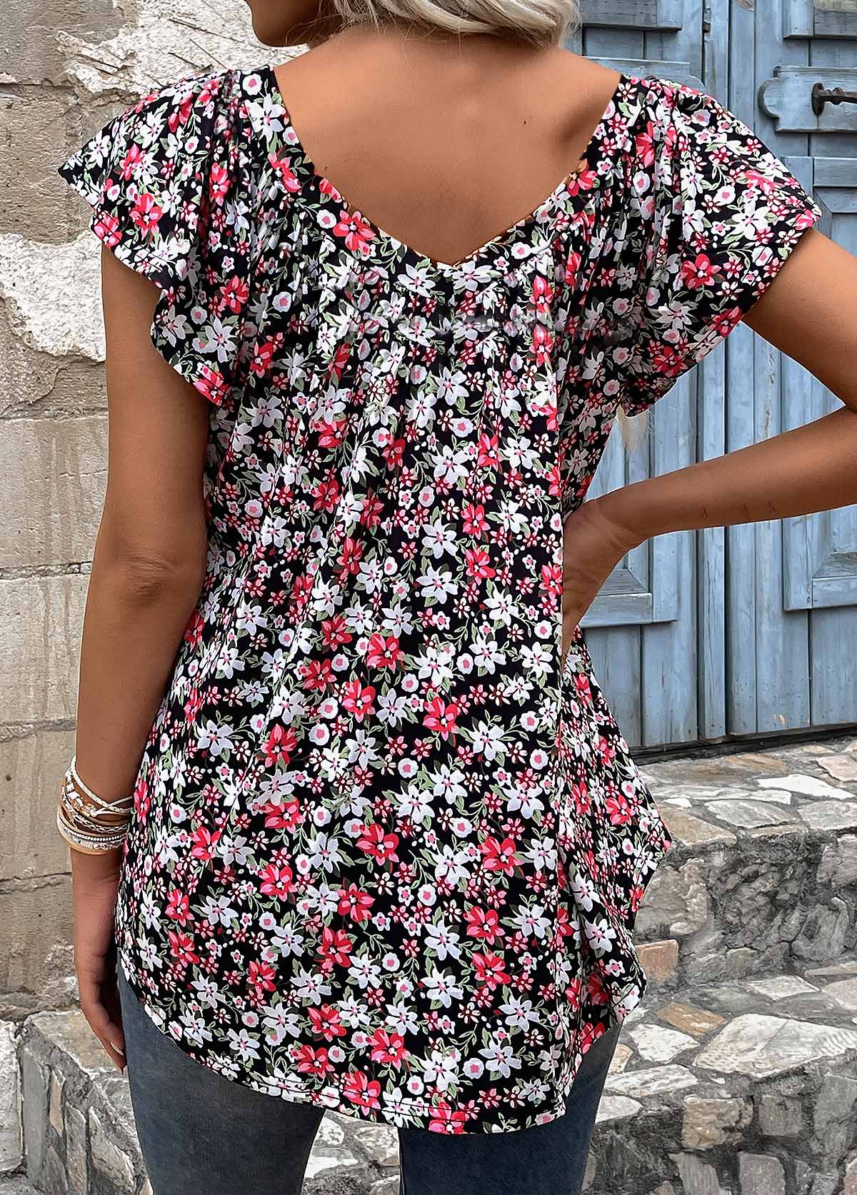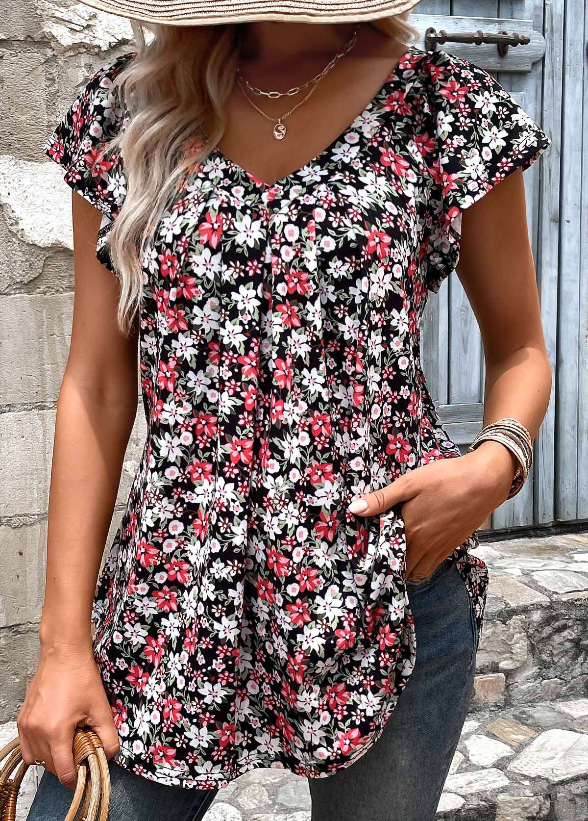 SALE Floral Print Ruched Black Short Sleeve T Shirt Rosewe®