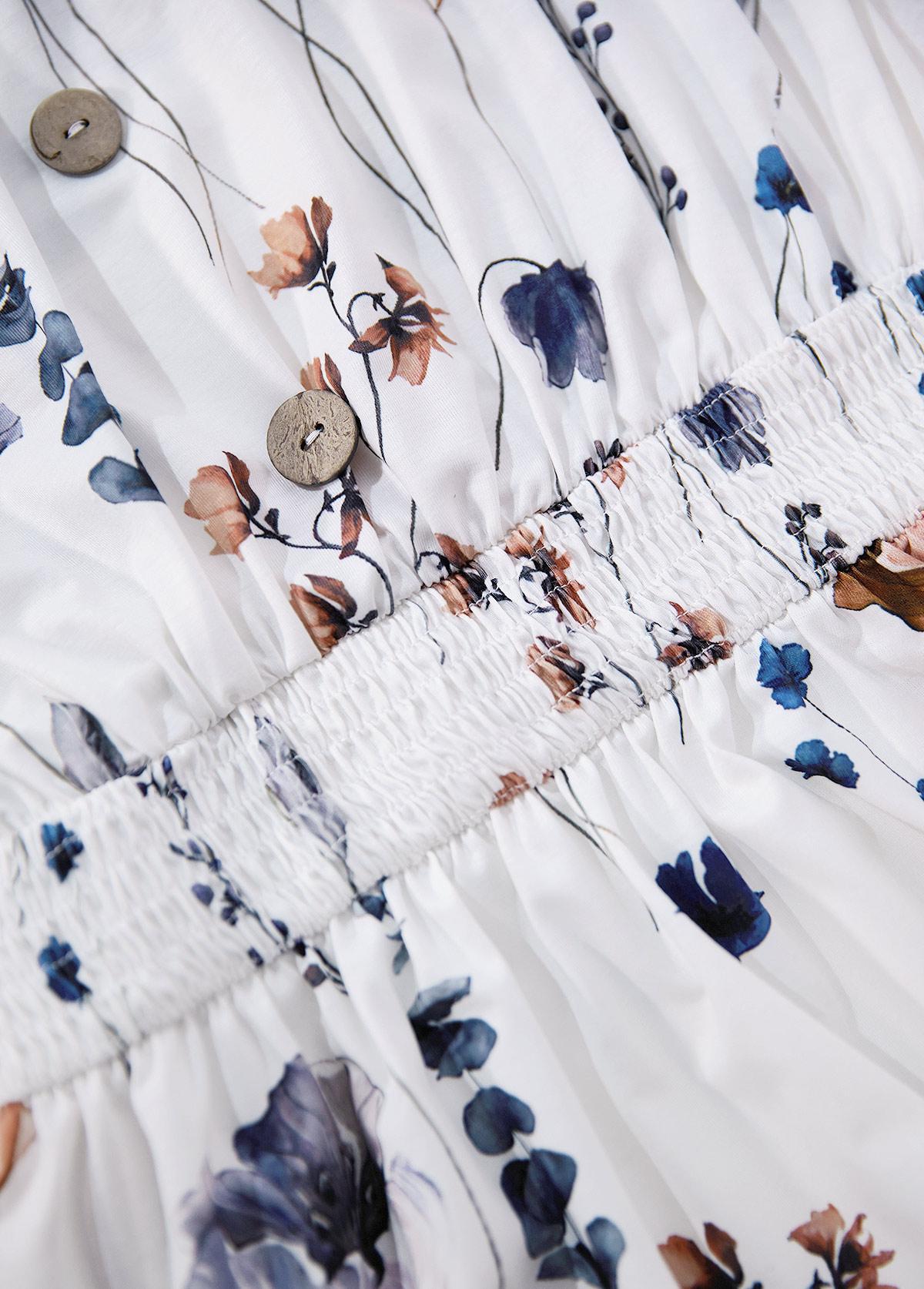 • Floral Print Smocked White Short Sleeveless V Neck Dress