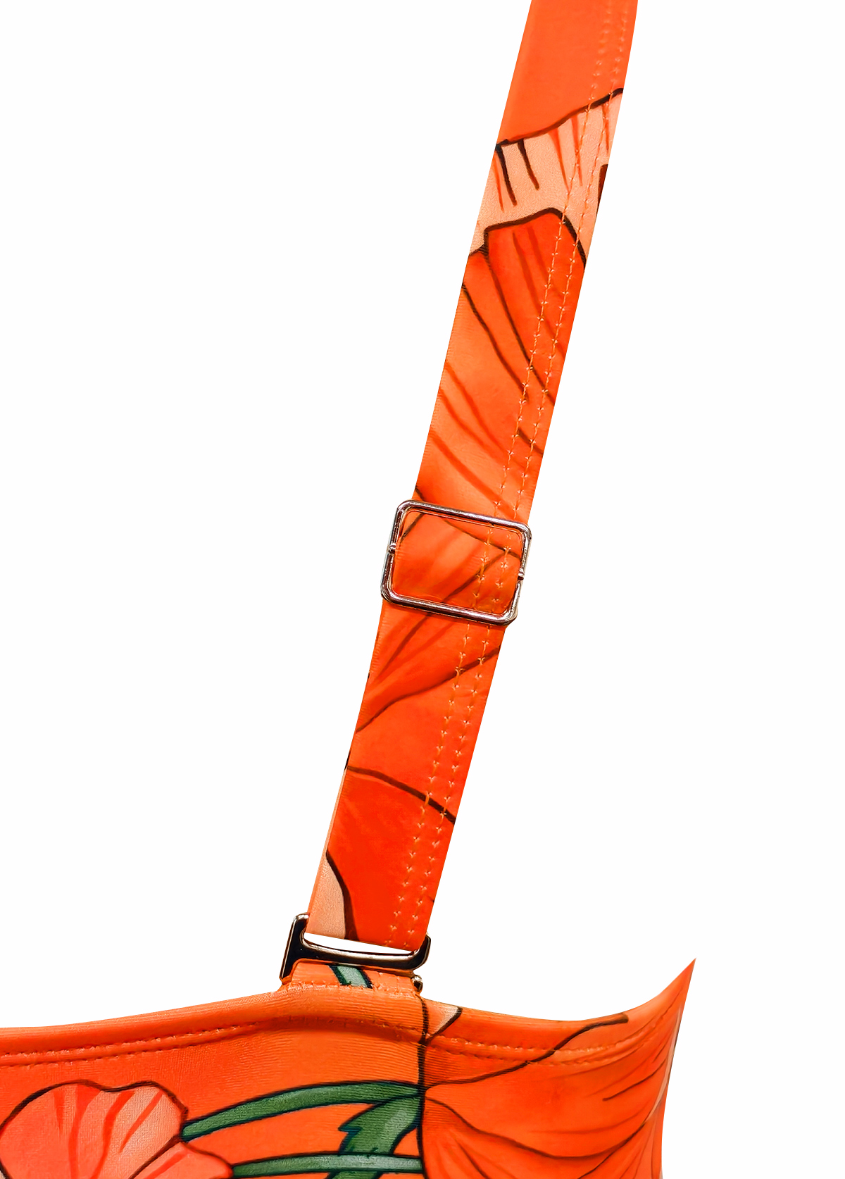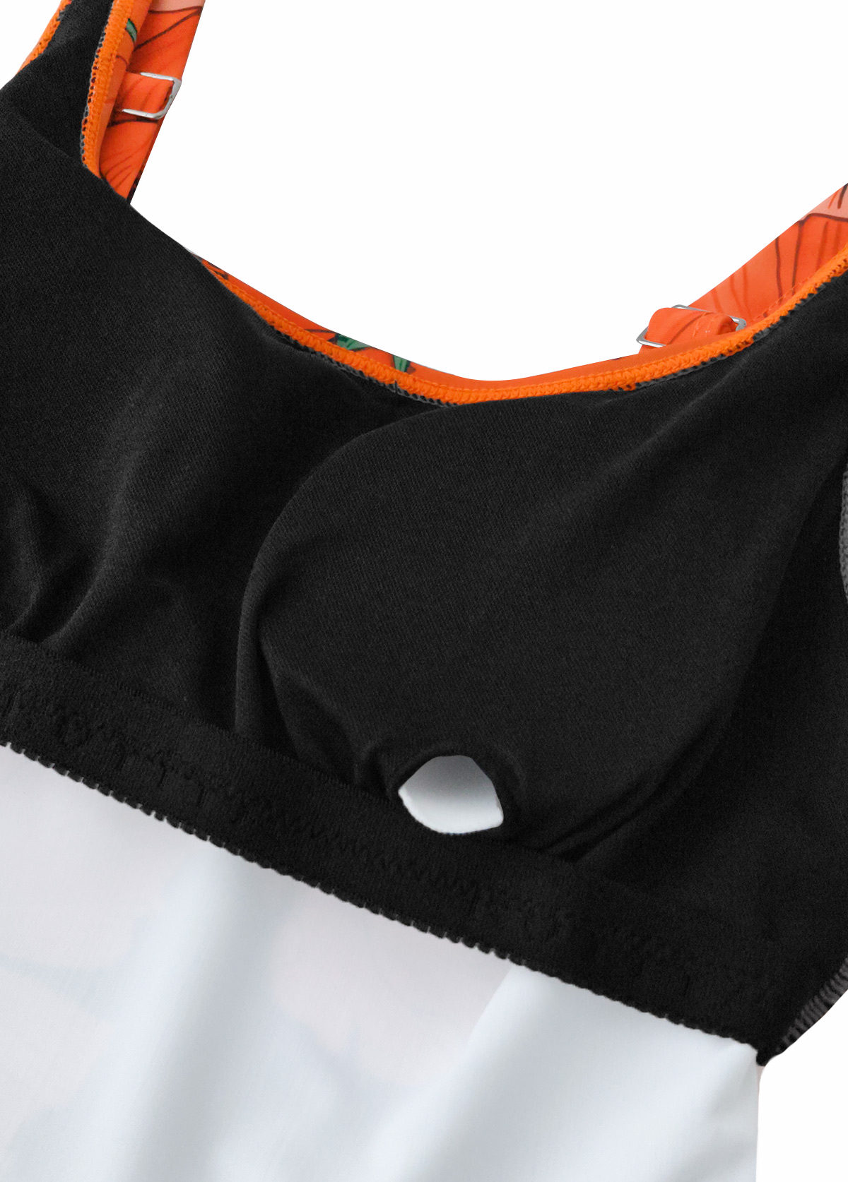 • Get ready to turn heads in our vibrant one-piece swimsuit! With its bold orange floral print and playful tie detail at the bottom, this swimsuit is anything but ordinary. Featuring high elasticity and adjustable straps, it ensures a comfortable fit for your beach adventures. Plus, removable padding adds versatility to your look. Perfect for a fun-filled vacation!