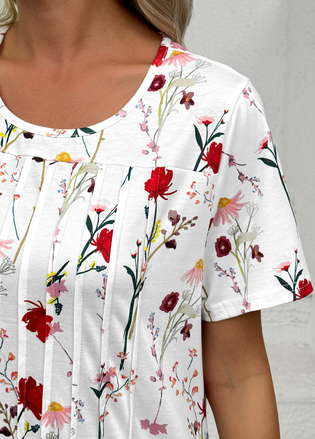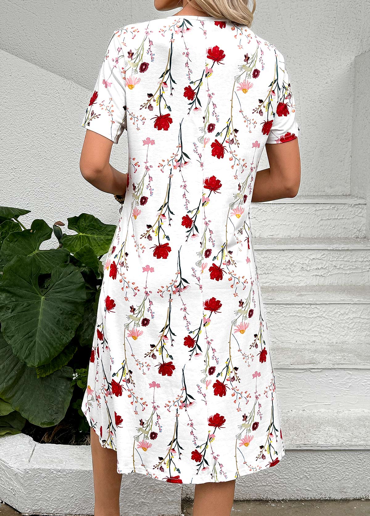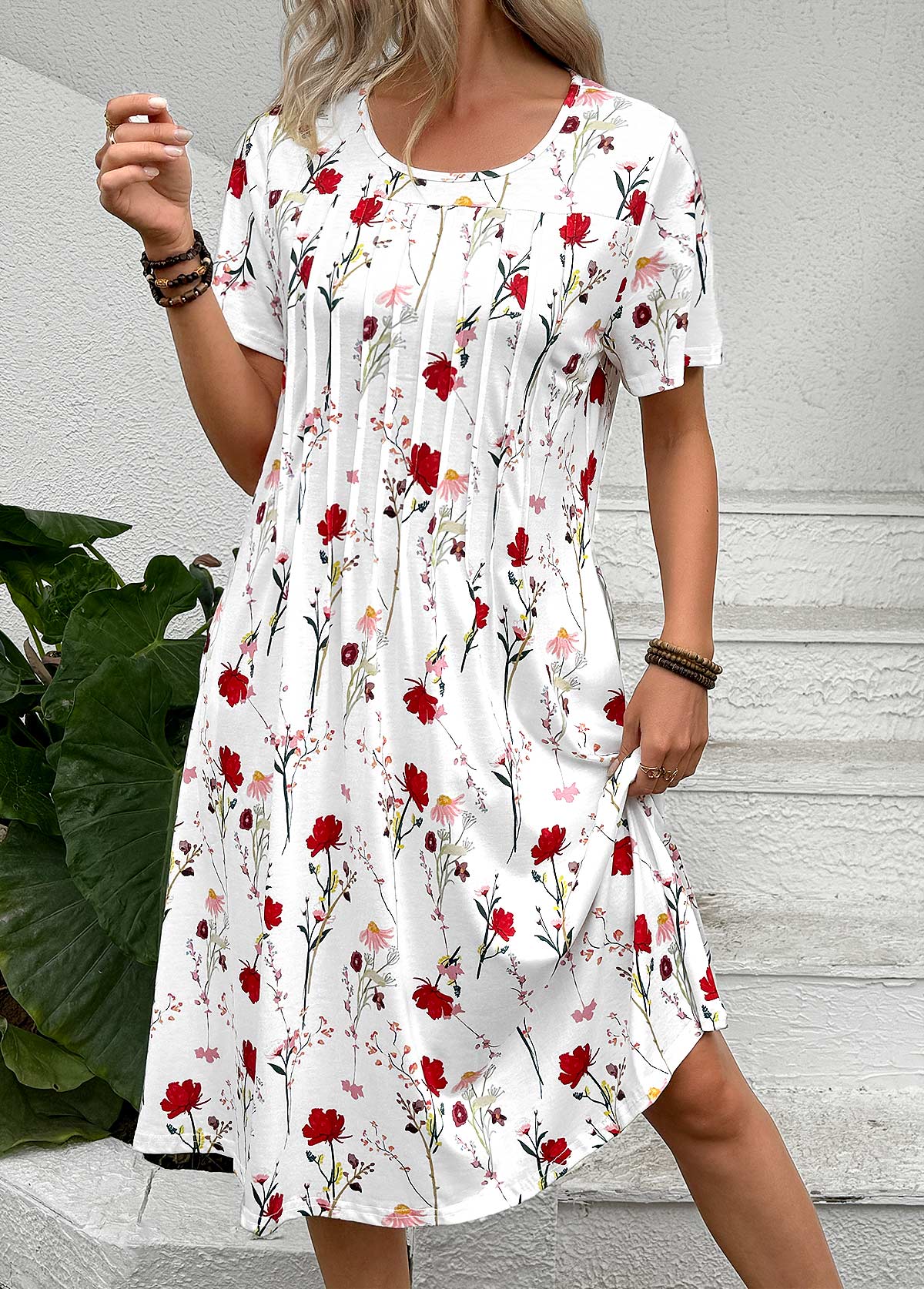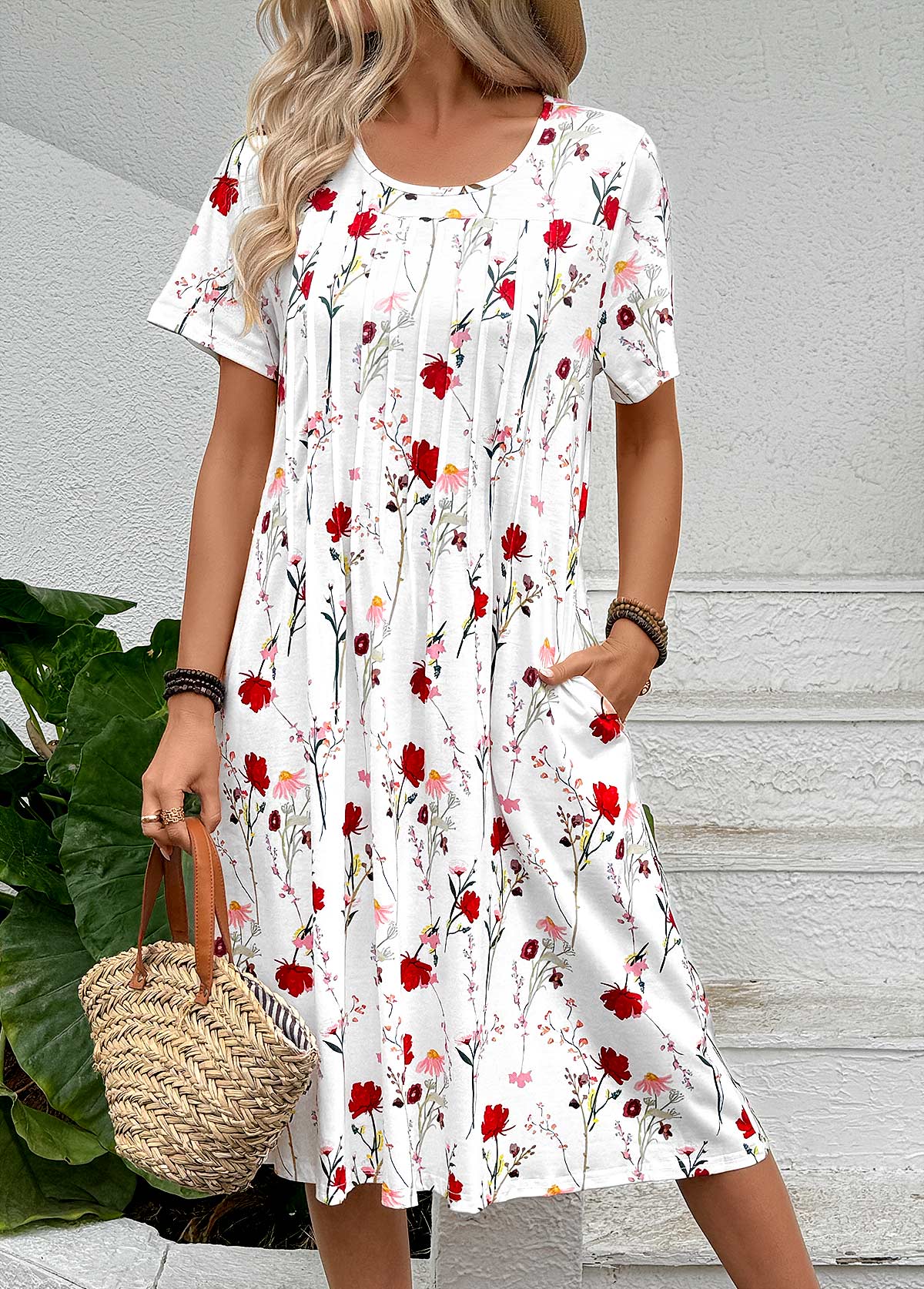 Floral Print Tuck Stitch White A Line Dress Rosewe®