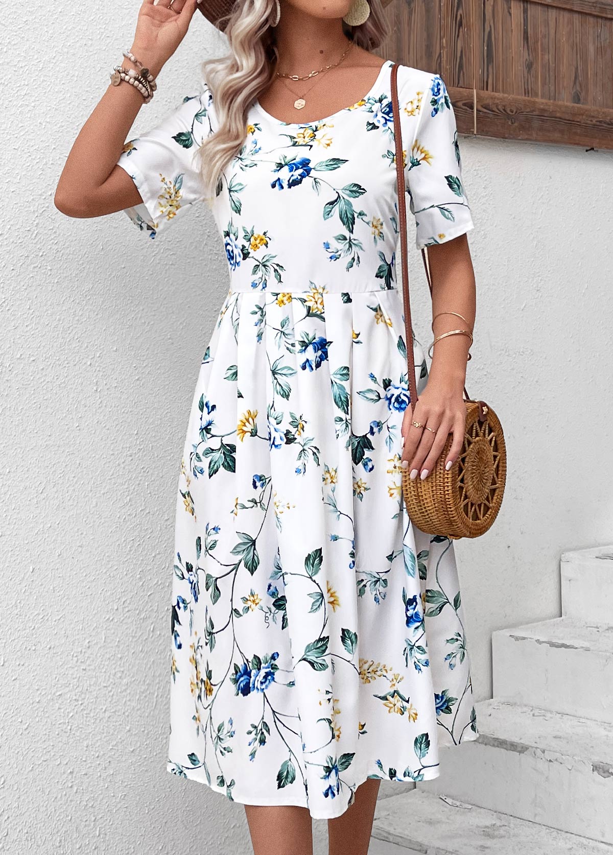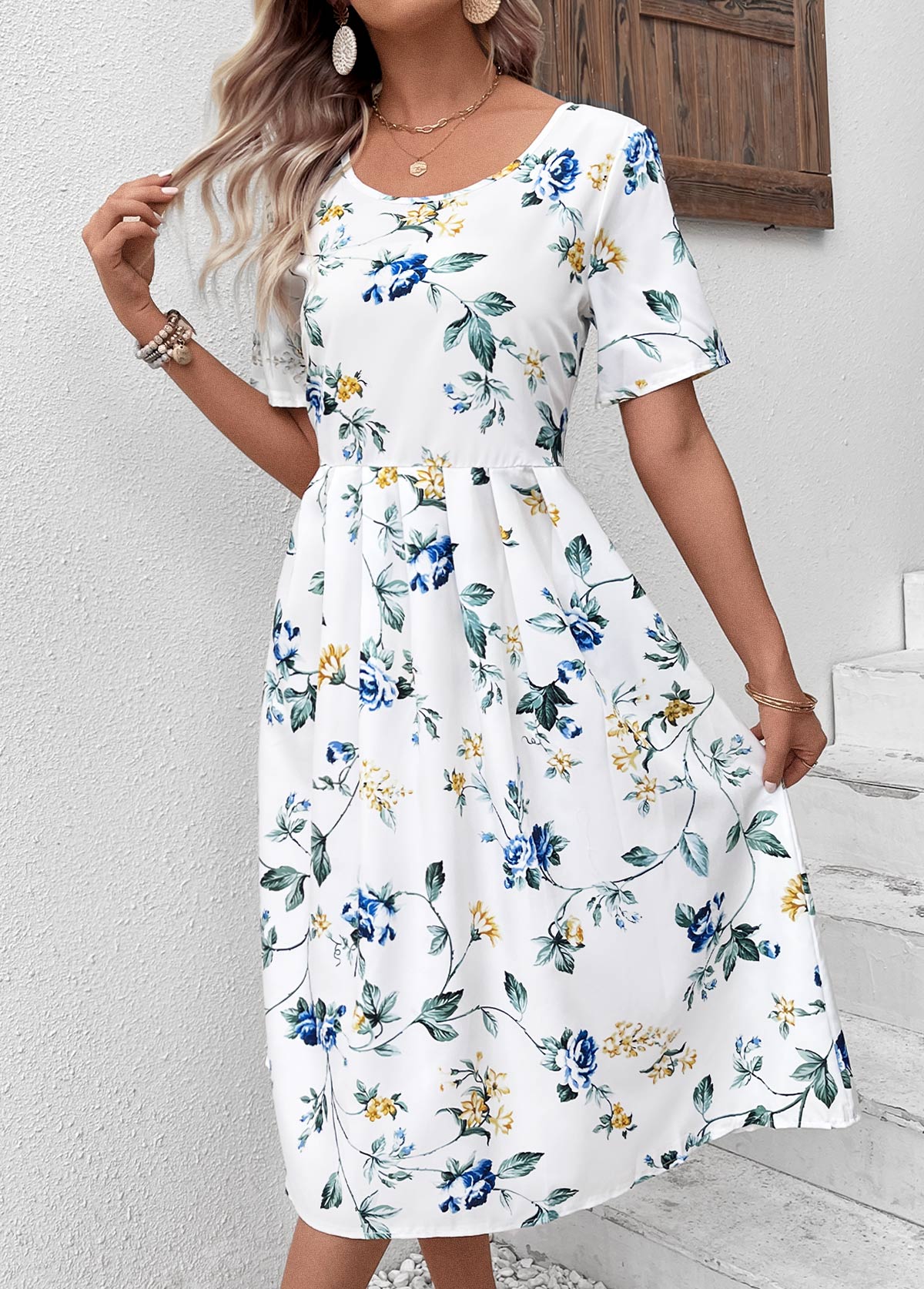 Floral Print White Short Sleeve Round Neck Dress Rosewe®