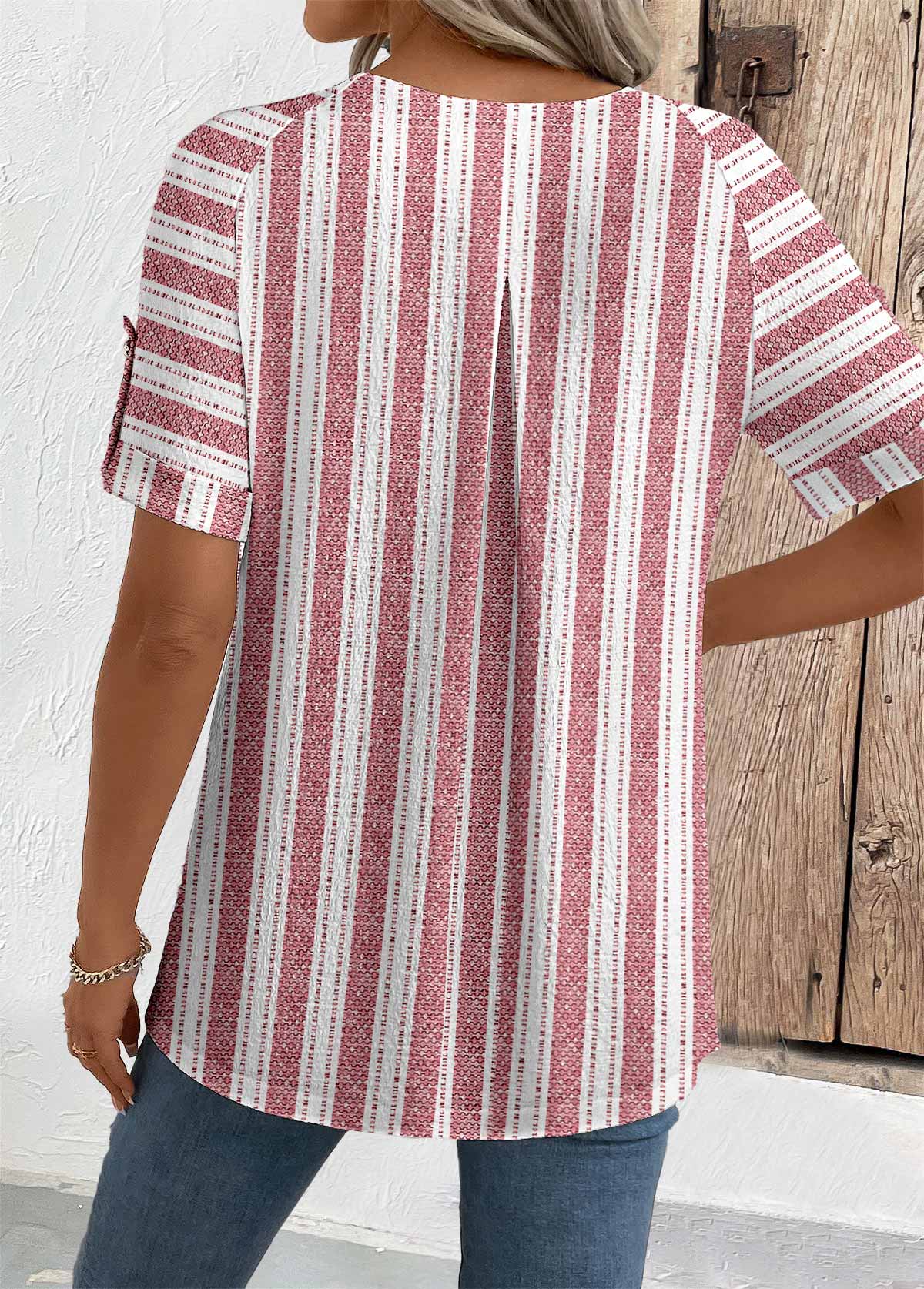Geometric Print Brick Red Short Sleeve Round Neck Blouse Rosewe®