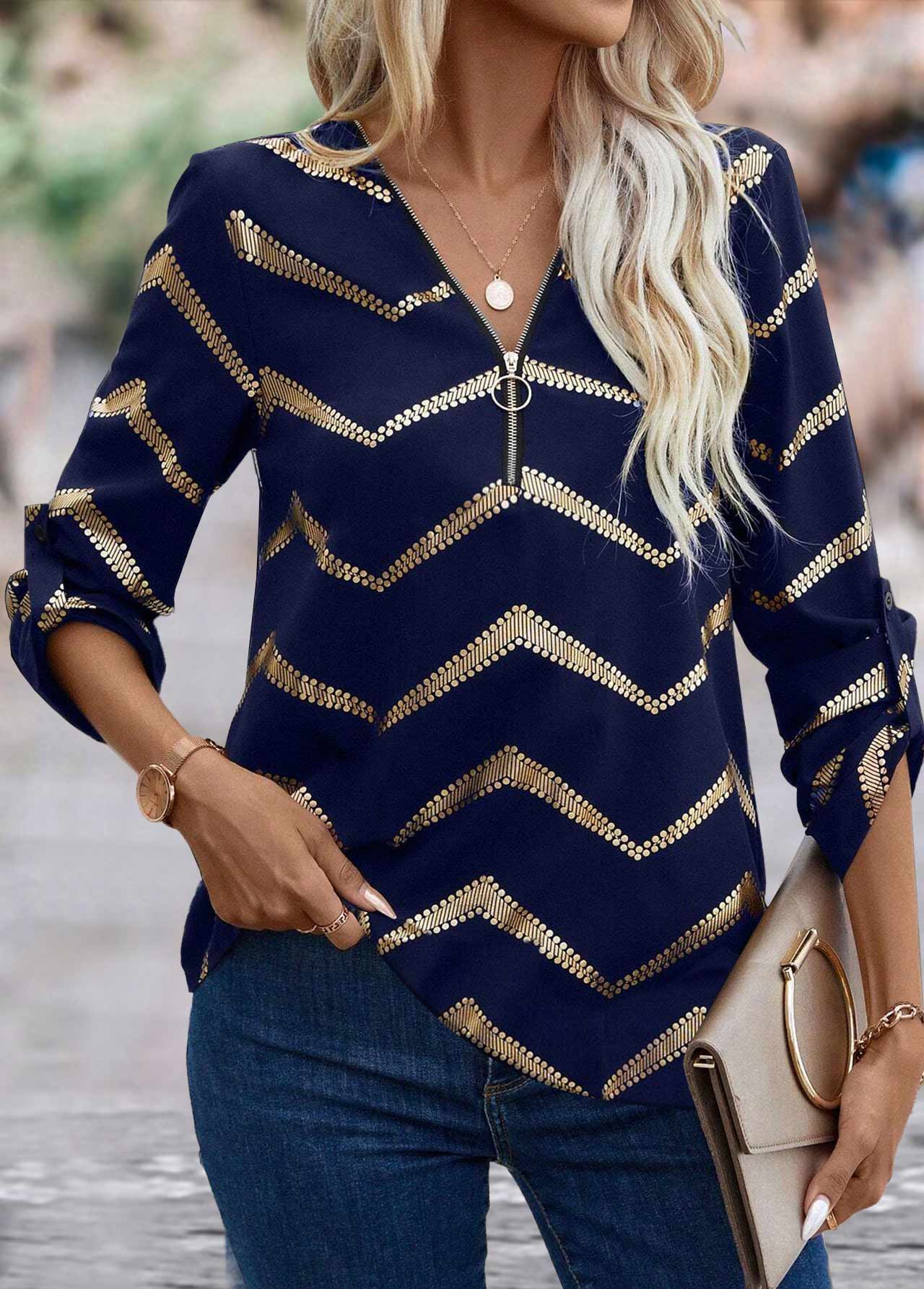 SALE Geometric Print Hot Stamping Navy Long Sleeve Blouse Rosewe®
