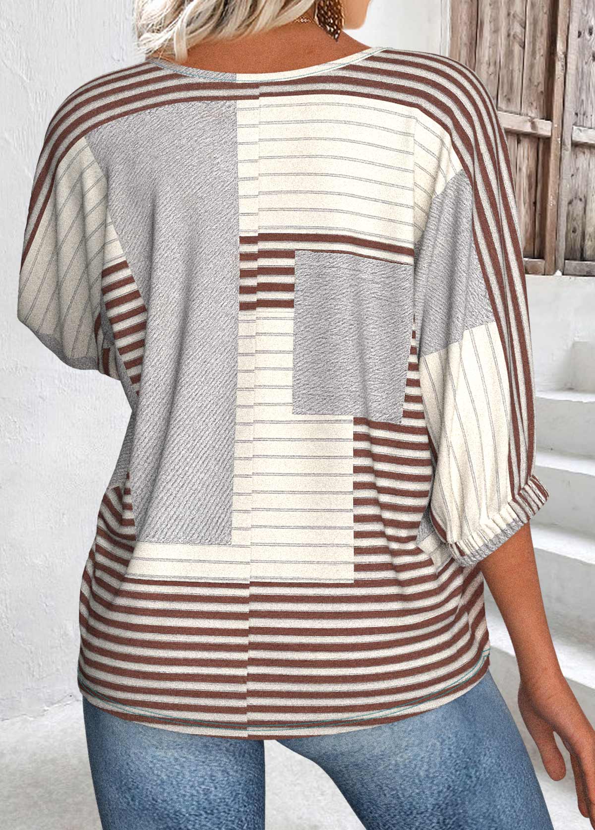 SALE Geometric Print Light Coffee 3/4 Sleeve Round Neck Blouse Rosewe®