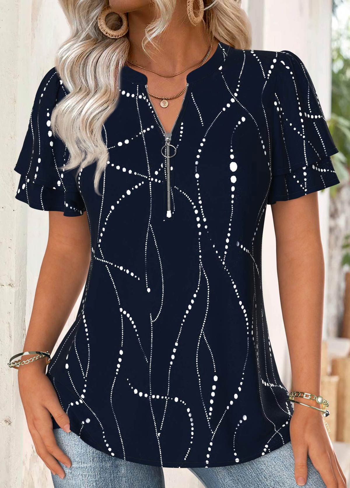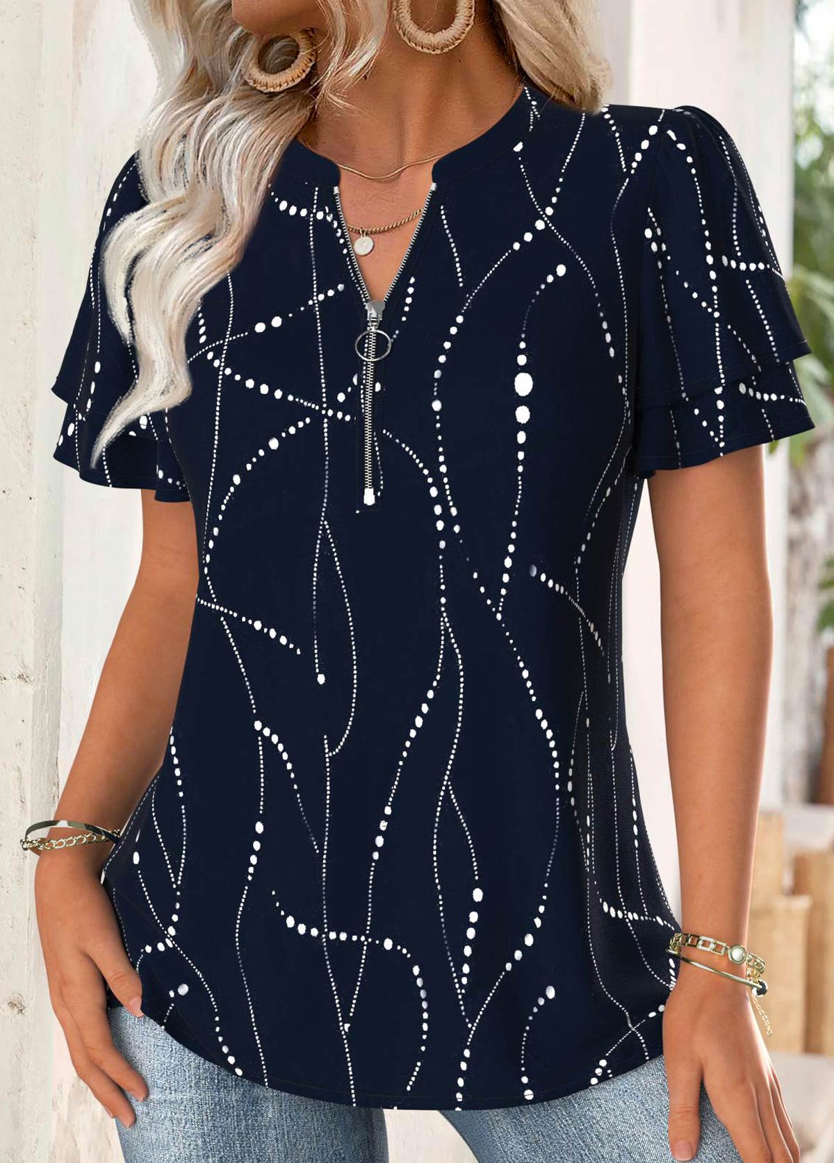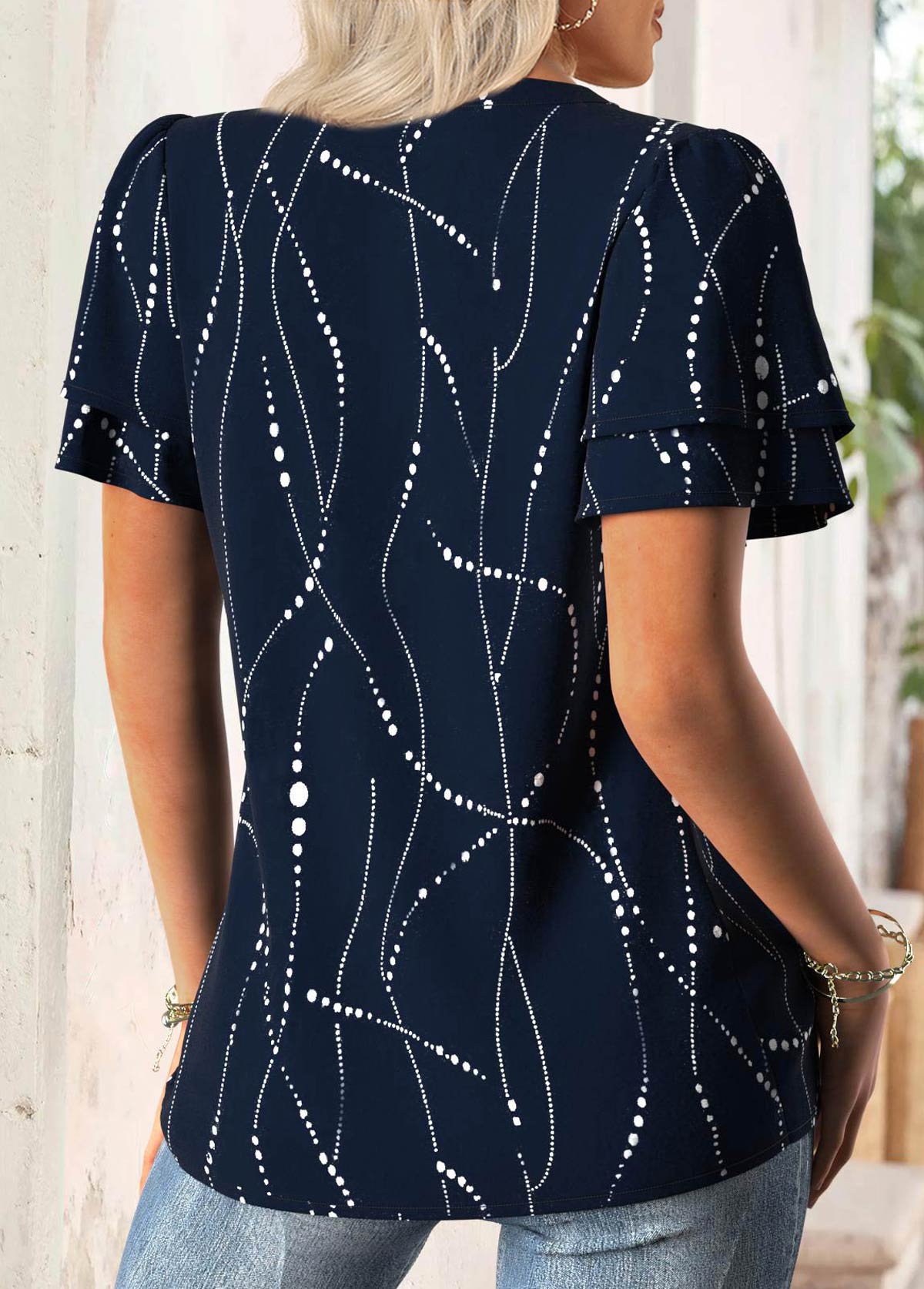 Geometric Print Navy Short Sleeve Split Neck Blouse Rosewe®
