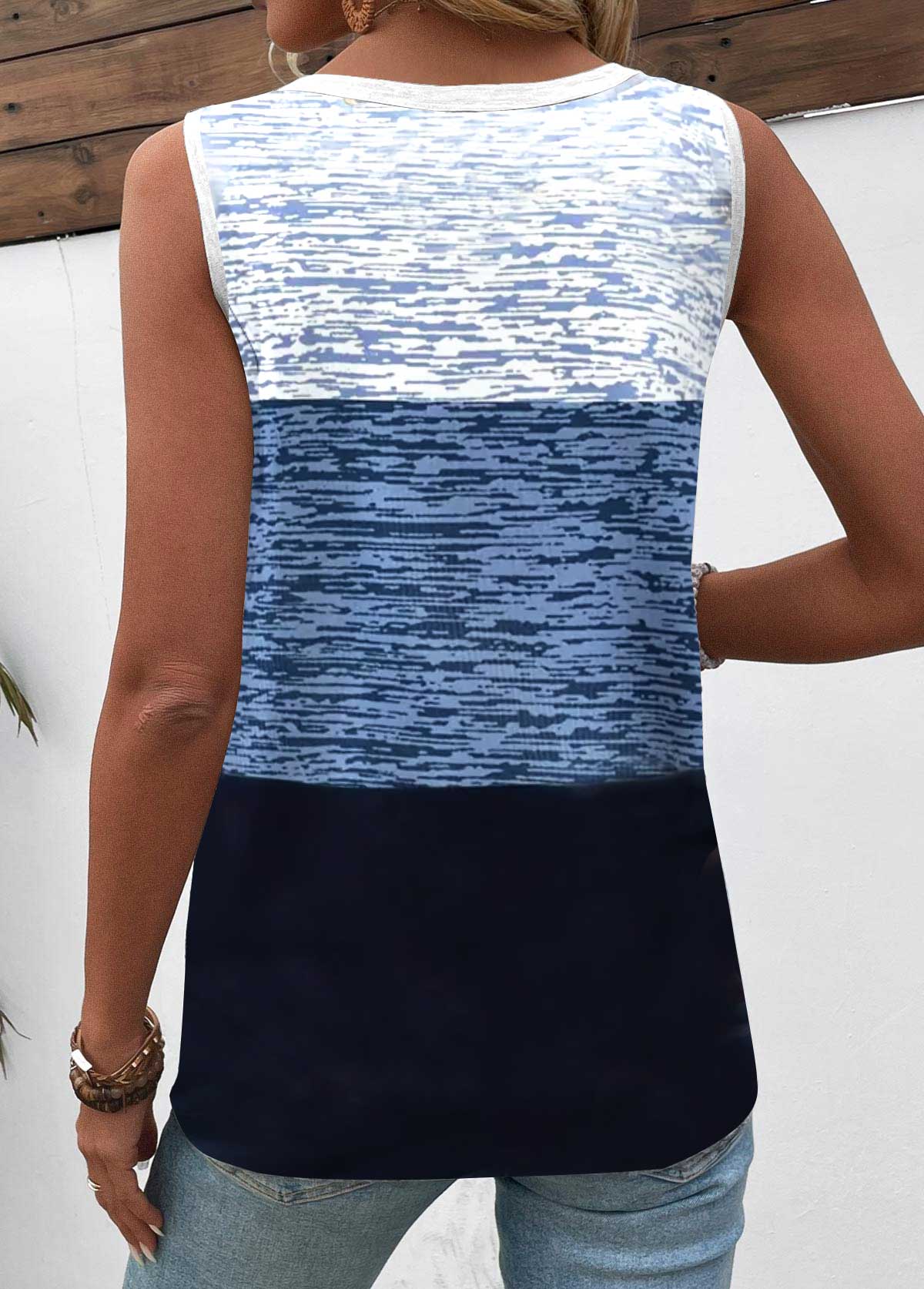 SALE Geometric Print Patchwork Blue Sleeveless Round Neck Tank Top Rosewe®