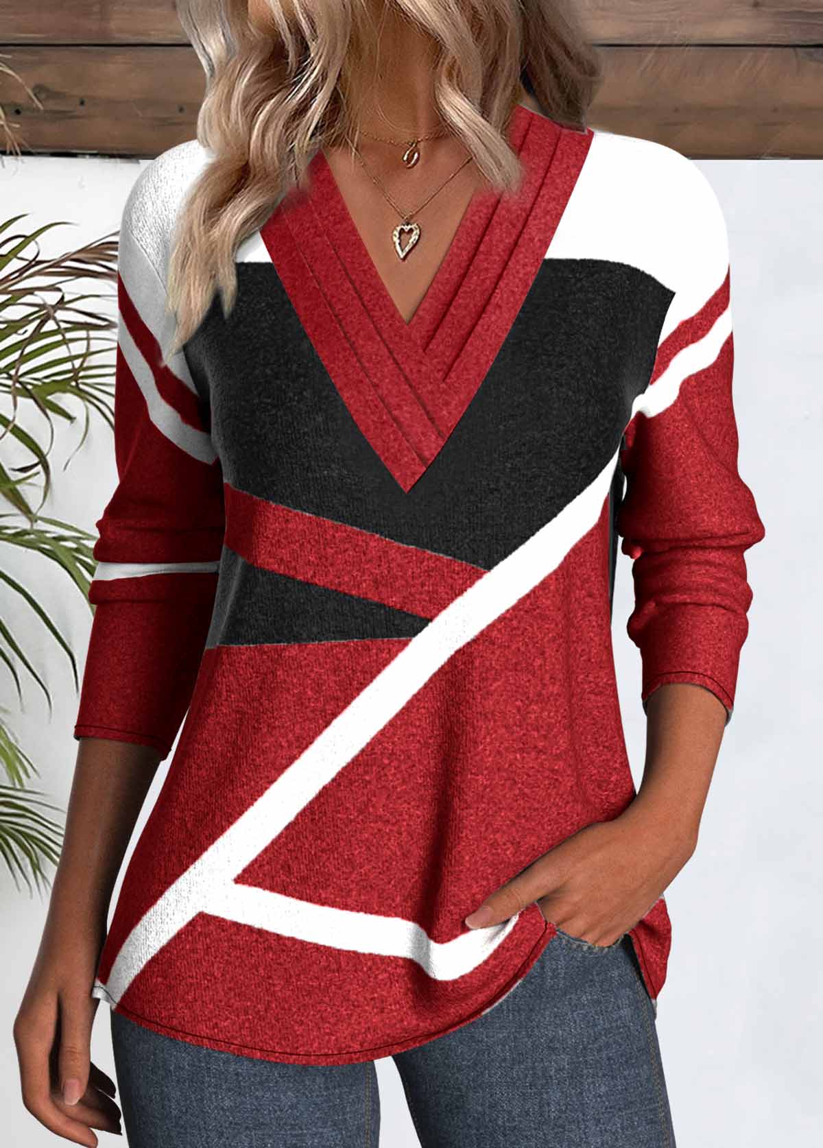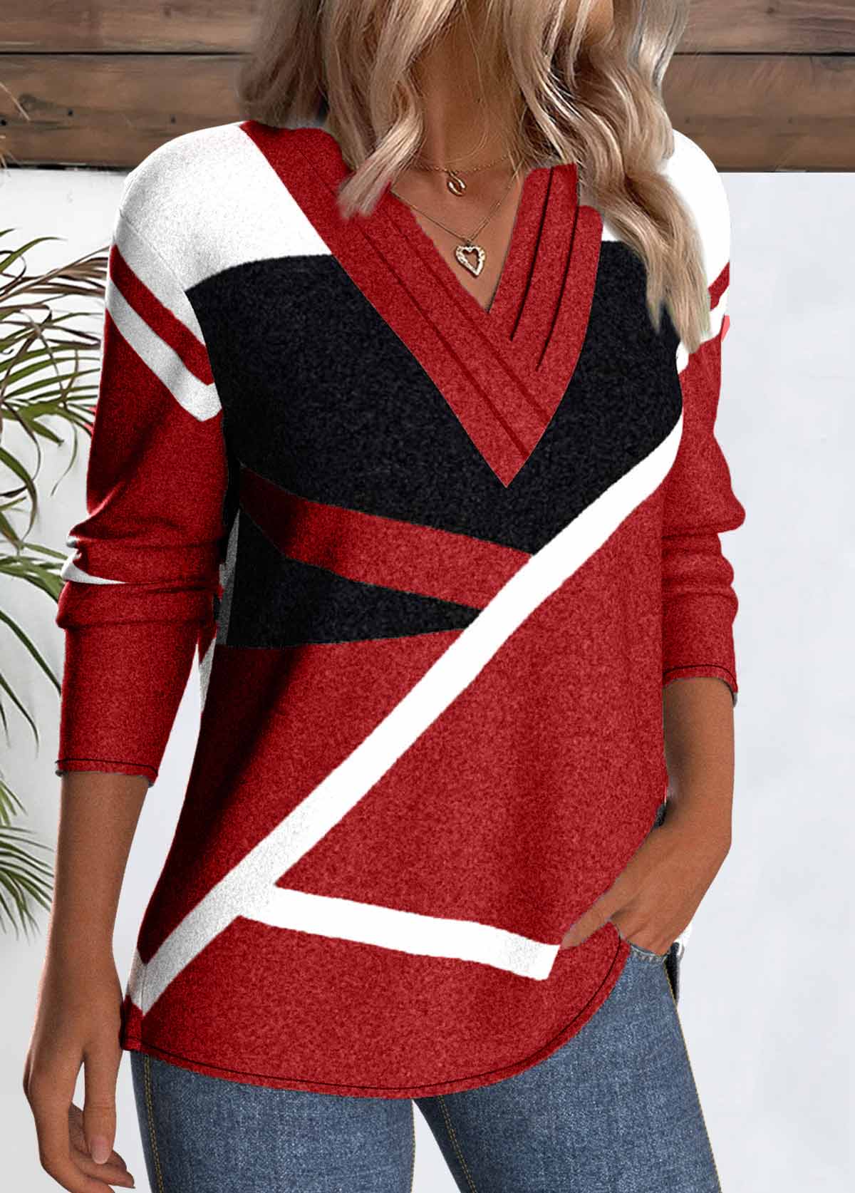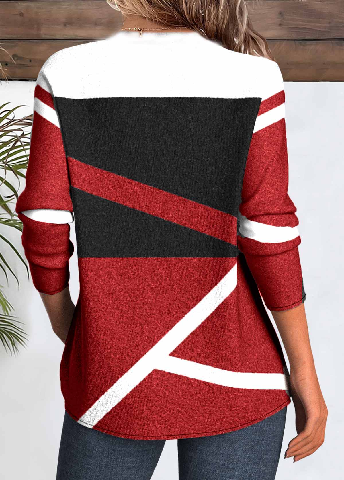 SALE Geometric Print Patchwork Red Long Sleeve T Shirt Rosewe®