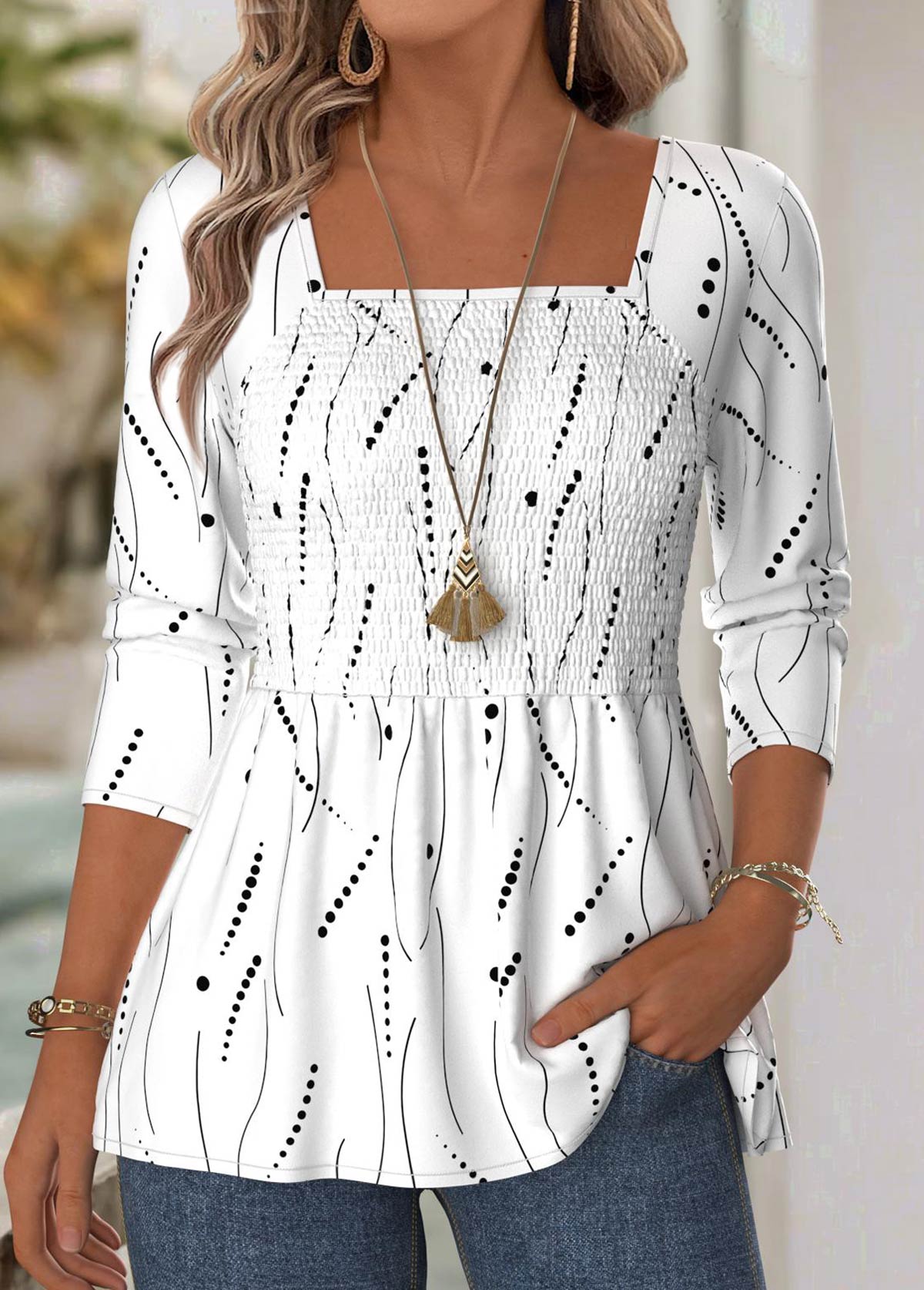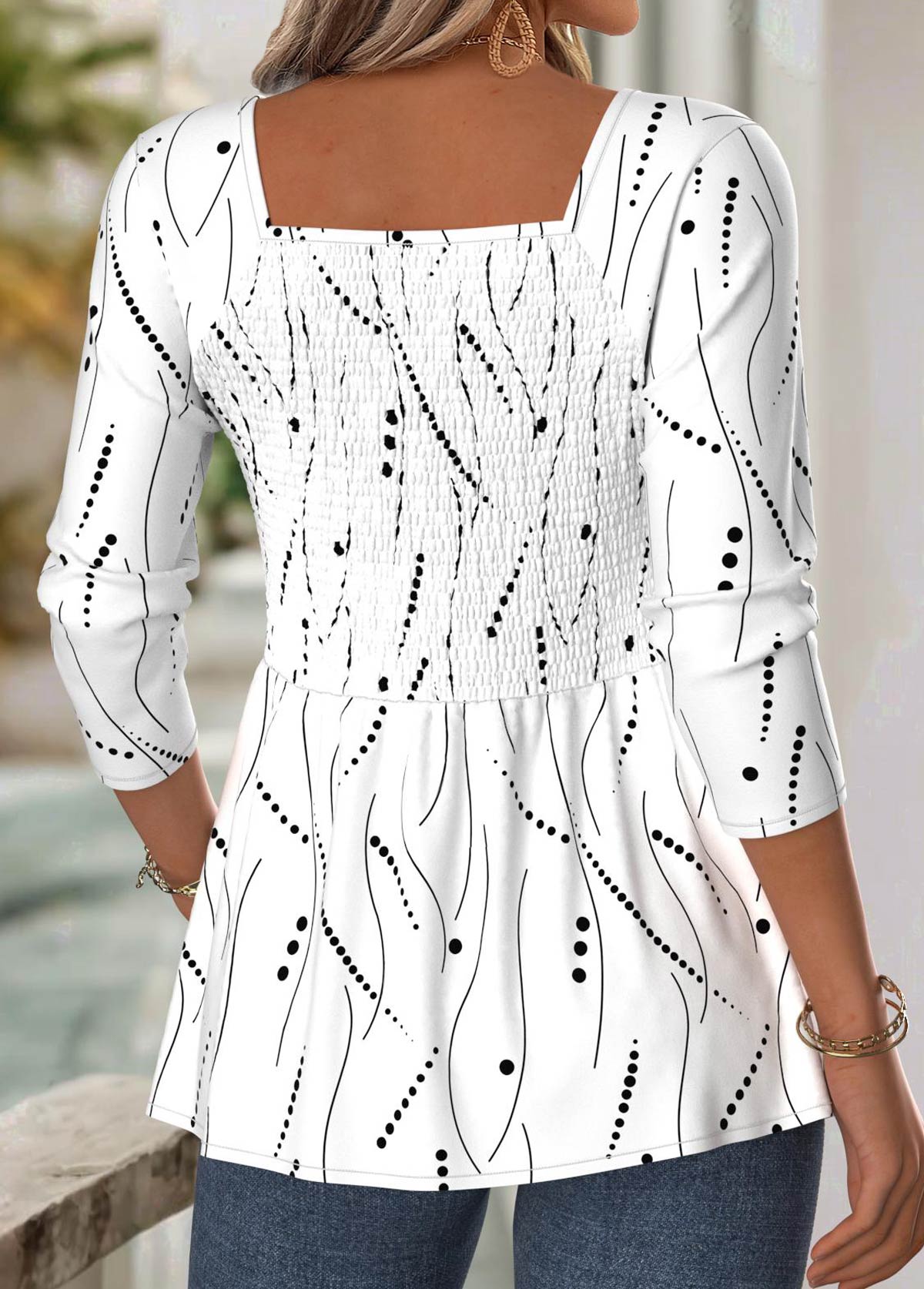 Geometric Print White Long Sleeve Square Neck Blouse Rosewe®